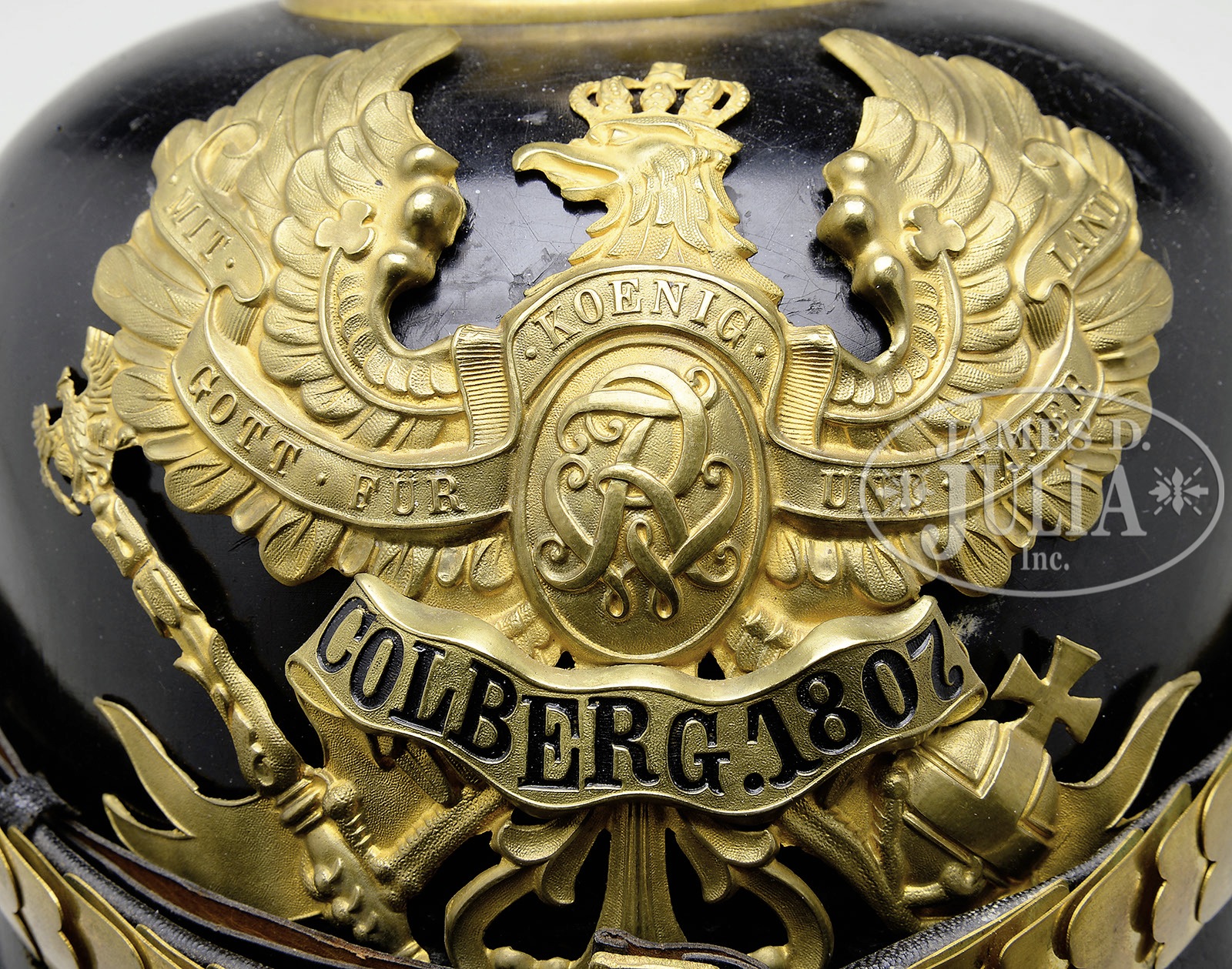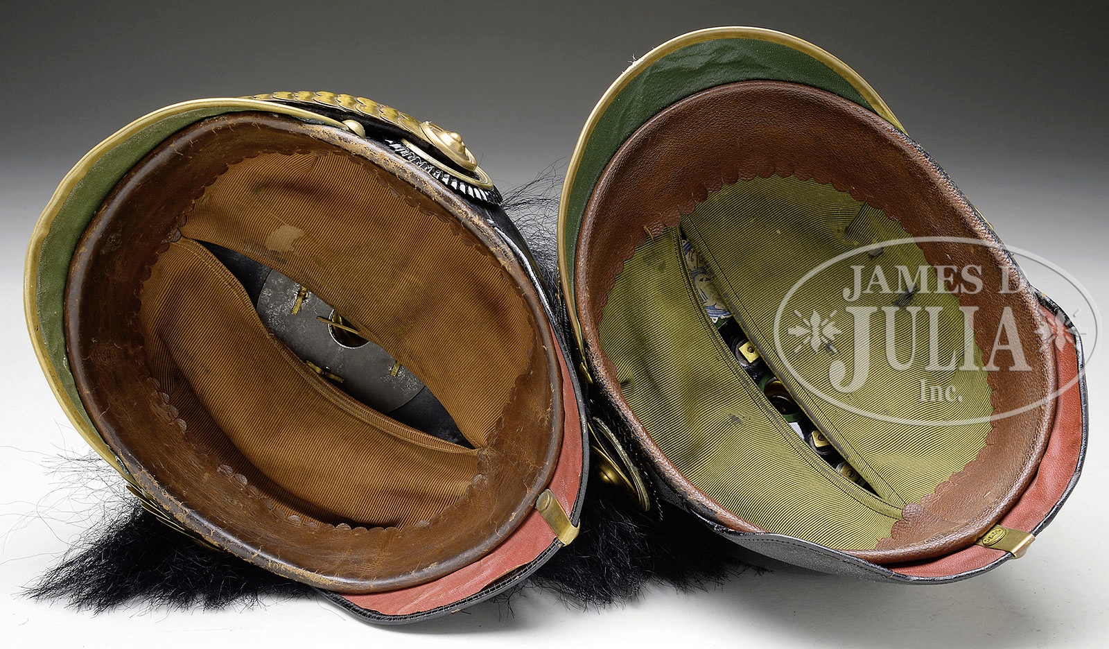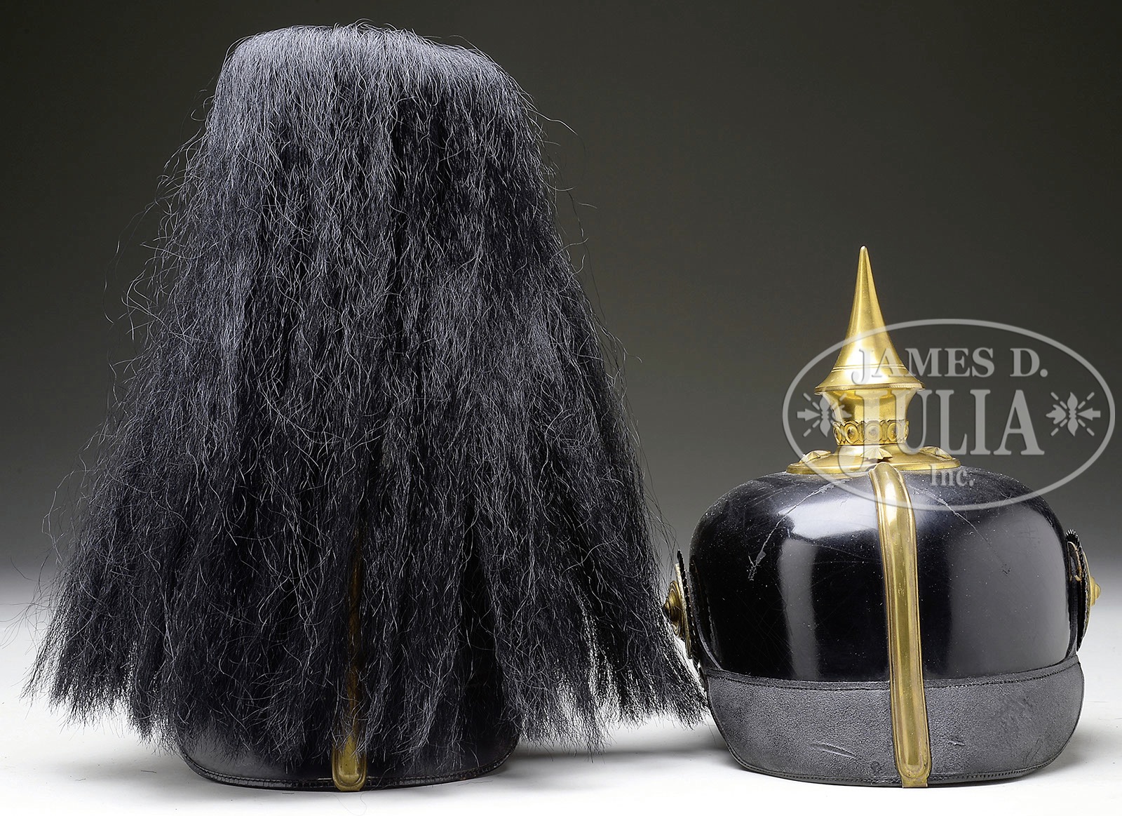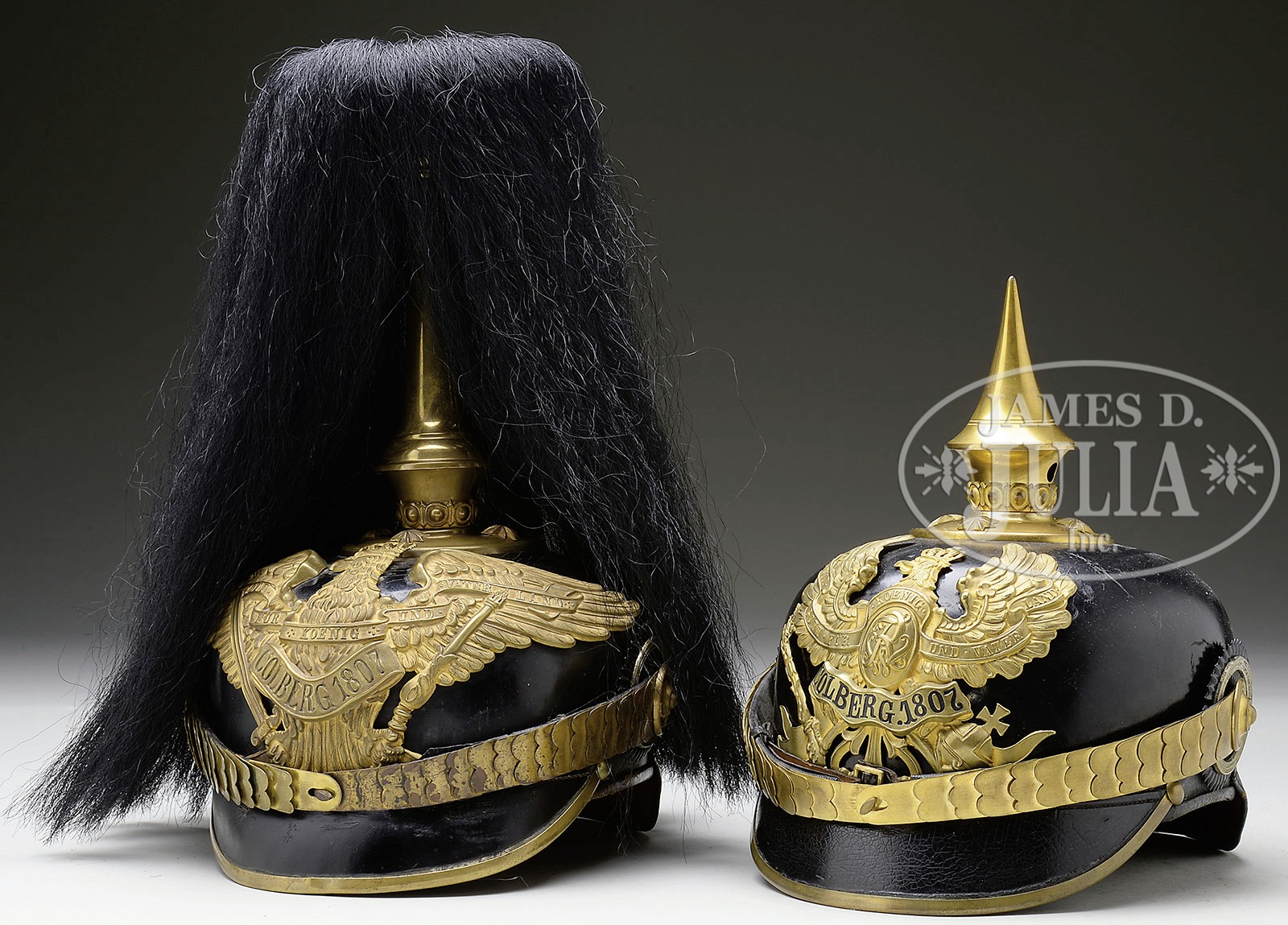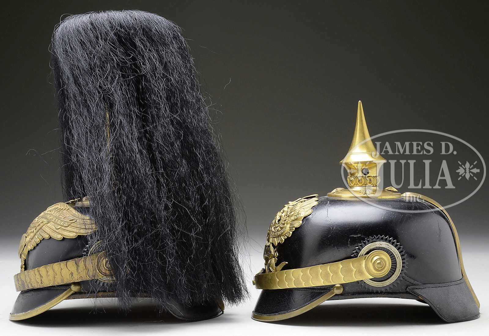 TWO PRUSSIAN 9TH GRENADIER OFFICER’S HELMETS.1) Prussian 9th Grenadier Regiment post frontplate change of June 16, 1913. Black fiber body with gilt trim. Helmet body has excellent form and fine stitching. Sweat leather and silk head liner. Visors colored. No extra holes in body. Exterior shows bright finish with mild spidering over entire body. Back visor perfect. Front visor shows scratching where chin scales have rubbed against surface. Metal trim has overall heavy patina. Round base and smooth spike. Frontplate retains much of fire gilding but has turned a brownish gold color with age. Colberg banner has lost much of its black lettering due to age. Flat chin scales show oxidation. Complete with officer Reichs and Prussian cockades. With black yak parade plume. 2) Prussian 9th Grenadier Regiment pre frontplate change of June 16, 1913. Black lacquered felt body with gilt trim. Helmet body has excellent form and fine stitching. Interior sweat leather and silk head liner. Visors colored. No extra holes in body. Maker stamped on inside “Awes Marke”. Helmet body has bright finish with only small scratches from use on back of helmet. Visors lightly crazed from age. Metal trim retains bright gilt finish. Round base with smooth spike. Frontplate retains 75% of fire gilding. Colberg banner nicely blackened to show lettering. Flat chin scales with officer Reichs and Prussian cockade. Nice matching set of Grenadier Officer’s helmets. PROVENANCE: Robert H. Haskell, III Estate Collection. CONDITION: 1) Very fine condition throughout. Overall helmet shows heavy use and age oxidation. All metal trim and frontplate attached to helmet body with split brad retainers. Frontplate has excellent detail but has darkened with age. Slight distortion of helmet body in back revealing gap between body and rear metal spine. Interior shows heavy use with discoloration to sweat leather and silk head liner. Small tearing at edge of silk head liner exposing reed retainer. Inner visors have bubbling under colored paper. Very rare helmet. Probably a WWI era production but is not a zinc helmet. Plume in excellent condition. 2) Excellent condition with bright metal trim and polished appearance of black fiber. Helmet body has two light scratches that have caused a small dent in back spine. Otherwise finish is near perfect. Shorter style officer’s spike as was used in the pre-1900 era. Interior shows mild wear with small tears to silk head liner. Slight turning in of rear visor due to age. 4-50221-34 RT35 (3,000-4,000) – Lot 3290