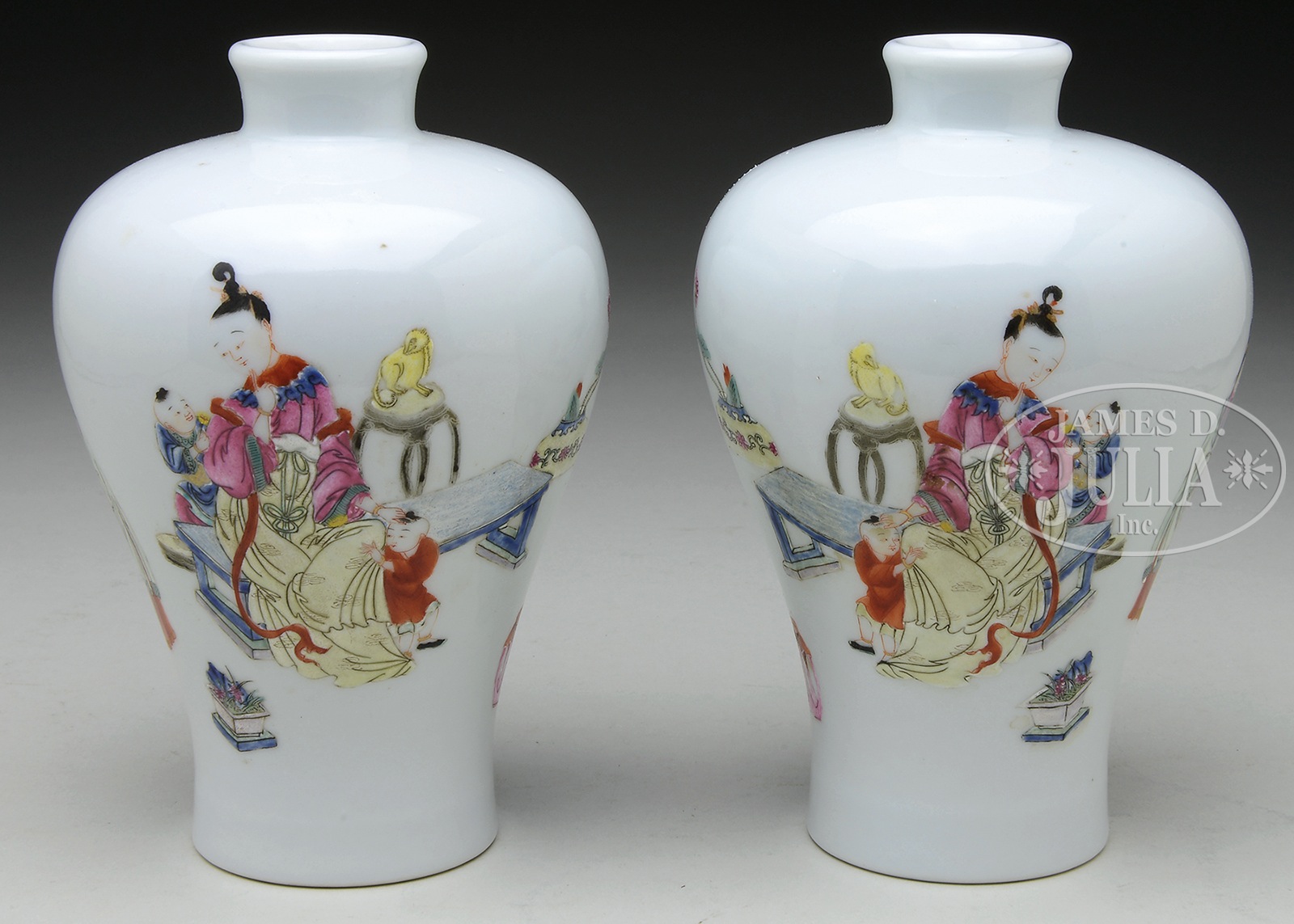 PAIR OF FAMILLE ROSE VASES.19th/20th Century, China. Pair of vases depicting mother and children in an outdoor setting, bottom bears six character “YONGZHENG” mark. SIZE: H: 5-7/8 in (15cm) D: 3-7/8 in (9.9cm). CONDITION: Good. 9-96984 (1,000-2,000) – Lot 3290