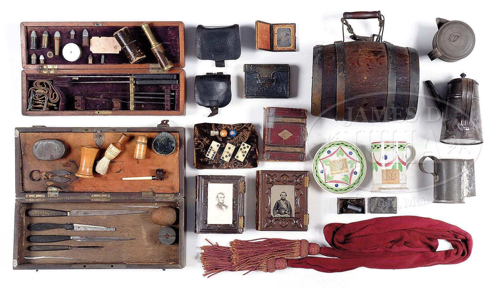 MASSIVE GROUPING OF MUSEUM DISPLAYED CIVIL WAR AND COLUMBUS HISTORY ARTIFACTS AND EPHEMERA.SN NSN. This wonderful diverse grouping comprises various displayed items from the Greene Museum of Southern History. If you pick through the orig pictures taken in museum you can find most all of these items on the walls or in display cases that helped tell the story of the history of Columbus, GA especially during the Civil War. Many personal items are included in this group including 1) a hand sewn Civil War housewife of private C.H. Estes, a wartime CT button has been turned into a pin contained within. 2, 3 & 4) Three telescopes one being small personal one still contained in cardboard sleeve, a rare pair of twin telescopes marked “QUINN & CO PHILADELPHIA” these measure over 15″ fully extended with main lenses being 1-1/2″; lastly is a two stage telescope measuring just over 30″ extended which is inscribed “LT.S.W. NICHOLS 1862 USN”. Inscription appears commemorative and not contemporary to the war, however telescope has lead soldered repair and lacks leather cover. 5 & 6) Two surgical kits, one being English and a 2-tier amputation kit still retaining large saw, 2 lg knives, tourniquet and three other small tools. The other surgical kit is missing compartmentalization on bottom compartment, has three knives and small saw marked “CHARRIERE” also contained is a circular multi-bladed fleam marked “BREVETE S.G.D. GOLVERNEMt”. This second kit has name engraved on top brass plaque “DR. ELLISON”. Tools in both kits are rusted with some orig polish and at least one broken handle. 7) Small leather case with eight small medicine bottles all with full or partial labels of druggist in Petersburg or Richmond VA. Case has no top and one handle is loose, several bottles are chipped but rare Southern labels are mostly intact as can be seen in photos. 8) Regulation Civil War silk officers sash. 9 & 10) 2-pcs decorated china with registry numbers found on the Confederate Blockade runner “GEORGIANA”. Saucer appears complete with no chips, large mug has large base chip and glued repairs. 11) South Carolina Secession badge woven from palm frond mounted with pin in the shape of a palmetto tree on 4-1/2″ x 2-1/2″ pc of cotton with indiscernible text. Thread used to sew this device is consistent with the early Civil War and this appears to be an orig piece circa 1861 as opposed to a reunion item. 12) Deck of patriotic Union Civil War playing cards with eagles, shields, stars, flags, Goddess of Liberty and soldiers in place of suits and ranks of cards. There are only 50 cards remaining but there is a partial card case. Cards are obviously well used but still retain good color and detail and several are chipped and bent and box is insect damaged. 13) Fancy circa 1850 military stirrup with eagle rosettes with tag which reads, “GEN. BURNSIDES COMMAND US STAFF OFFICERS STIRRUP LOOKOUT MTN TENN”. 14) Folding camp chair. 15) Framed drawings of soldiers, one of a charging “rush lancer”. 16)Two wartime pencil drawings, one of a Confederate Captain sitting in front of a tent smoking a pipe with artillery in the background signed by artist April 4, 1865, an additional partial pasted typed tag gives partial ID. The other drawing of camp scene in woods with soldier on picket. 17 & 18) Two Civil War manuals one being 1861 NY edition of Rifles and Rifle Practice by C.M. Wilcox, US Army. Wilcox appears complete with several large folding plates though book was not collated. Second manual is a Confederate imprint Calvary Tactics by Major General Joseph Wheeler, Mobile 1863. This volume too appears complete with foldout plates though end papers are missing and no doubt used by Confederate in need of paper that was so rare in the Confederacy. Bindings on both books are mostly complete with chipping on spines, cracked hinges and other reductions. Both these manuals appear well used during the war. 19) Navy battle rattle. 20) 6″ stamped brass patriotic plaque of Goddess of Liberty. 21, 22 & 23) Three pieces of camp tin ware including coffee pot and small personal cooker with lid. 24) Group of toys soldiers used in camp including a pair of dice, dominoes and clay marbles. 25) Group of soldiers personal items including ink well inclosed in wooden case, folding pewter shaving mirror, shaving brush and tin soap container. 26 & 27) Cigar cutter and small carved pipe with a soldiers head as the bowl with glass eyes. 28, 29 & 30) Three bullet molds one being for Colt pistol and so marked. 31 & 32) Two brass powder flasks, one is USN marked with anchor dated and inspected “AMES, 1843” missing spring. Other flask is florally decorated marked “BATTIE PATENT”. 33) Frame showing Columbus Georgia maker or agent marked watch mechanism and dial and an excavated Columbus maker marked 4-screw button. 34, 35, 36, 37) Four Civil War era canteens including two regulation US style both with partial covers and slings, a small canvas covered flask with a pewter screw top with cloth sling which was marked as Confederate in the museum and a large barrel type canteen with bale handle measuring about 10″ x 7″. 38, 39, 40, 41, 42, 43, 44 & 45) Group of Civil War era photography including 4 CDV albums which contain mostly civilians though there are a few soldiers scattered and a CDV of Abraham Lincoln. There is a large oval framed paper image of a US Drummer with painted eagle drum which is about 18″ high. There is also an image framed of a soldier with rifle and bayonet that has been tinted and colored, a ninth plate ferrotype of a Confederate enlisted man wearing a shell jacket and a loose 6-plate tin type that is quite sharp showing Union Calvary men seated with sword belt, carbine sling and carbine. 46 & 47) Two Civil War accoutrements boxes one being US cap box, the other being a fuse box marked “NAVY YARD NY 1861”. 48) Orig Confederate buck and ball cartridge with photograph of orig box and pack it