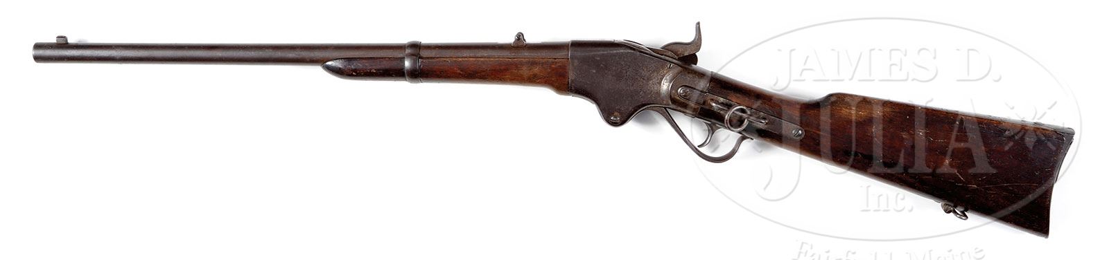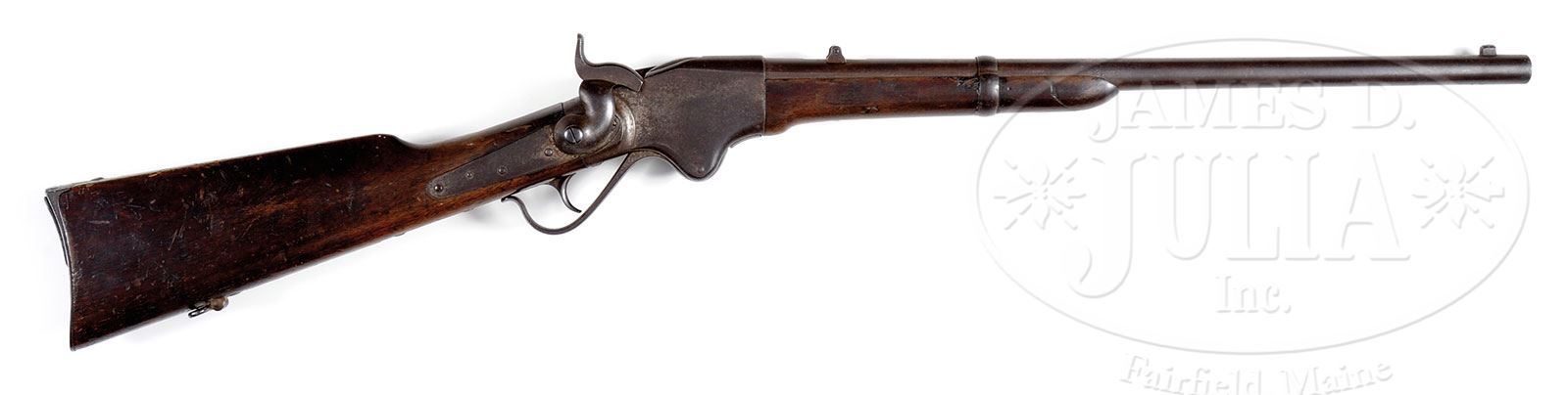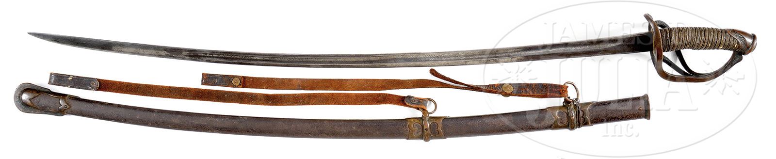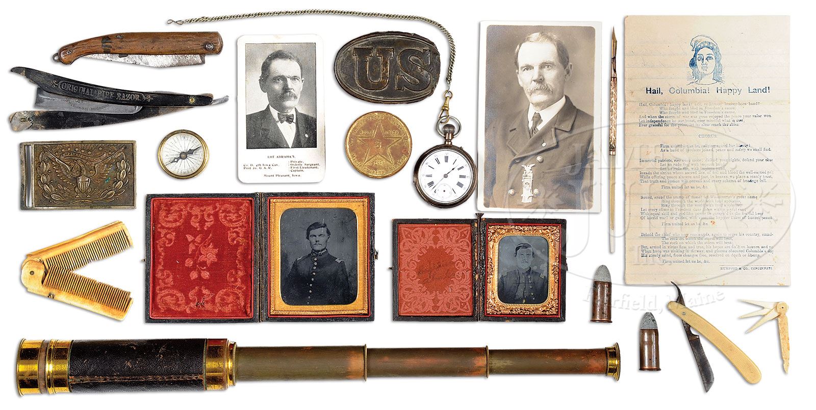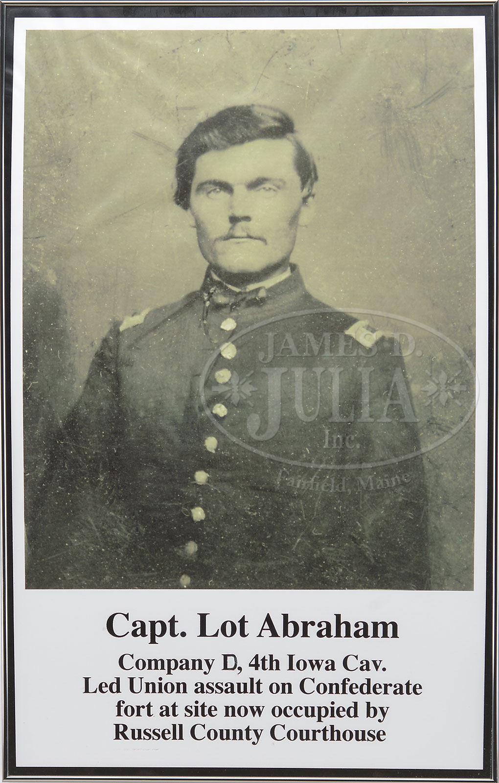 Please note: The toothpick is missing from the lot. ARCHIVE OF LOT ABRAHAM 4TH IOWA CAVALRY WHO COMMANDED LAST UNION ASSAULT OF THE CIVIL WAR ON CONFEDERATE FORT, APRIL 16, 1865 TO CAPTURE COLUMBUS, GEORGIA.SN 28591. This is a wonderful archive that had great meaning to the Greene Museum as Capt. Abraham commanded the 4th Iowa fully a week after Lee’s surrender to capture Columbus, GA on the exact site of the Greene Museum. This lot includes his Spencer carbine, hid Cavalry Officer’s saber, many photographs and personal items. Lot Abraham, Co. D, 4th Iowa Cavalry was a veteran of many campaigns coming into the last Union victory of the war in Georgia & Alabama. He originally entered service in Sept of 1861 as a Sergeant, he was promoted to Lt. July 1, 1862 and finally to Capt. in January, 1863. He was frequently in command of his battalion and often his regiment. According to the official records Abraham was recommended for brevet promotion for gallantry at Selma, AL and Columbus, GA by his commanding officer. Included in this grouping is his Spencer carbine which was unusual for officers to carry but many western Cavalry officers were known to fight along side their men with carbines. This is an early manufactured carbine SN 28591 in fine “as found” condition. His Cavalry Officers saber is made by Sauerbier of Newark, NJ and has distinct features of this manufacturer including spanner nut pommel attachment and pen knife type blade with unstopped fuller often confused as Confederate manufacture. Blade exhibits 20″ etched patriotic panels on either side. This higher grade sword has shark skin grip wrap, decorated hilt and relief mounted scabbard. His belt plate which is a standard Model 1851 with eagle has his initials and unit scratched onto hook in back. There is a fine 4-stage field telescope which measures about 17″ extended with a 1-1/4″ main lens in excellent condition retaining its orig leather cover, both lens protectors and tarred canvas case. Optics are excellent. Also in this group is a silver pocket watch, pocket knife, two razors, a cased writing pen with mother of pearl tip and gilded brass body with a gold nib along with another portion of a pen with same mother of pearl end and letter written by Abraham on Christmas Eve, 1862 on patriotic stationary. There are two tin types of Abraham in uniform, one as Capt. and another in a different uniform either as Capt. or Lt. There are several photos of Lot postwar wearing reunion & GAR badges. There is a folding carved bone comb, a small carved 3-bladed folding ivory toothpick. There is a 1-1/2″ dia compass, an enlisted US belt buckle that appears like an early battlefield pickup, possibly found by Abraham at a reunion on a visited battlefield. There are two orig Spencer cartridges and misc. post-war photographs of him and his family along with other family members. Abraham’s family donated most of Lot Abraham’s wartime letters, diaries and documents to the University of Iowa Library in 1962. This wonderful, historical archive of a hard fighting Union Cavalryman in the western theatre of war will probably never be duplicated. Abraham’s diary accounts of these last battles should be read. PROVENANCE: Lot Abraham (1838-1920). John Gilbert Abraham (1866-1944). Fred Barger Abraham (1891-1965). Howard John Abraham (1918-1994). Mrs. Cecil Henrietta Carnahan-Abraham. Greene Museum of Southern History. CONDITION: Spencer carbine is very good overall appearing “as found” with gray metal, crisp markings good bore with discernible rifling and pitting. Gun is missing blades of rear sight though base still intact. Stocks are sound and solid with a hair line crack extending about 3″ from carbine bar just above a discernible inspector’s cartouche. Stocks exhibit numerous small scratches, dents and dings with hand worn patina. Saber is very good overall. Blade is gray with some areas of orig luster and etched panels are mostly discernible, scattered areas of staining and pitting. A few small nicks in cutting edge from use. Scabbard is sound and solid. Iron body retains traces of org finish with pitting. Brass mounts and hilt have rich red/chocolate colored patina. Sharks skin grip is worn and chipped at high areas thought mostly intact with orig twisted brass wire. Top ring mount is worn through and two later sword belt straps have been added for display purposes. Other items in this grouping are very good to fine as described. 4-53743 JS300 (10,000-20,000) – Lot 3296 Click here to view provenance
