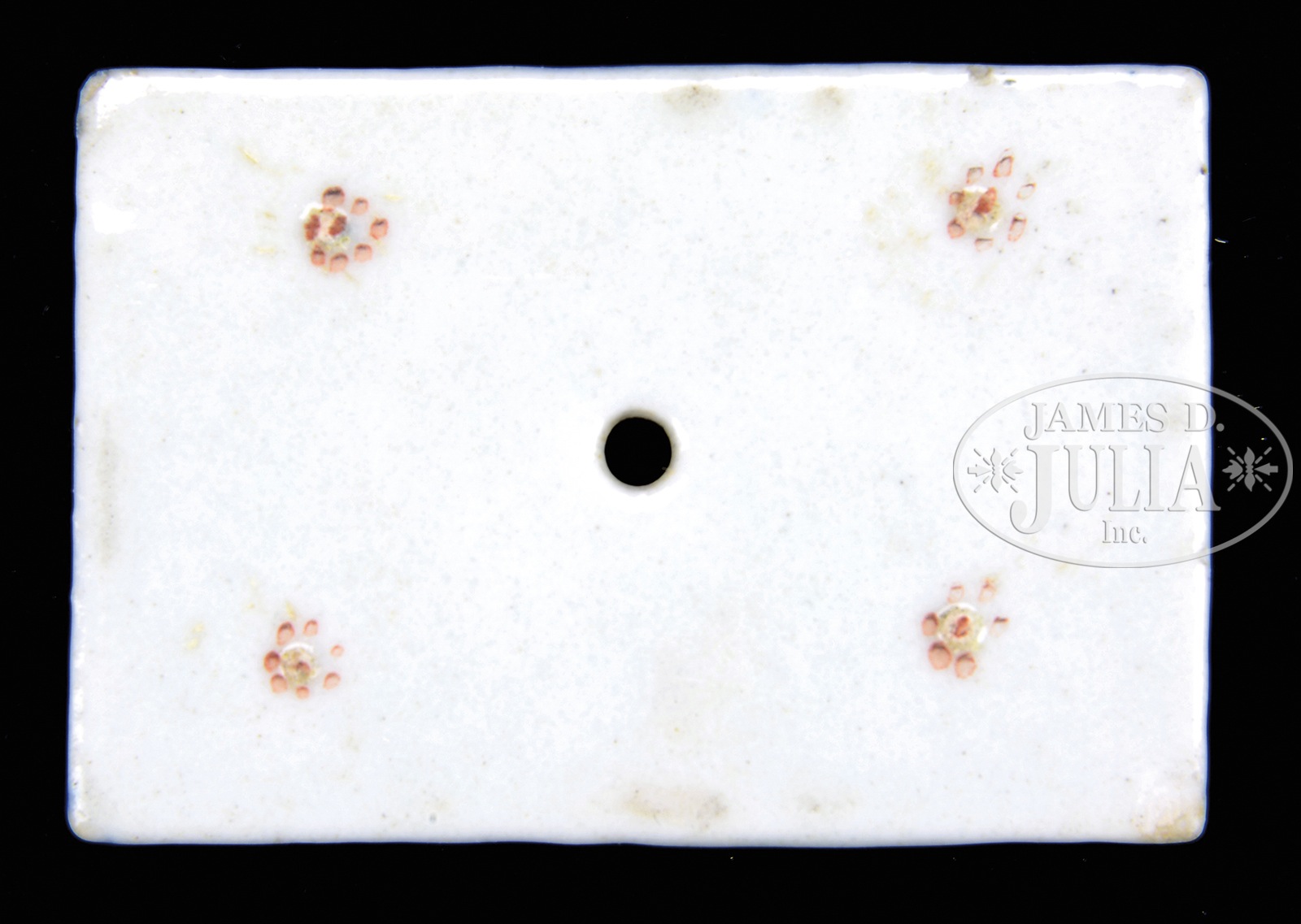 MINIATURE BLUE, WHITE AND FAMILLE ROSE BOOK AND BRUSH STAND.Mid-19th century, China. Each decorated with small figures on a scrolling lotus and cloud ground. SIZE: Longest: 3-1/4″ l. CONDITION: Two minute chips to corner of book. Stand good. 50080-10 (300-500) – Lot 3296