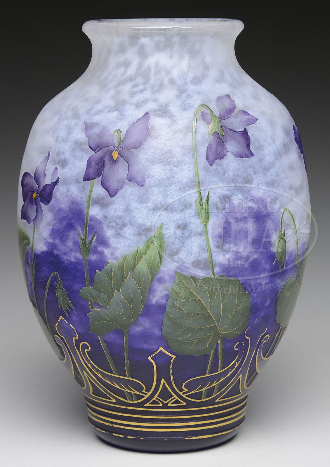 DAUM CAMEO AND ENAMEL VASE.Daum vase has cameo violet flowers, stems and leaves set against a mottled background of purple shading to cream. The vase is further decorated with a band of scrolls and leaves around the bottom with cameo bands encircling the foot. The bottom decoration is further enhanced by gilded outlines. Signed on the underside with lightly etched signature “Daum Nancy” with the cross of Lorraine. SIZE: 6-1/2″ t. PROVENANCE: Private New England Collection. CONDITION: Very good with one small flake to a flower petal and some wear to gilding on foot. 5-69298 (2,500-3,500) – Lot 3297