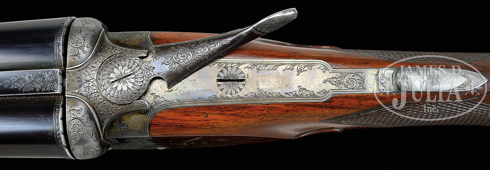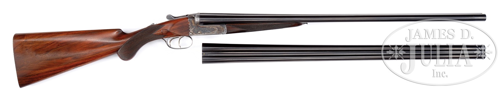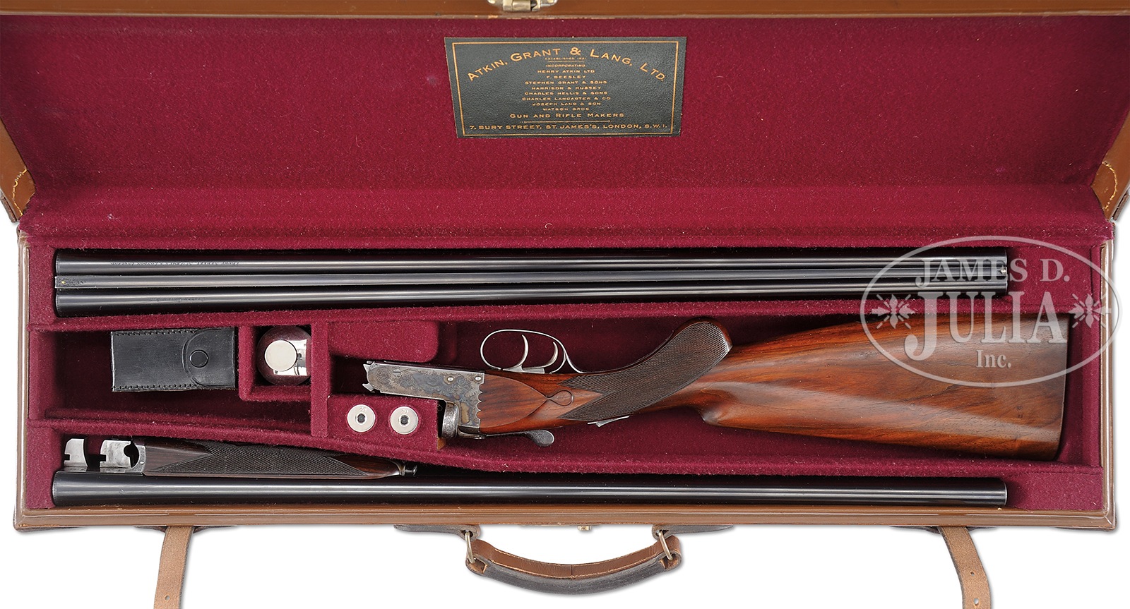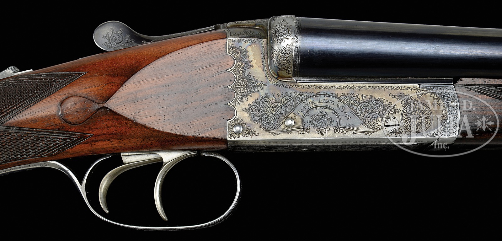 *JOSEPH LANG BOXLOCK EJECTOR LIGHT GAME GUN WITH EXTRA BARRELS AND CASE.SN 20830. Cal. 20 Bore. 2-3/4″ Chambers. 26″ Barrels. Tight choke bbls with gold inlaid star at breech end, as well as, open choke bbls are engraved “Joseph Lang & Son.” and “7, Bury Street, St. James’s, London. England.” on tops. Concave game ribs have scroll engraving at breech ends. Bottoms of bbls are engraved with SN. Bbl flats have London nitro proofs for 2-3/4″ chambers. Case hardened scalloped back boxlock action has 70% coverage English scroll with “Joseph Lang & Son” in arched ribands on either side. Action features double triggers, and automatic safety with “SAFE” inlaid in gold. Blued floorplate and trigger guard have scroll engraving. “Joseph Lang & Son” is on floorplate, and SN is at grip of trigger guard. Lightly marbled European walnut semi-pistol grip buttstock measures 15-1/4″ over checkered wood butt. There is a silver oval on toe line with initials “F.M.W.” Stock features nicely shaped drop points and 20 LPI point pattern flat top checkering with mullered borders. Matching splinter forend has Anson release, and SN on iron. Gold Star (Tight choke) bbls: Bore diameter: left -.614, right -.614. Bore restrictions: left -.030 (FULL), right -.024 (mod). Wall thickness: left -.028, right -.031. Drop at heel: 1-7/8″, drop at comb: 1-7/16″. Weight: 5 lbs. 10 oz, LOP 15-1/4″. Open choke bbls: Bore diameter: left -.613, right -.613. Bore restrictions: left -.016 (mod), right -.006 (IC). Wall thickness: left -.025, right -.030. Drop at heel: 1-7/8″, drop at comb: 1-7/16″. Weight: 5 lbs. 9 oz, LOP 15-1/4″. Origl makers leather VC case with stitched leather corners and sliding button latch is lined in maroon cloth with gold embossed dark green leather Atkin, Grant, and Lang label. Accessories include 2-pc rosewood and brass cleaning rod, brushes, and a pair of snap caps. PROVENANCE: Correspondence from Atkin Grant and Lang for various dates 1969 – 1970, detailing ordering and delivery of this gun.. CONDITION: Excellent. Bbls retain nearly all of their orig blue, thinning a bit above forend, and silvering at muzzles. Action retains 50-60% of orig case color, silvered on fences and at bottom. Floorplate and trigger guard have silvered to about 30% blue. Top lever is silvered at thumbpiece. Stocks retain nearly all their orig finish with a few marks and dings from handling and use, one or two fairly deep on left cheek of stock. Action is tight and on face with both sets of bbls. Ejectors are in time. Bores are excellent with no visible imperfections. Case leather has a number of marks and scuffs, but is generally fine. Straps and handle are excellent. Interior cloth is excellent with a few marks from contact with gun. Label is excellent. All partitions are tight. 50618-1 (4,500-6,500) C&R – Lot 3297 Click here to view provenance