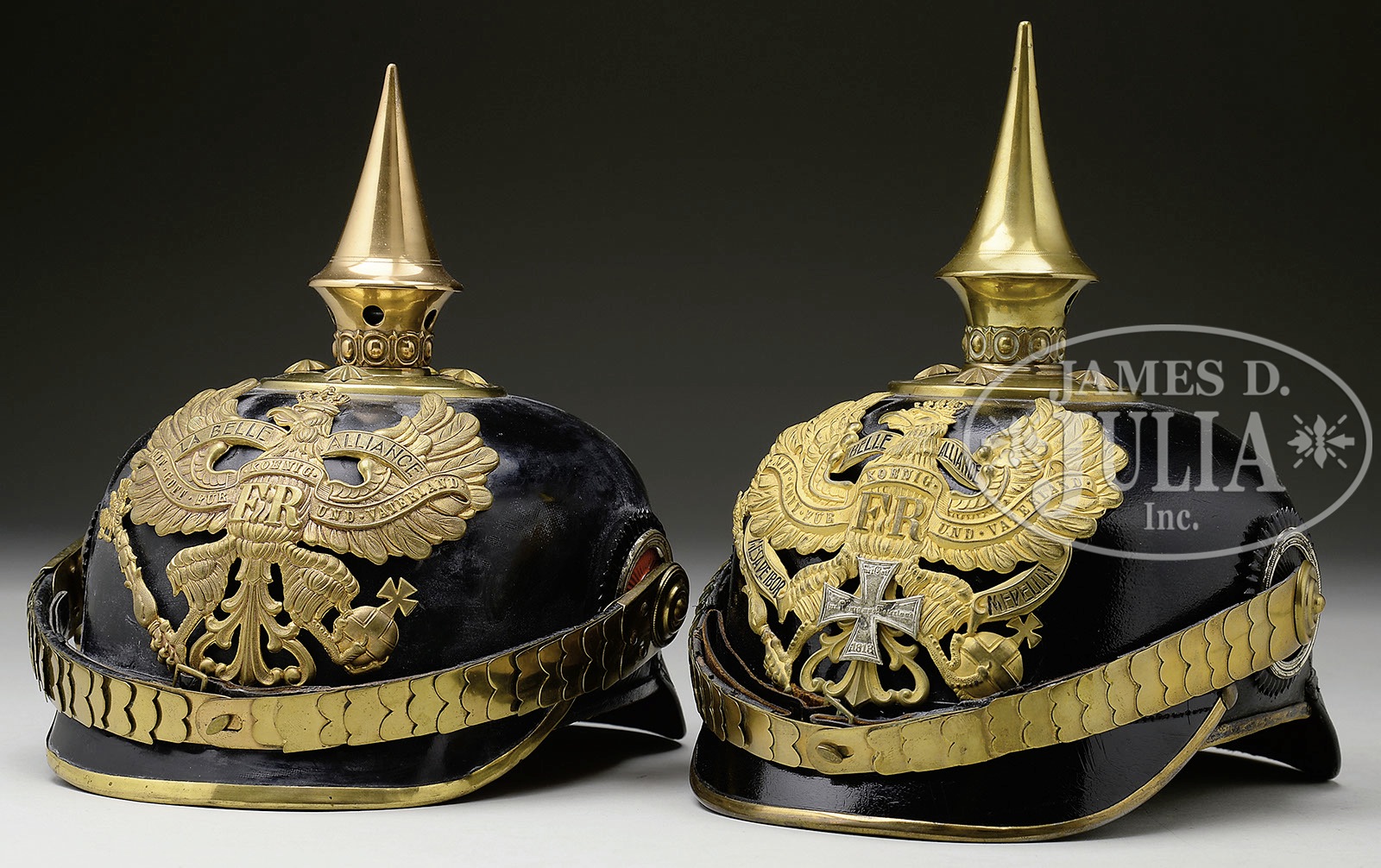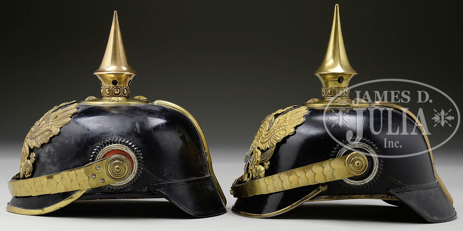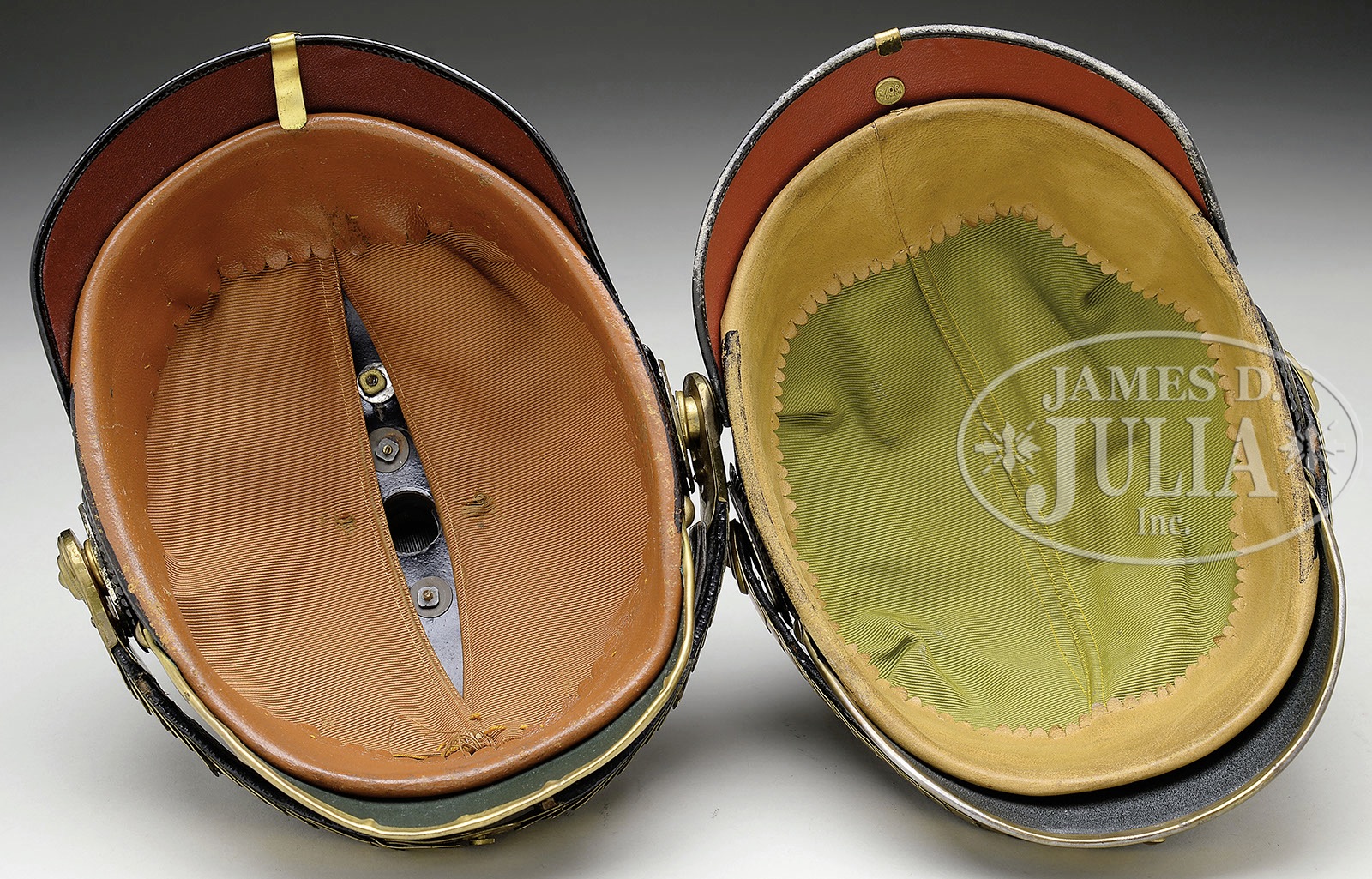 TWO NASSAU/PRUSSIAN OFFICER’S HELMETS.1) Nassau 88th Infantry Regiment, 2nd Nassau, Reserve Officer’s helmet. Line eagle with banners “LaBelle – Alliance – Mesa de Ibor – Medellin” for service as the Kings German Legion in the Napoleonic Wars. Banners and frontplate one piece construction. Black lacquered felt body with firm stitching. Interior sweat leather lining and silk head liner. Visors colored. No extra holes in body. Helmet body has excellent form with fine matte finish to black lacquer. No cracks or crazing. Visors also in near perfect condition. Round base with tall smooth spike. Frontplate retains over 90% of fine fire gilding. Silver Prussian reserve cross on eagle’s tail. Banners lettering outlined in black. Flat gold chin scales with Reichs and Prussian cockades. Outstanding and extremely rare helmet. 2) Nassau 87th Infantry Regiment, 1st Nassau, Officer’s helmet. Line eagle with banners “LaBelle – Alliance” for service at the Battle of Waterloo in the Napoleonic Wars. Banners and frontplate one piece construction. Black fiber body with firm stitching. Interior sweat leather and silk head liner. Colored visors. Holes widened by 5mm for fixing frontplate to helmet body. Fiber body has excellent form with fine gloss. Some matte finish due to age. Several small 1/2″ long scratches on back left side that are not detractive. Helmet is model 1915 construction with spike removable at base and chin scales on side lugs. All trim is pre-war quality and not zinc construction. Round base with smooth spike. Frontplate retains most of original gilding. Lettering in banners nicely outlined in black. Flat model 1915 officer’s chin scales. Officer Reichs and Prussian cockades. Beautiful and in near mint condition helmet. Wonderful pairing of rare Nassau officer’s helmets. PROVENANCE: Robert H. Haskell, III Estate Collection. CONDITION: 1) Excellent, near mint condition. Perfect in every detail. Metal trim bright with near perfect gilding on frontplate. Interior near mint. Silk liner has no tears or discoloration. Metal trim pre-war quality. Small eagle on scepter on front plate has right wing broken off. This may have happened when the field cover was removed and caught the eagle’s wing. Amazing conditioned helmet. 2) Excellent helmet in near mint condition. Lacquer body still shiny. Metal trim high quality pre-war construction with no discoloration. Interior of helmet appears never to have been worn. One small tear to silk liner where it touches the screw for the star retainer. 4-50221-43 RT44 (3,000-5,000) – Lot 3299