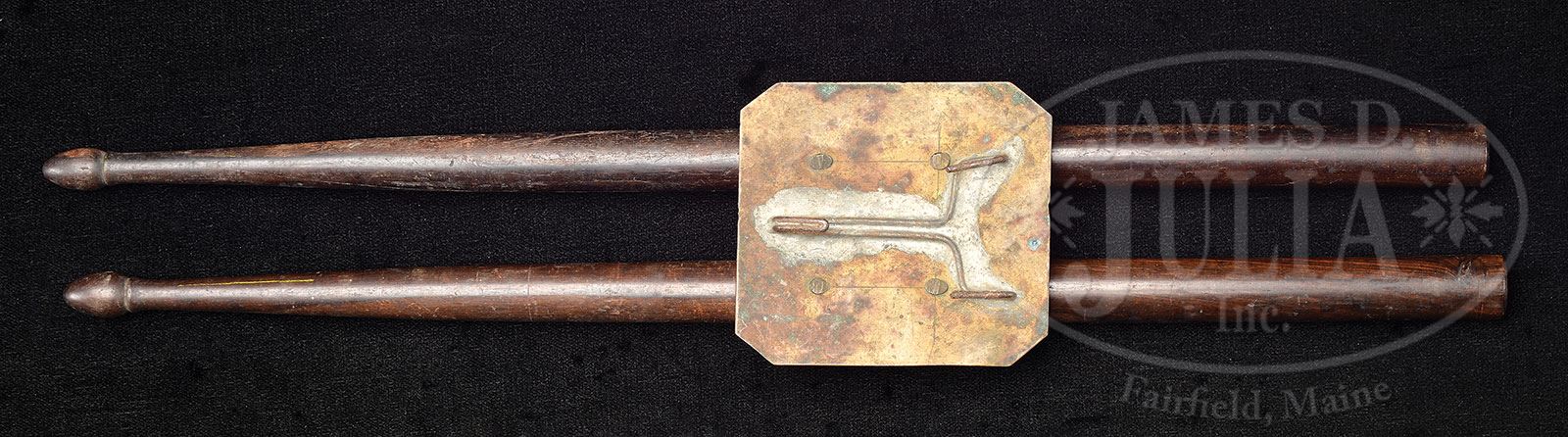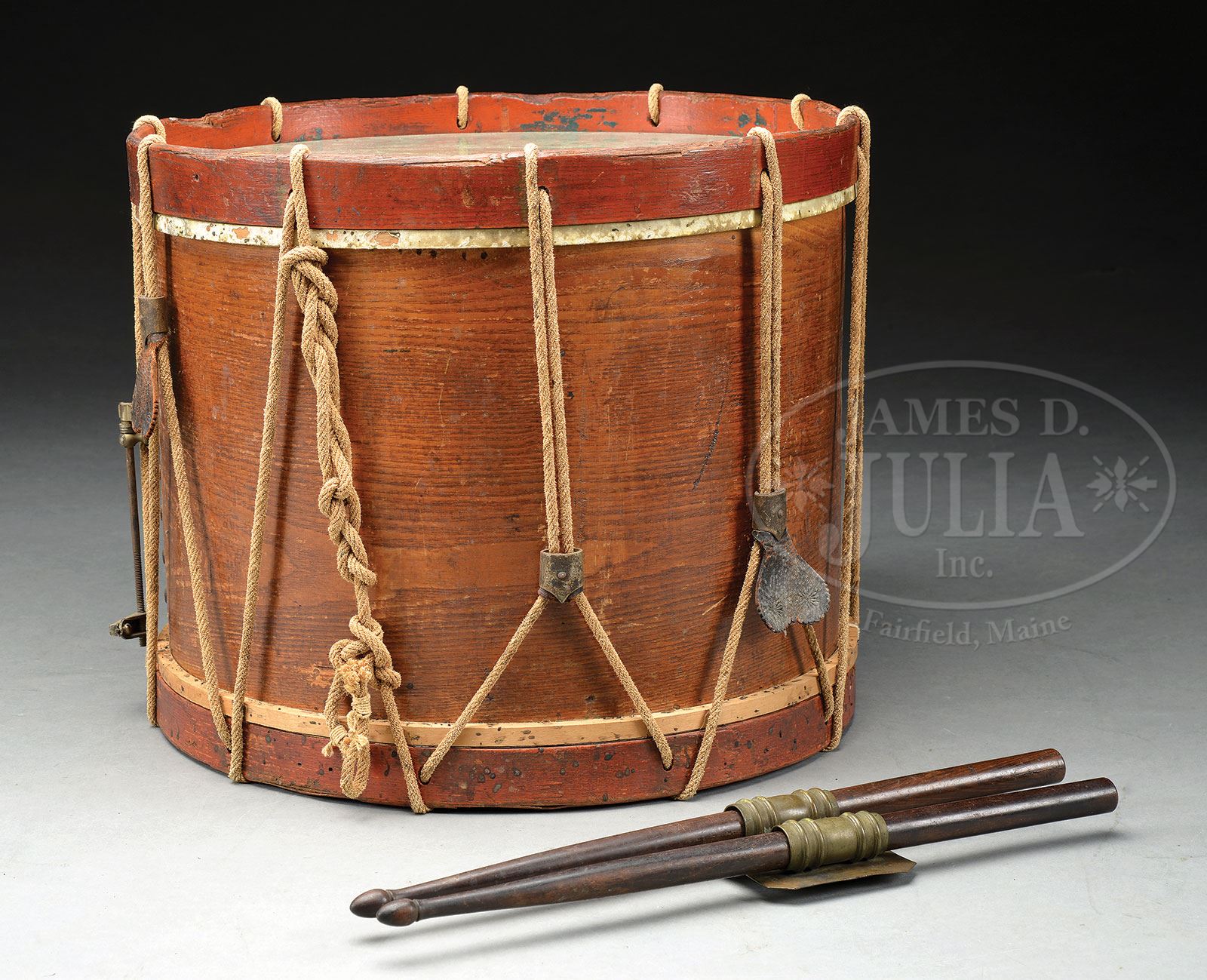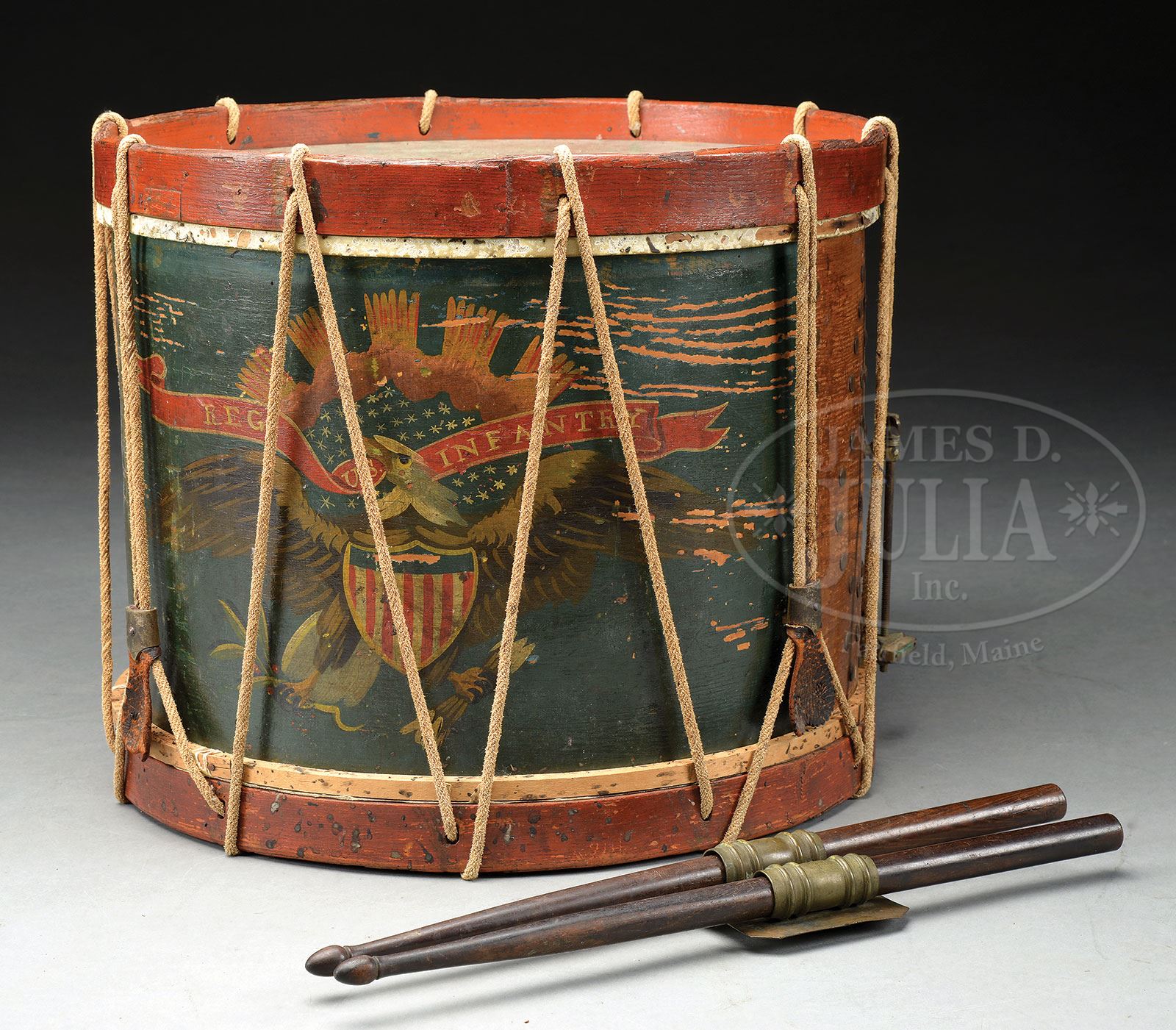 CIVIL WAR EAGLE DRUM WITH DRUMMER BOY BUCKLE AND DRUMSTICKS.SN NSN. Fine regulation painted Civil War infantry eagle drum and rare drummer boy’s buckle with pair of drumsticks. This is a type drum and buckle seen in Civil War photographs. These buckles are rarely offered in non-excavated condition but often show up excavated in campsites and battle fields. PROVENANCE: Greene Museum of Southern History. CONDITION: Drum measures 14″ high including red painted 1″ hoops. Drum is just over 16″ in dia. Heads have been backed with 1/4″ wood panels for display, a round piece of glass has been added to the top so drum can be used as a sturdy table. There is a later added metal snare device attached near vent hole with extension attached to to drum inside tack design about 3″ from vent. Ropes appear of later vintage as do the few remaining tighteners. Painted eagle device appears orig with no apparent in-painting, though a slight yellowing to varnish layer. Buckle is complete with both bales for sticks firmly attached as are the soldered wire hooks. Brass buckle has an overall grungy patina with dirt and grime appearing “as found” and several small bends. Accompanying drumsticks display well and are in typical good condition. 4-54276 JS226 (5,000-7,000) – Lot 3299