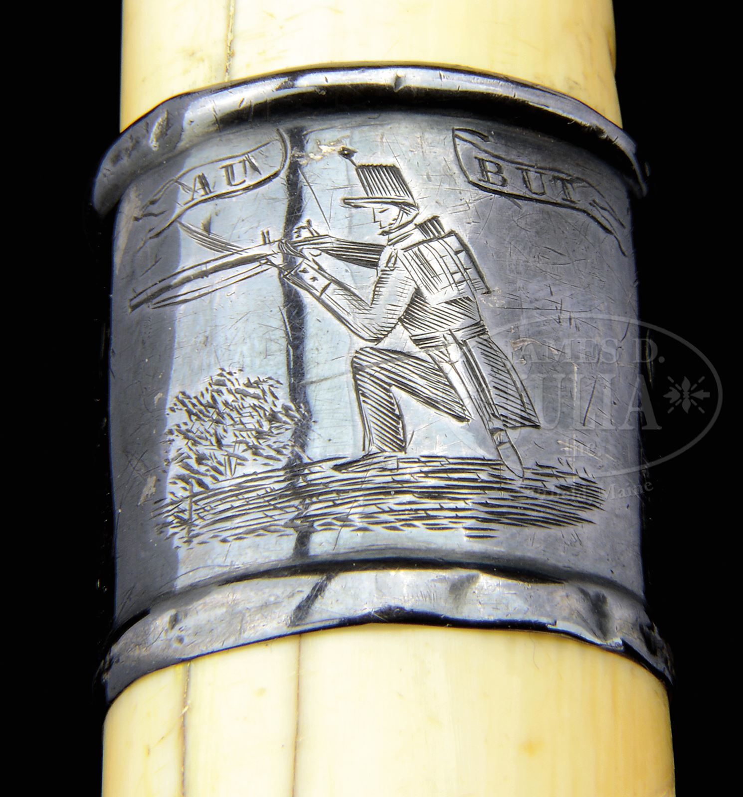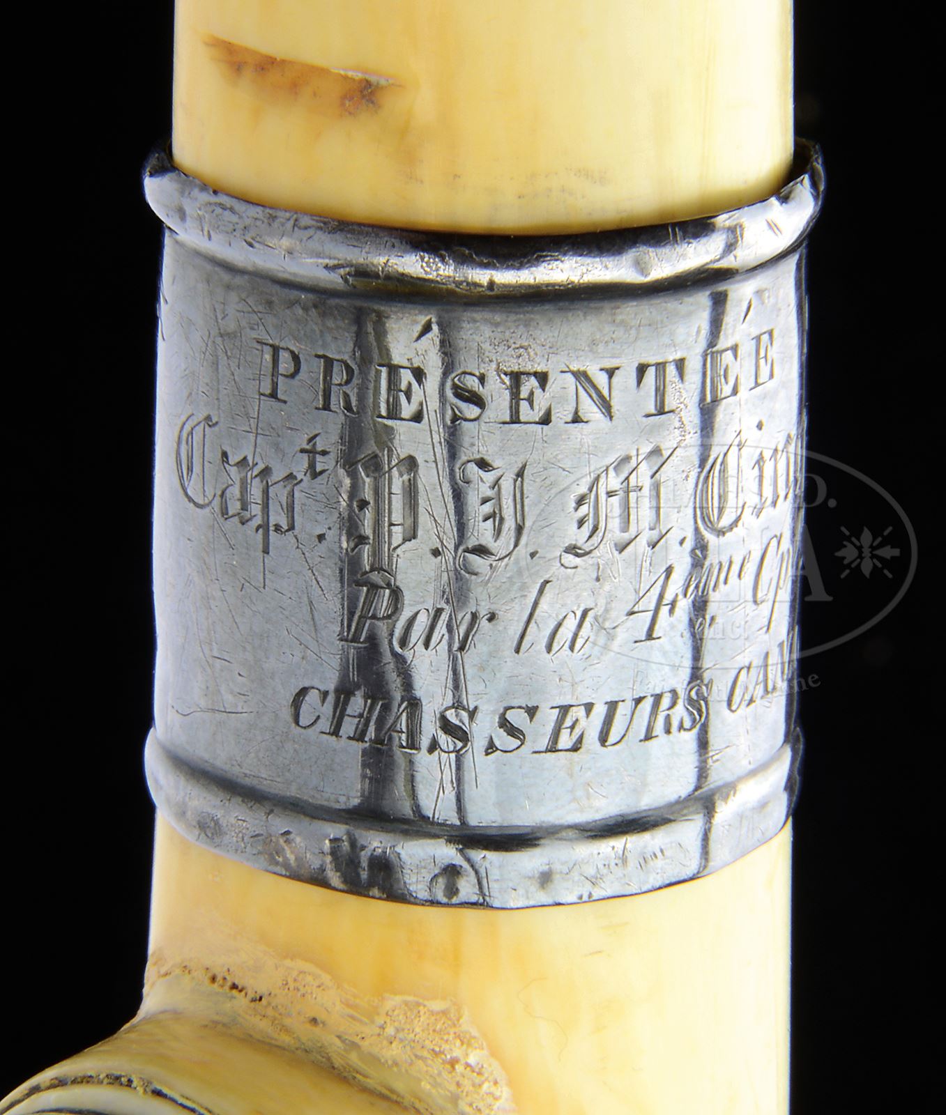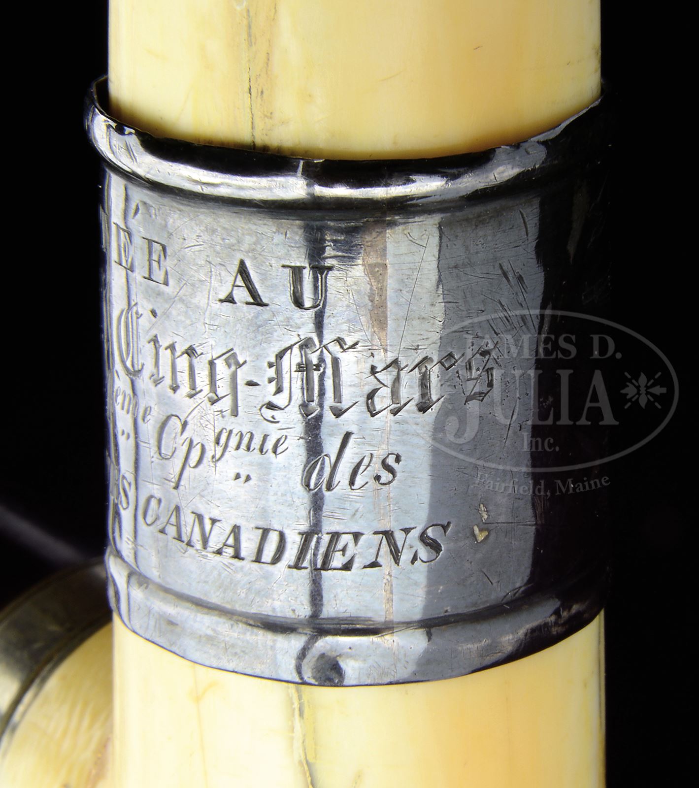 Please note: Estimate should be $6,500 – $7,500. PRESENTATION REMINGTON PERCUSSION CANE GUN WITH IVORY HANDLE.SN 74. Cal. 31. Made of brown gutta percha, 32-3/8″ overall with right angle rnd “certifiable antique ivory” handle on short handle shaft with domed, checkered trigger button. Cane has metal tip with spiraled knurled band and Thomas & Remington Patent information along with SN. No other markings visible on the cane. The joint between the handle and handle shaft has a 5/16″ nickel silver band. Handle has a 1″ silver band engraved with a French Colonial style soldier with shako and pack shooting a percussion rifle. Inscription is in French and appears to be “PRESENTED TO / Capt. P. Y. M. Cinn-Mars / Par la 4 eme Cp gnie des chasseurs Canadiens” (rough translation: For the 4 th Pc genius of Canadians hunters). The handle is unscrewed from the main shaft for loading. To fire, the handle is retracted which cocks the striker which also raises the rear sight and exposes the nipple for loading a percussion cap. The handle threads are frozen in place and the handle cannot be removed. Only about 500 percussion can guns were produced in the period 1858 – 1866. Few of those survive today. PROVENANCE: The Elliott Burka Estate Collection. Special Note: This item contains or is made of ivory. Do not bid on this lot unless you have read and agreed to our "Ivory Position Statement" and the "Waiver of Legal and Financial Risk to James D. Julia in regards to your Purchase of an Ivory Object." This information is located in the front section of our catalog. CONDITION: About fine. Handle has a few age lines and a couple of chips with a repaired break just above the joint. Gutta percha has a 3″ crack in the main shaft toward the tip, otherwise appears to be completely intact. Mechanics are fine, unable to check the bore. 49662-4 JR IVORY (1,500-2,500) – Lot 3299