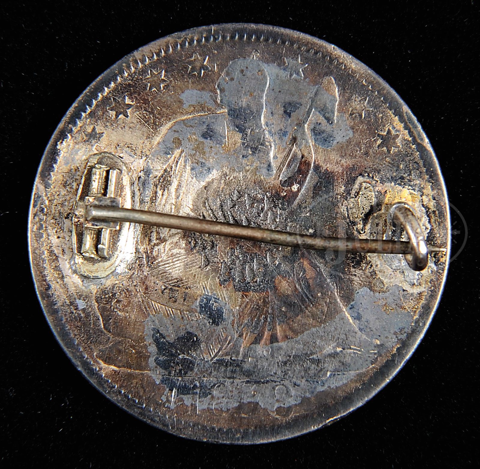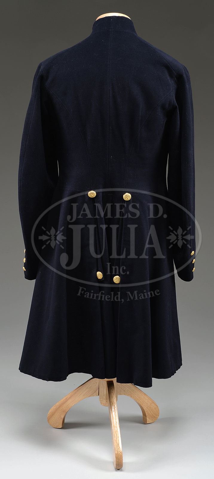 EXTREMELY RARE CIVIL WAR ENLISTED 9-BUTTON ORDNANCE FROCK COAT WITH SILVER ORDNANCE CORPS BADGE.SN NSN. This wonderful and high conditioned regulation Civil War frock coat is prominently pictured on p.156 of Echos of Glory, Arms and Equipment of the Union Army identified as a “privately purchased…finer quality than regular issue uniforms” and indeed this coat has a quality of the best officers coats with fine polished green quilted cotton lining with internal tail pockets. Coat also exhibits very rare Ordnance Corps buttons with their distinctive device of crossed cannons and bomb with garter reading “ORDNANCE CORPS”. These buttons are finely gilded with “EXTRA RICH, R&W ROBINSON” back marks. Coat retains all 9 buttons in front, 4 on tails and 6 cuffs. Also the coat has attached a beautifully engraved Ordnance Corps pin with T-bar back made from an 1838 dated half dollar. This coat once in the extensive and well known Enlisted Union Uniform Collection of Jimmy Stamatelos may be the only example extant. PROVENANCE: Jimmy Stamatelos Collection. CONDITION: Fine and about as nice as worn Union uniform cloth occurs. Coat has rich dark blue color with only a few small moth or insect holes and nap reductions and tracking from mothing. Lining is intact with minor staining, light fading on edges and a few small reductions. Buttons all appear orig though two tail buttons have been re-sewn. This coat conforms to other Civil War frocks with massive 9″ elbows tapering to cuffs that are about 5″ with plain polished cotton sleeve linings. 4-53771 JS298 (10,000-15,000) – Lot 3300 Click here to view provenance