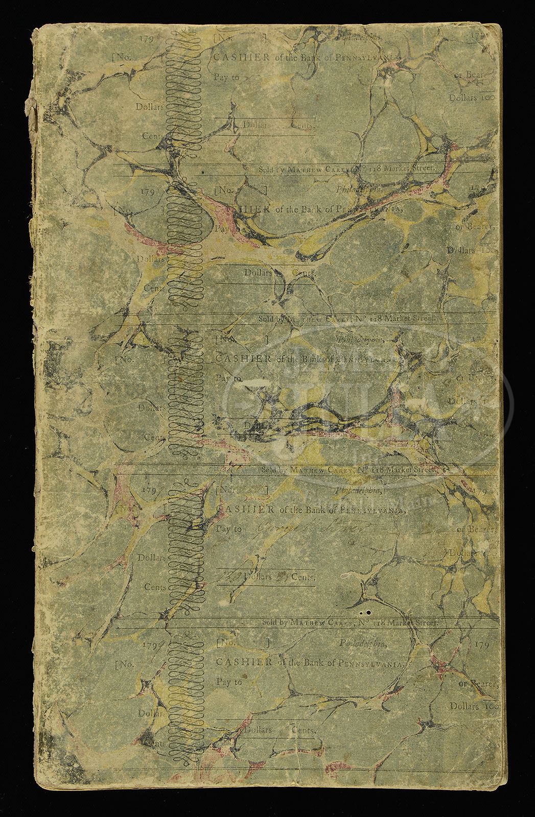 This daily log was written from decks of two of the most famous and historic ships of the U.S. Navy. Authorized by Congress in 1794 and named by George Washington, our first powerful naval warships showed the world our constitutional concepts by their ship names (President, Constitution, United States, and Congress). The log starts aboard the 44-gun frigate “President” and ends on the USS “Constitution”. Both vessels played important roles earlier in the Barbary Coast Wars and were soon to make history in the War of 1812. These two vessels would be very prominent in early American Naval history. The commanders of these two vessels at time of this journal, the Barbary Coast Wars and the War of 1812, were William Bainbridge and Isaac Hull. These two commanders are among America’s most decorated and well known early American Naval Officers. Isaac Hull won the biggest naval battle in American history capturing HMS Guerriere August 19, 1812 while commanding the USS Constitution. When the other original 44-gun frigates were decommissioned for updated vessels; she continued to actively serve the nation as a flagship in the Mediterranean and African squadrons and made a circumnavigation of the world in the 1840’s. During the American Civil War she served as a training ship for the United States Naval Academy and carried artwork and industrial displays to the Paris Exposition of 1878. Retired from active service in 1881, she served as a receiving ship until designated a museum ship in 1907. In 1931 she made a three-year, 90-port tour of the nation and in 1997 she finally sailed again under her own power for her 200th birthday. The U.S. Constitution is berthed at the Charlestown Navy yard in Massachusetts and is used to promote understanding of the Navy’s role in war and peace through educational outreach, historic demonstration, and active participation in public events. She is the oldest commissioned vessel afloat in the world. Julia’s sold another log also from the same family, which also descended down from mid-shipman George Washington Storer. Storer who was a lifelong Naval Officer was commissioned 1809, dying in 1864 a Rear Admiral. Storer was named for President Washington when born in 1789 and according to history was blessed by the former President when the latter was visiting the Lear family in Portsmouth, NH while Storer was a baby. It is stated in “Brewster’s Rambles About Portsmouth” published in 1859 that George Washington said that he hoped that Storer would “be a better man than that whose name he bears”. Storer’s father was married to George Washington’s secretary’s sister, Mary Lear. This is a one of a kind opportunity to acquire an authentic and historically important document from “Old Ironsides” and even rarer “USS President”. Prospective institutions or collectors should read Storer’s daily accounts from 1810 aboard these vessels. This bound journal measures 12-3/4″ X 8″ and is filled out on all 112 of its pages. Binding is quite interesting, being wallpaper covered wraps with the cover imprinted as a sheet of five “Bank of Pennsylvania” checks of the 1790s printed by Matthew Carey. Matthew Carey was among America’s preeminent publishers in America’s first capitol; correspondence from George Washington and Thomas Jefferson exist from this period prior to capitol moving in 1800. Carey is often called the Father of Modern Publishing. The company that Carey started continued through his colleagues and heirs for over 200 years (most recently known as Lea & Febiger). The log itself on the front page in large script reads “A Journal Kept Onboard the United States Frigate President of 44 Guns, William Bainbridge, Esquire, Commanded by George Washington Storer”. (Note there was a word actually written before “A Journal” that at some point in time was clipped out.) The journal begins on Tuesday, January 23rd, 1810 and has entries for contiguous days. All writing is in a crisp hand, all easily legible. About a third of the way through, the tops of the pages are titled “United States Frigate President, William Bainbridge, Esquire, Commander of Anapolis””. Further into the log, the tops of the pages are titled “United States Frigate president, Lt. Charles Morris, Commander”. And still further on the tops of the pages are titles “United States Frigate Constitution, Isaac Hull, Esquire, Commander”. This is a truly historic artifact from one of the most renowned and fabled warships in the entire fleet of the U.S. Navy. To find in public hands, a genuine article that at one time was present on this famous ship is extraordinary. This log, as mentioned early on in this catalog description, comes from a historic family. One of the ancestors of this family was Tobias Lear. Lear, of course, was General Washington’s personal friend and secretary in the latter part of his life (Lear was at Washington’s side when he died). At Washington’s death, Lear managed and handled Washington’s papers and entire library. In an earlier auction for this same family, we sold a number of papers and documents, and the historic $1.15 million “BATTLE OF YORKTOWN MAP, EXECUTED BY JEAN BAPTISTE GOUVION” that actually came from Washington and Tobias Lear. Also included in this extraordinary assemblage that we sold earlier was a parcel of letters written by Commander Bainbridge while he was imprisoned by the Barbary Pirates in 1804. Another ancestor of this same illustrious family from which the ship log comes was Commodore Stephen Decatur who defeated the Barbary pirates. A truly rare and historic object with impeccable provenance from a famous and historic family lineage. CONDITION: Binding is scuffed and worn with chipped spine but still intact with minor water staining and worn edges to corners. 4-53620 JS324 (15,000-20,000) – Lot 3302