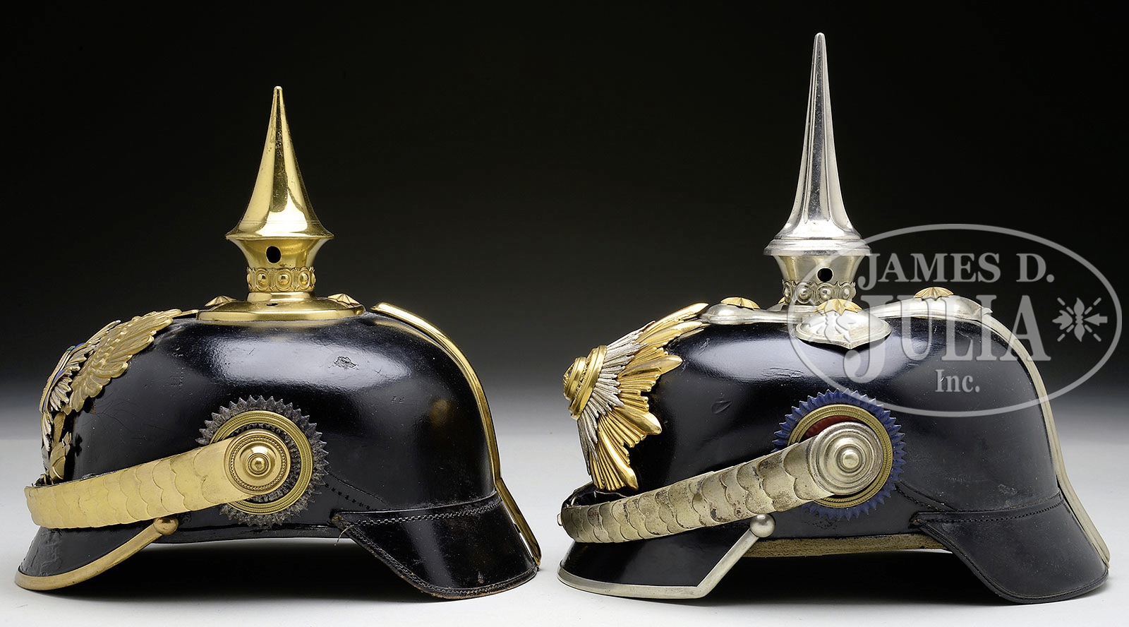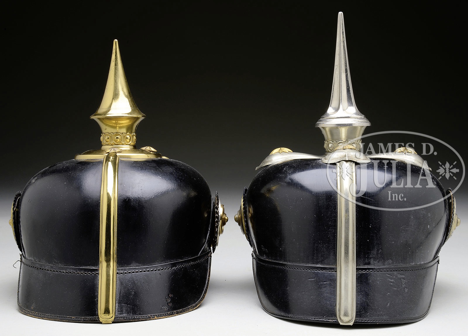 1) Mecklenburg Schwerin General Staff Officer’s helmet. Black fiber body with silver and gold trim. Body with fine form and good stitching. Interior sweat leather and silk head liner may be replacements. No extra holes in body. Visors colored. Black finish in near perfect condition with no cracks or crazing. Silver crossed spike base with fluted spike. Gold stars retaining base to helmet. Frontplate in three piece construction. Background is gold Mecklenburg star on which a second silver star is placed, on top is a round enameled piece with red background with motto “Per Aspera Ad Astra”. On top of that is a gold crown on blue enameled background. Silver rounded chin scales with officer’s Reichs and Mecklenburg cockades. Frontplate appears to be added to helmet as it rests about 1/2″ off front visor stitching. Otherwise extremely beautiful helmet with mixture of original and replacement parts. 2) Brunswick 92nd Infantry Regiment First and Second Battalion, before 1912, Reserve Officer’s helmet. Black lacquered leather body with bright gold trim. Sweat leather with silk head liner. Colored visors. No extra holes to body. Round base with smooth spike, missing one retaining screw at spike base. Frontplate is line eagle on which is placed a silver star with enameled Arm of Brunswick and reserve cross. Enameled frontplate and reserve cross appear to be modern day replacement. Flat gold chin scales with Reichs and Prussian officer’s cockades. PROVENANCE: Robert H. Haskell, III Estate Collection. CONDITION: 1) Excellent condition inside and out. Metal trim bright. Interior virtually new. Question over authenticity of front plate impacts the value of this piece. A beautiful mix of original and replacement parts. 2) Excellent condition inside and out. Original officer’s helmet with fine trim. Enamel frontplate is reproduction, which significantly effects value. Both pieces are visually attractive. 4-50221-48 RT49 (1,000-3,000) – Lot 3304