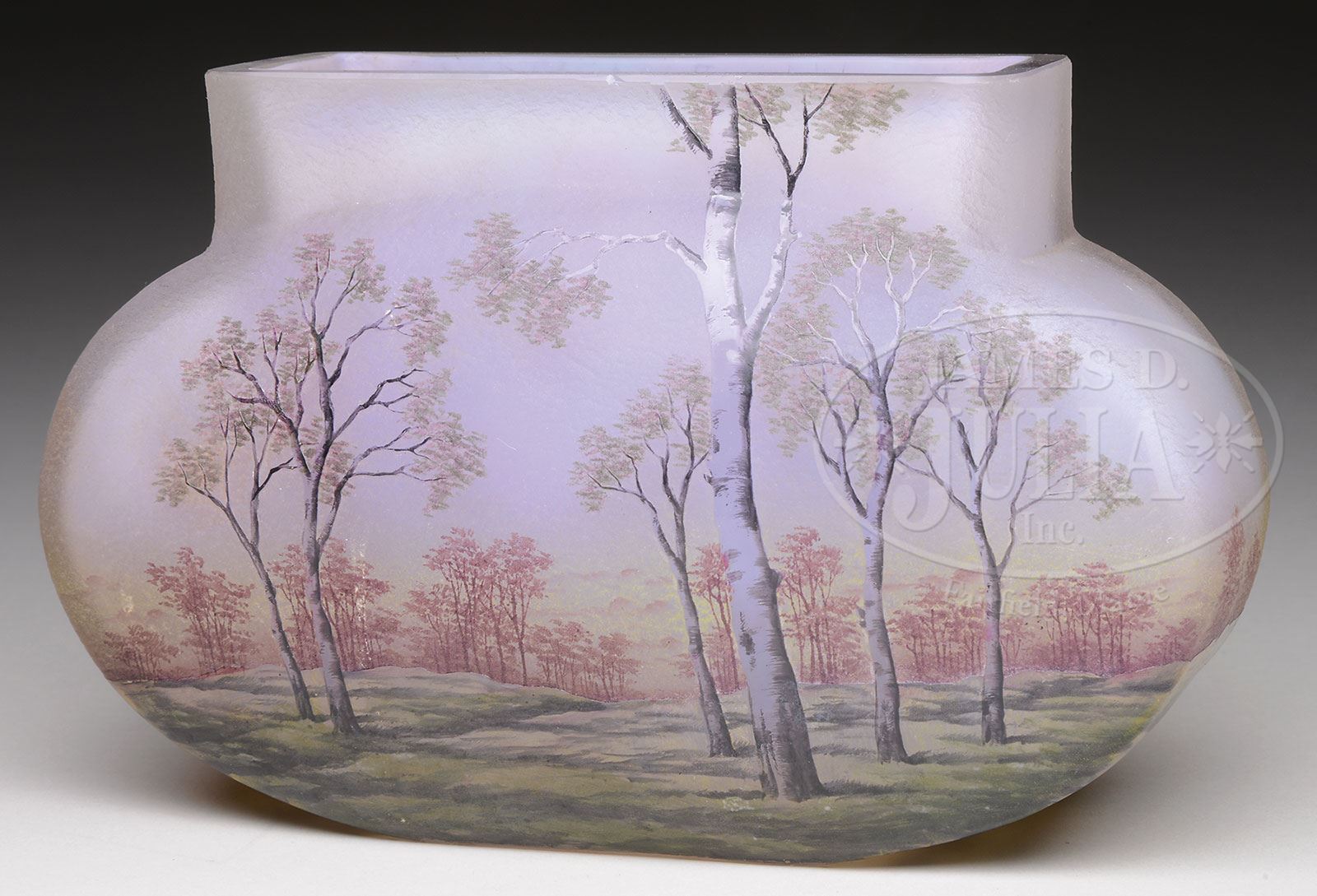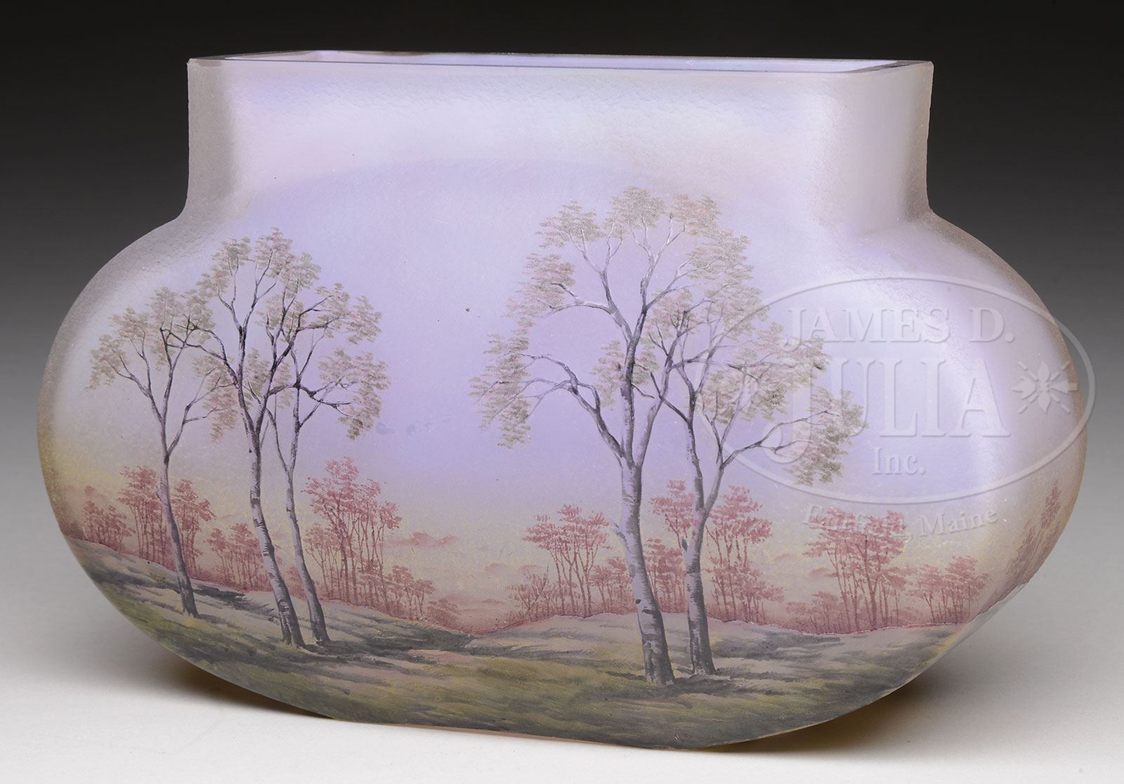 DAUM SCENIC VASE.Daum vase has cameo and enameled forest scene of trees and meadows. The tree trunks are nicely enameled in shades of gray while the distant trees are done in shades of red giving the feel of a warm fall day. Vase is signed on the underside in black “Daum Nancy” with the cross of Lorraine and conjoined initials “HF”. SIZE: 4-1/2″ t x 7″ w. PROVENANCE: Private New England Collection. CONDITION: Some light grind marks to the inside and outside lip as well as a tiny flea bite on the inside lip, otherwise very good. 5-69265 (1,200-1,700) – Lot 3304