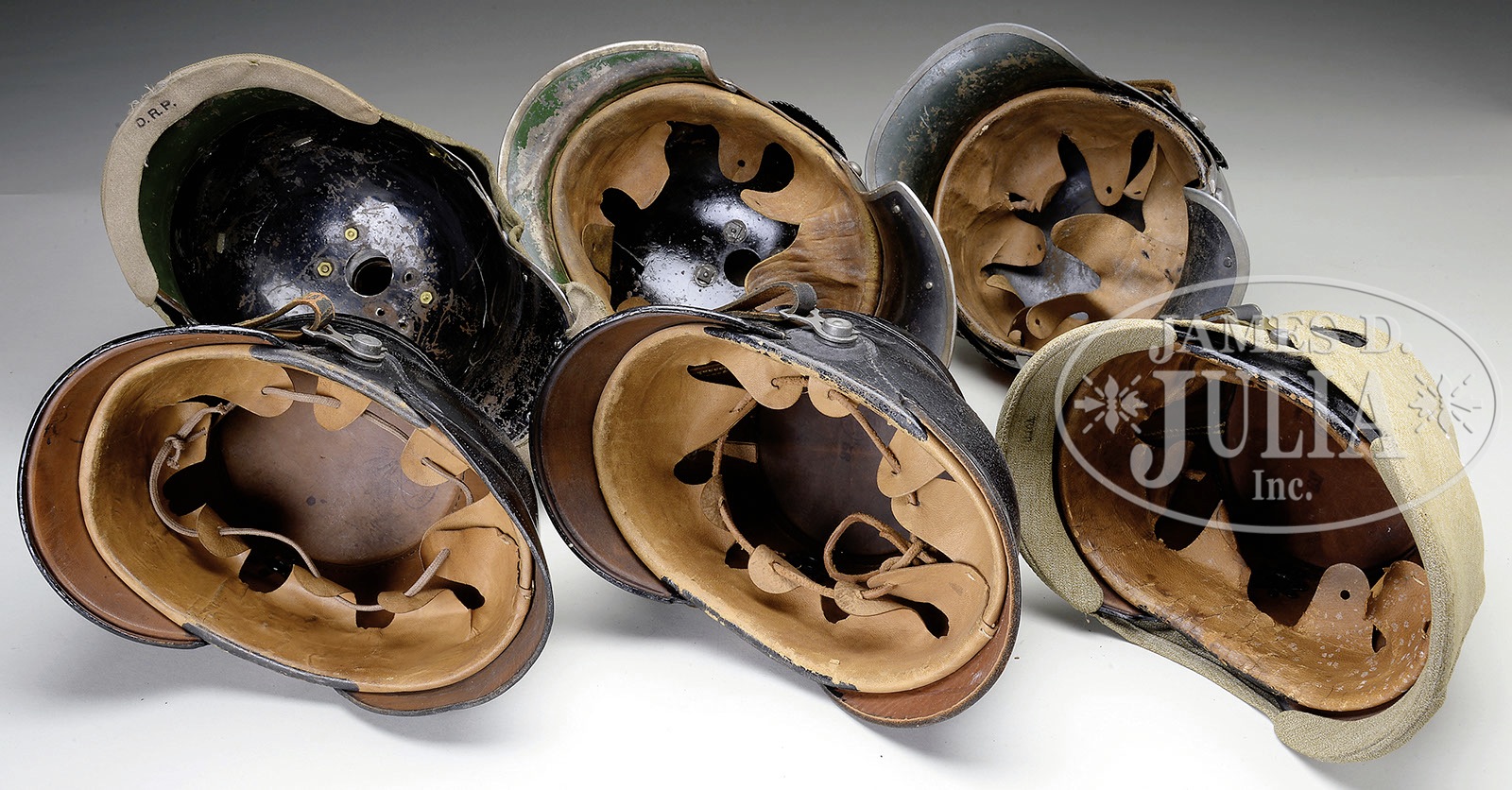 LOT OF SIX WWI ERA LOBSTERTAIL HELMETS AND JAEGER SHAKOS.Lot includes Prussian Line Cuirassier enlistedman M1915; Prussian Line Jaeger-Zu-Pferde enlistedman M1915; Prussian Line Cuirassier enlistedman M1915 missing front plate and liner but with original officer’s cloth field cover; Prussian Line Jaeger Battalion enlistedman M1915; Prussian Guard’s Regiment Jaeger Shako M1915; Prussian 11th Jaeger Battalion M1915 with original cloth field cover with outlined number “11” on front. PROVENANCE: Robert H. Haskell, III Estate Collection. CONDITION: Conditions very from very good to excellent. Some reproduction parts but for the most part all original parts. 4-50221-53 RT54 (1,500-3,000) – Lot 3309
