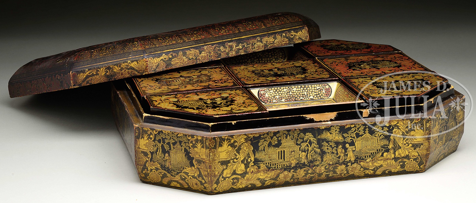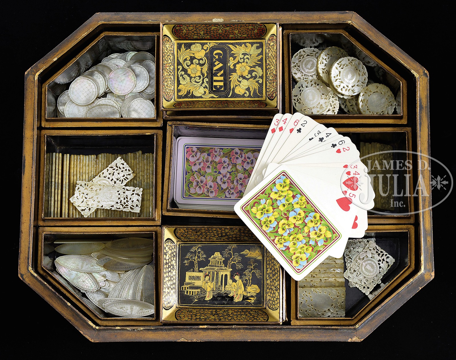Please Note: The games box is accompanied by quantity of carved abalone game tokens CHINESE EXPORT CARD BOX.19th century. Lacquered decoration in red, black and gold of figures in landscapes. Fitted interior. SIZE: 14″ l x 12″ w. CONDITION: Considerable wear and loss to lacquer. 9-93180 (800-1,200) – Lot 3309