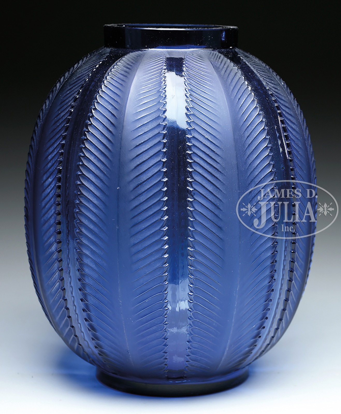 FINE LALIQUE “BISKRA” VASE.Circa 1932 France. The oblong melon formed vase cut with fronds signed LALIQUE/FRANCE beneath the foot in block letters. SIZE: 11-1/2″ h. CONDITION: Vase has a substantial hairline crack along base. 49331-9 (2,500-3,500) – Lot 3310