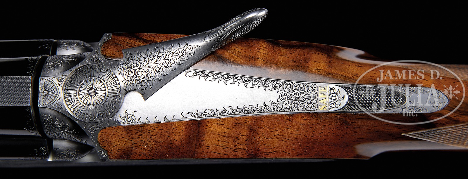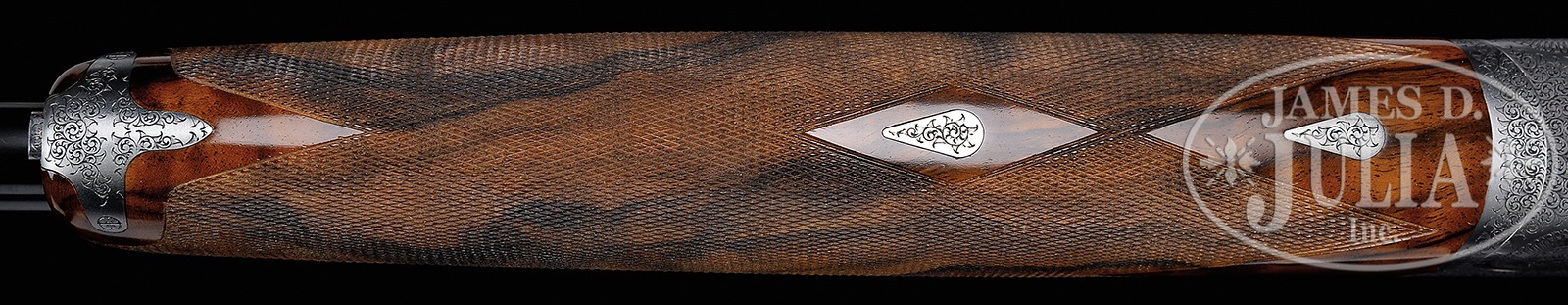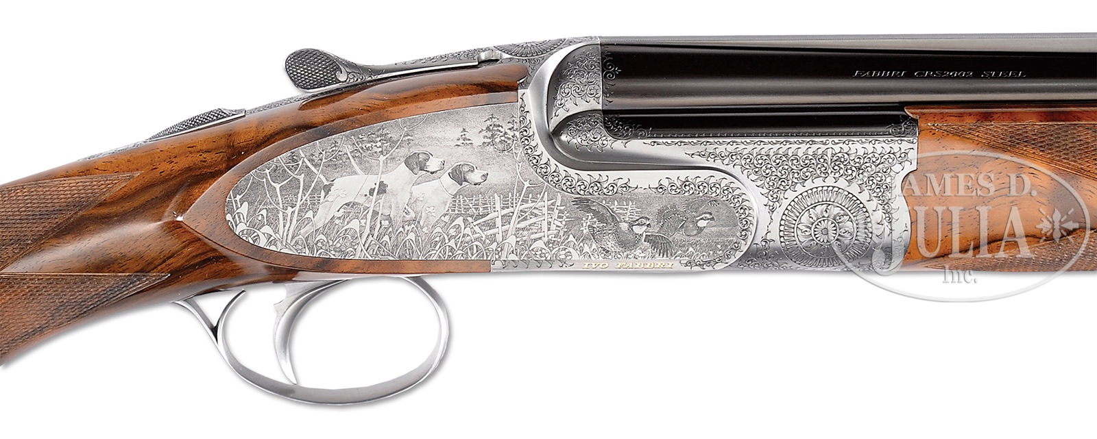 *SUPERB SMALL BORE FABBRI PINLESS SIDELOCK OVER-UNDER SHOTGUN WITH EXCEPTIONAL DRAMATIC QUAIL SCENE ENGRAVING BY “CREATIVE ART” AND CASE.SN E965. Cal. 20 ga. 3″ Chambers. 28″ Demi-bloc bbls with matted, solid rib are engraved “IVO FABBRI – BRESCIA” and “FABBRI CRS 2002 STEEL” on top bbl either side of rib. Bbl flat is stamped with 2006 Italian nitro proofs for 3″ chambers. Coin finished, low profile, Fabbri action with pinless sidelocks, has disassembly screws located under small trap doors at top of each lockplate, and features non-automatic safety (SAFE inlaid in gold), and single non-selective trigger. Action and lockplates are engraved with 80% coverage well cut, small scroll surrounding truly exceptional bulino renderings of quail and dogs; pair of pointers, one pointing, the other honoring, on left lockplate as a pair of quail flush. Detailed background is of high mountains and dramatic sky. Right lockplate portrays what appear to be the same dogs, pointing and honoring another pair of quail, with picket fence and conifers in background. A covey of quail have taken flight and are “in-your-face” on bottom of action. This particular scene is signed “Torcoli” on large blade of grass. “IVO FABBRI” is gold inlaid on bottom sides of action and above quail scene on bottom. This wonderful engraving, with very realistic, almost photographic renderings of dogs and birds, is signed “Creative Art” on trigger plate. Scroll engraved, small bow trigger guard has SN in gold on tang. Beautifully marbled and burl figured, flesh-toned, European walnut round knob pistol grip buttstock measures 14-5/8″ over checkered wood butt. Well cut point pattern checkering is at grip. Matching one piece forend has Anson type release in slightly wrapped forend tip. Bore diameter: top -.620, bottom – .621. Bore restrictions: top – .011 (mod), bottom – .012 (mod). Drop at heel: 2-3/16″, drop at comb: 1-3/8″. Cast off approx 5/8″. Weight: 6 lbs. 1 oz. LOP: 14-5/8″. High quality tan leather case has stitched leather corners by Nizzoli, with label under removable compartment lid. Case is lined in burgundy cloth, with Fabbri paper label in lid. Case is French fitted for action, bbls, and forend, as well as for accessories (which are not present). CONDITION: Excellent, with only the faintest of firing halos on breechfaces, and the lightest of handling and assembly marks on wood and metal. Case leather shows some darkening, light water marks, and light scuffs. Straps and handle are excellent. Interior is excellent. Ivo Fabbri makes fewer than 25 guns per year at the pinnacle in quality, with new guns starting at approx 100,000 euros without engraving. 50401-5 MGM40 (40,000-60,000) – Lot 3311