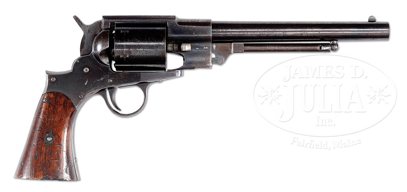 SN 1574. Cal. 44. Blue finish with 7-1/2″ rnd bbl, small pinched blade front sight with rear sight a groove in the top strap. Top strap is marked “FREEMAN’S PAT. DECr 9, 1862” and “HOARD’S ARMORY, WATERTOWN, N.Y.”. It has a 2-pc hinged rammer with Colt style bayonet latch. It also has the unusual Freeman removable cylinder by means of a latch in the right front of the frame. Cyinder is unfluted with six chambers. Mounted with 2-pc smooth walnut grips, pencil numbered to this revolver on the inside. SN was observed on right side of butt strap, under the grip, bottom front of frame, cylinder, rammer handle, arbor and bottom of bbl. No further disassembly was effected to check for additional matching numbers. According to Flayderman’s Guide to Antique American Firearms there were about 2,000 of these revolvers produced 1863-1864 and although there are no known military contracts they are considered secondary martial arms, likely to have been private purchased for use in the war. This is an extremely fine condition revolver retaining most of its orig finish and appears unfired. PROVENANCE: The Estate Collection of Phillip Bleakney. CONDITION: Very fine, all matching as noted. Bbl retains about 95% orig blue with small blemishes and some blue turning plum; frame retains about 90% glossy orig blue with pitting on forward areas at lever and on top of bbl lug. Hammer and loading arm retain dark, muted case colors. Trigger guard with integral grip straps retain about 30% blue finish with remainder blue/grey patina. Grips are sound and solid with numerous small nicks and several chips on right side along with several dents as can be seen in photographs. Sub-inspectors mark also found on bottom of right stock. Cylinder retains about 85% glossy orig blue with remainder a medium grey patina. Mechanics are fine, bright shiny bore. 49059-140 JS (4,000-6,000) – Lot 3313