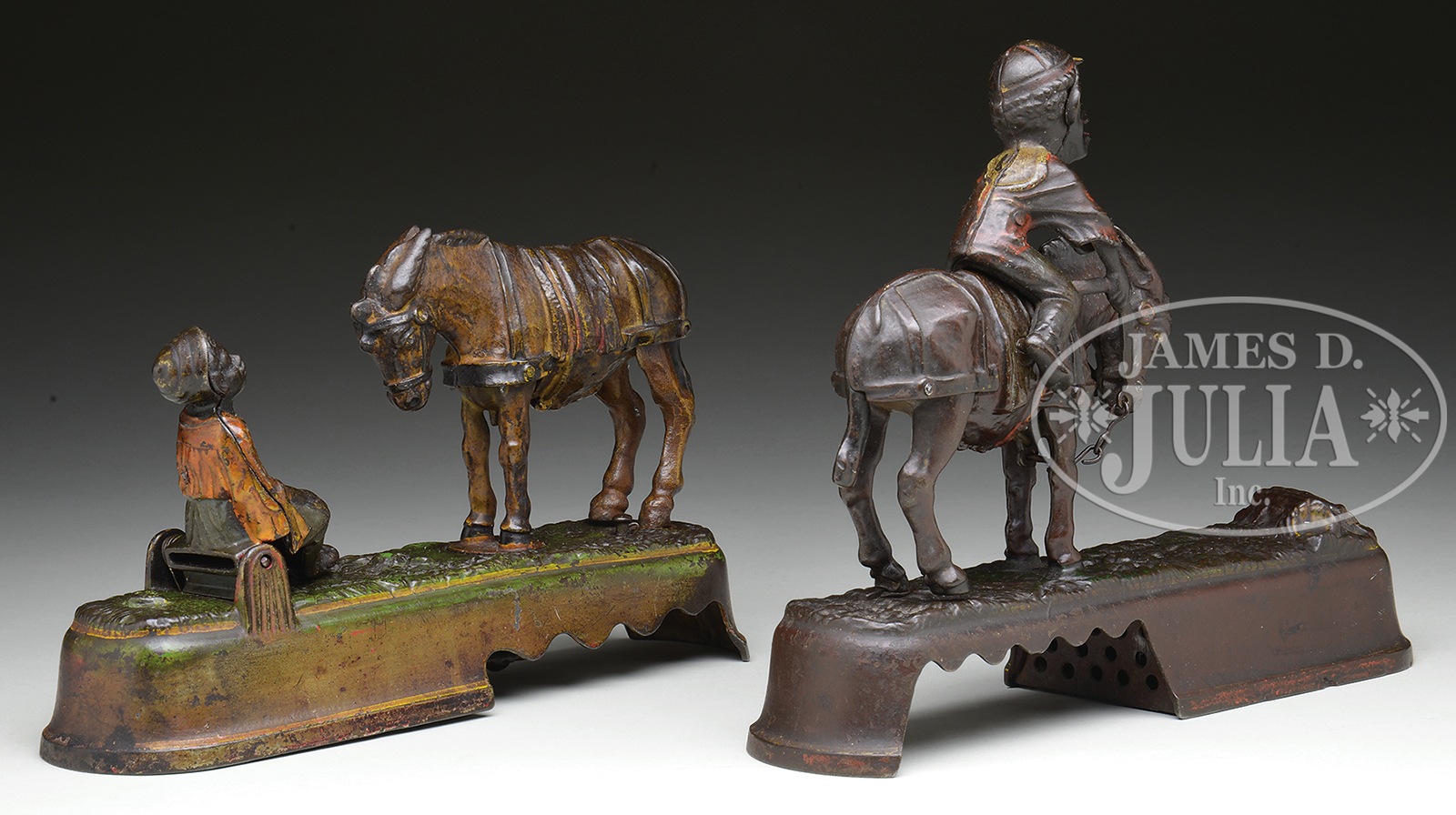 LOT OF TWO CAST IRON MECHANICAL BANKS.Lot consists of both versions of the “I Always Did ‘Spise A Mule” by J and E Stevens. The first is The Boy on Bench version that when activated, mule spins around knocking over seated boy on bench. The other is the Jockey version that when activated mule bucks up sending the rider over the top of his head. SIZE: Each is approximately 10″ l. CONDITION: Both are lacking coin traps and exhibit a dark patina. Otherwise lot is generally good with no breaks. 1-14274 (400-800) – Lot 3314 Auction: Advertising, Toy & Doll - Spring 2014 Please Note: All prices include the hammer price plus the buyer’s premium, which is paid by the buyer as part of the purchase price. The prices noted here after the auction are considered unofficial and do not become official until after the 46th day. |