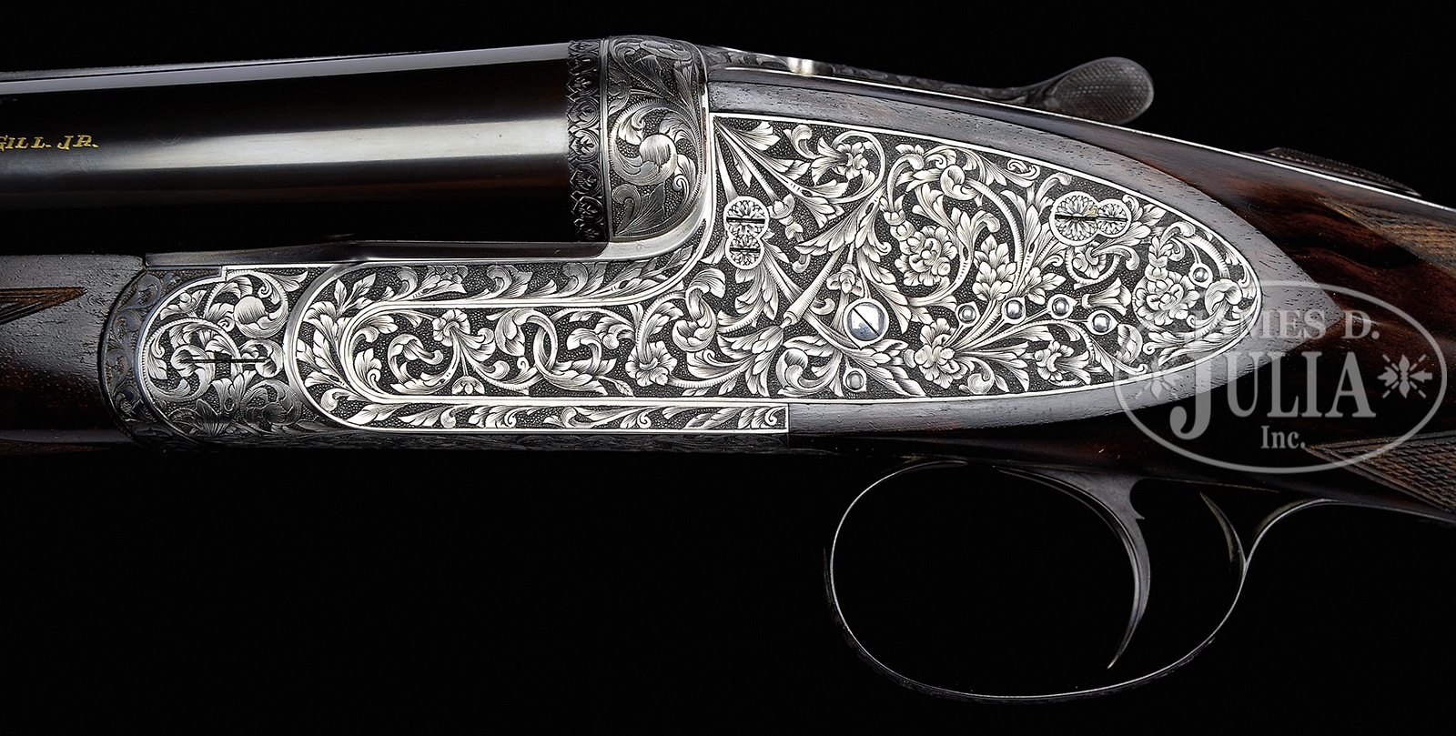 *SUPERB IVO FABBRI SELF-OPENING SIDELOCK EJECTOR SINGLE TRIGGER GAME GUN WITH MAGNIFICENT LARGE SCROLL BY C. TOMASONI WITH CASE.SN E535. Cal. 12 ga. 27″ Chopper lump bbls fitted with slightly raised, flat, hand matted rib are engraved “IVO FABBRI ARMI – BRESCIA – ITALY -” and gold inlaid “Made Especially For George W. Gill. Jr.” on side of left bbl and “BOHLER SUPER BLITZ STEEL” on right. Bbl flats are stamped with 1976 Italian nitro proofs for 2-3/4″ chambers. Bbls are fitted with H&H type self-opening assist spring mechanism. Coin finished sidelock action with small reinforcing bolsters, features non-automatic safety (SAFE engraved), engraved line tumbler end cocking indicators, and nicely filed single non-selective trigger. Action and lockplates are engraved with 100% coverage truly exceptional semi-relief large attenuated open acanthus scroll with floral highlights. Tendrils of scroll pierce many blossoms, and intertwine at ends. This fine work has dramatic shading. Makers name and address are on two small bands on bottom of action. Engravers signature is on trigger plate, “C Tomasoni” (the highly regarded Claudio Tomasoni). Small bow trigger guard has SN on tang. Exhibition quality, magically marbled and lightly stump figured European walnut straight grip buttstock measures 14-1/8″ over fully checkered wood butt, and has slight diamond hand with well cut closely spaced point pattern checkering with line borders. Matching splinter ejector forend has Anson release. It appears that this is gun “4” of a set, with gold “4” inlaid on rear portion of rib, top lever, and forend tip. Bore diameter: left -.726, right – .726. Bore restrictions: left – .022 (mod), right – .022 (mod). Drop at heel: 2-5/16″, drop at comb: 1-9/16″. Cast: approx 5/8″ off. Weight: 6 lbs. 14 oz. LOP: 14-1/8″. Tan leather case with stitched leather corners has greenish yellow canvas outer cover with tan leather trim. Interior is lined in burgundy cloth. Case contains rosewood and brass 2-pc cleaning rod with mop, jag and brush in black leather container, a pair of snap caps, square oil bottle, horn striker block, cleaning cloths, and an uninstalled Fabbri label. CONDITION: Excellent, very near to new, appears essentially unfired since proof, with only a few light handling and assembly marks on all wood and metal finishes. Mechanically crisp. Case is excellent. Outer cover has some rubs and pulls. Interior is excellent. A nicely appointed world class game gun. 51071-4 MGM277 (30,000-40,000) – Lot 3314