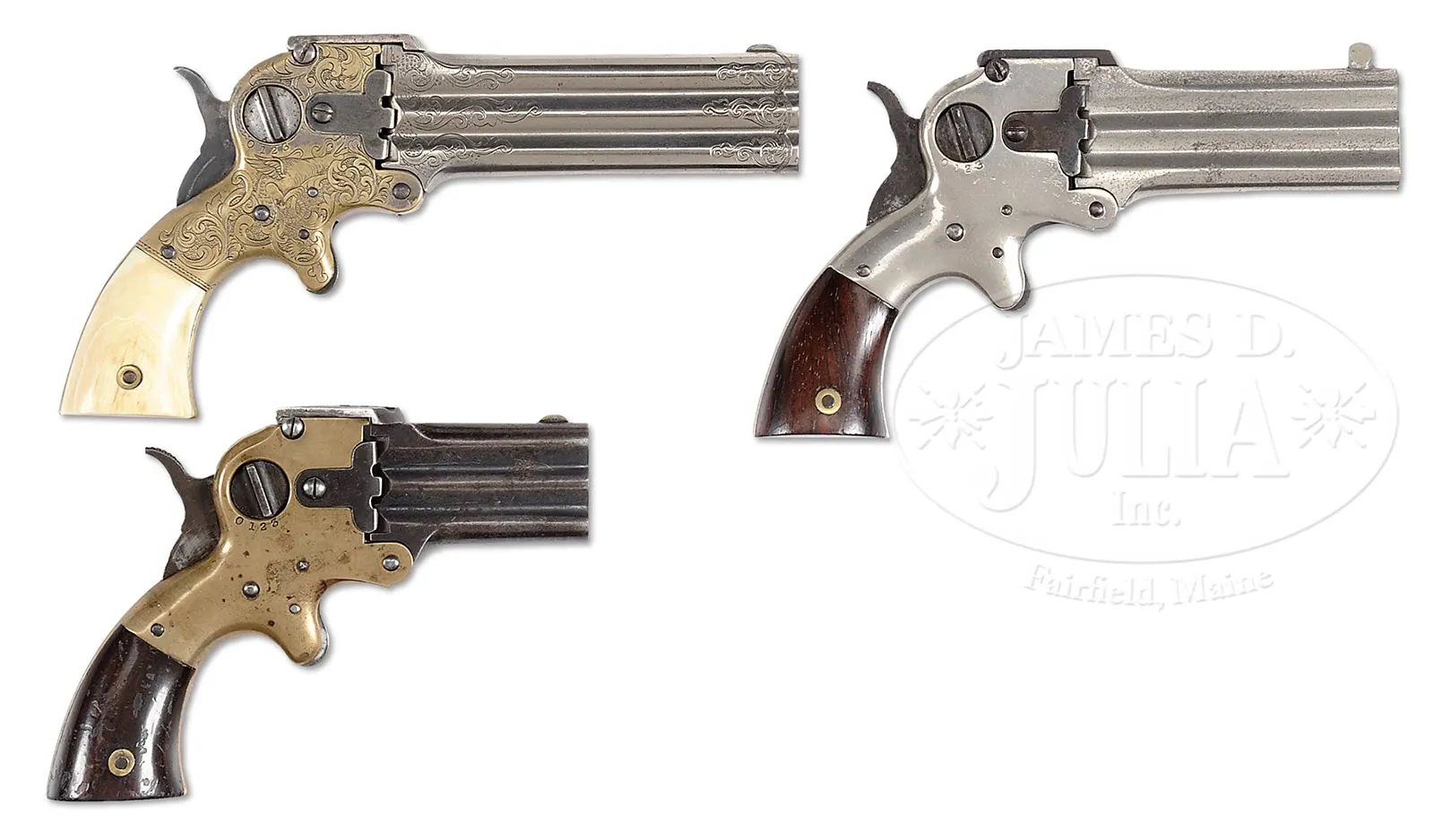 TRIO OF RARE MARSTON 3-BARREL 32 CALIBER DERRINGERS IN ALL 3 BARREL LENGTHS AND FINISHES.SN 840, 1257, 1590. William W. Marston of New York City made these unique pistols starting at the end of the Civil War through about 1870. Most guns were 3″ but we also have a 2″ and a rare 4″. Standard 3″ gun SN 1590 is nickel plated retaining most of its orig finish, with fine varnished rosewood grips. 2″ gun SN 1257 has blue barrels and the same well marked brass frame like all examples here “MARSTON / PATENTED / MAY 26, 1857 / NEW YORK CITY / IMPROVED 1864”. Our third gun, SN 840, which is quite rare, is factory engraved, silver plated with ivory grips. The engraving of mostly scrolls but has a large dragon on reverse amongst the design. PROVENANCE: SN 840 Ex-Norm Flayderman. Special Note: This item contains or is made of ivory. Do not bid on this lot unless you have read and agreed to our "Ivory Position Statement" and the "Waiver of Legal and Financial Risk to James D. Julia in regards to your Purchase of an Ivory Object." This information is located in the front section of our catalog. CONDITION: Guns are very good to fine overall, all matching. SN 1590 retains 90% orig nickel, overall with some bubbling and freckling and losses on bbl cluster. SN 1257 retains about 40% bright blue on bbl cluster with scattered staining and pitting with balance blue/grey. Brass frame has scattered small blemishes, crisp markings and mustard colored patina. SN 840 exhibits well defined engraving retaining about 20% silver plate to frame. “Certifiable antique ivory” grips are SNd matching gun. Mechanically, guns each appear to index and change firing pins correctly. 49470-3 JS IVORY (7,000-9,000) – Lot 3315