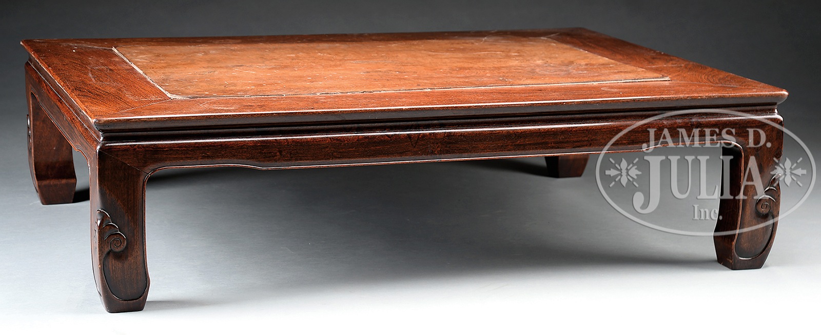 HUALI AND LACQUERED BURLWOOD KANG TABLE.Republican Period, China. Raised on hoof legs decorated with lingzhi fungus. Top framing a large single piece of lacquered burlwood. SIZE: 13″ h x 48″ w x 37″ d. CONDITION: Burlwood panel with minor scuffing and typical age cracks. Remainder with minor condensation stains. 49834-1 (800-1,200) – Lot 3318