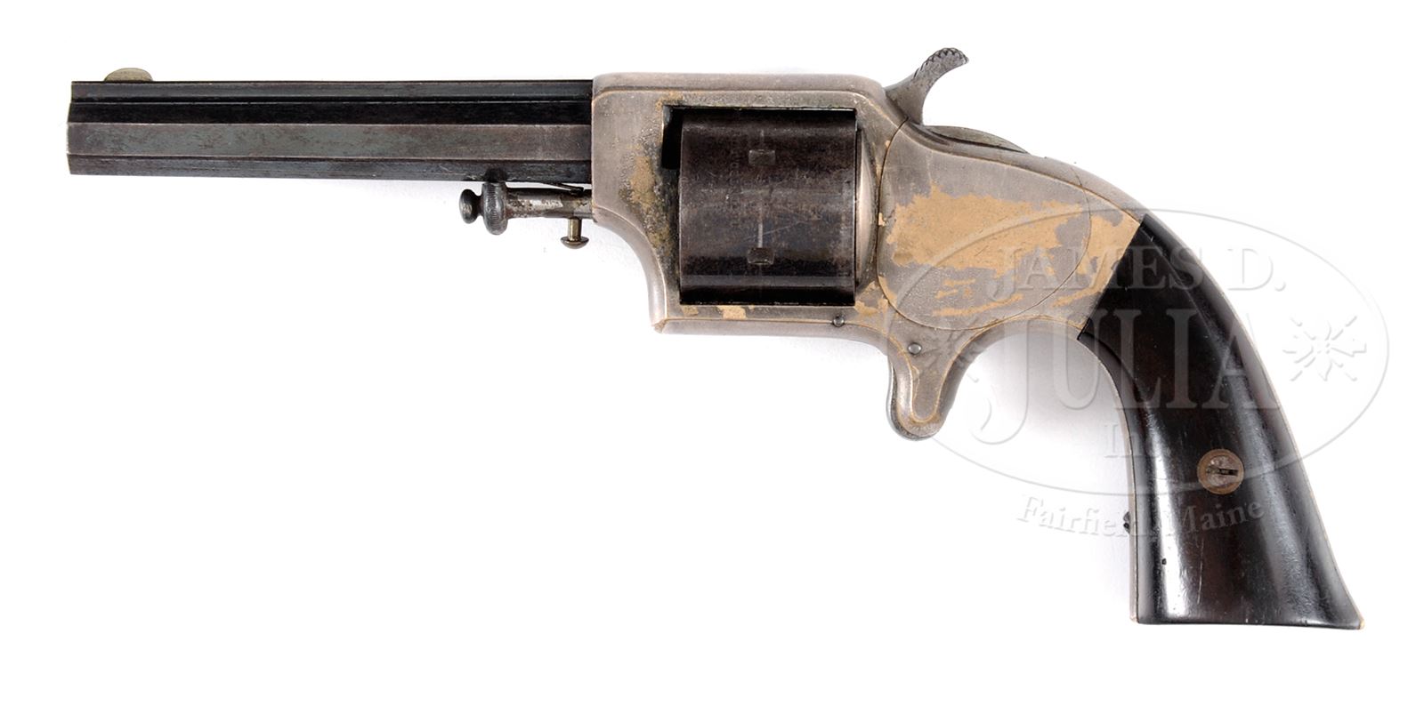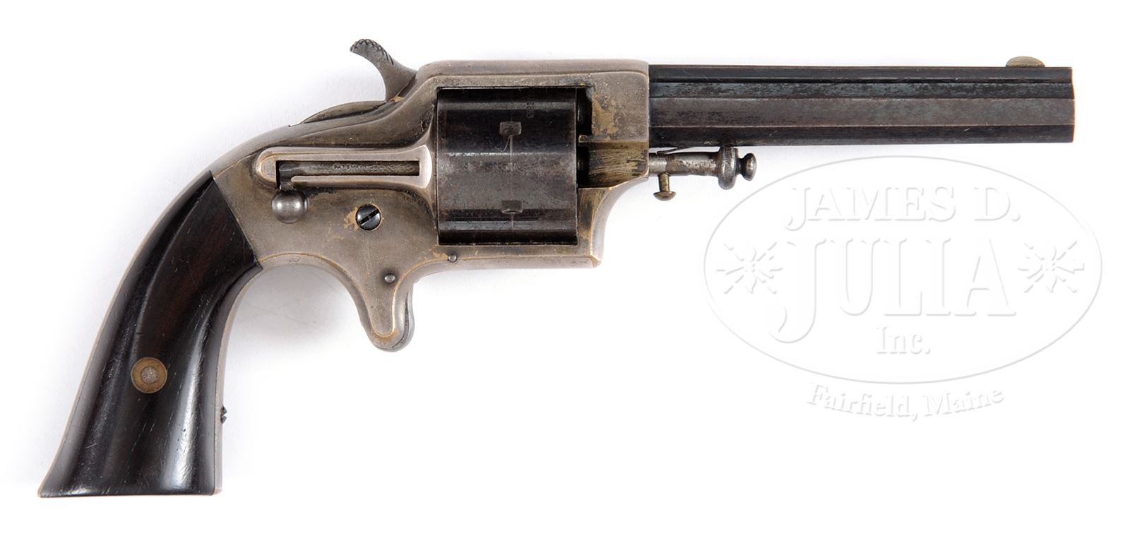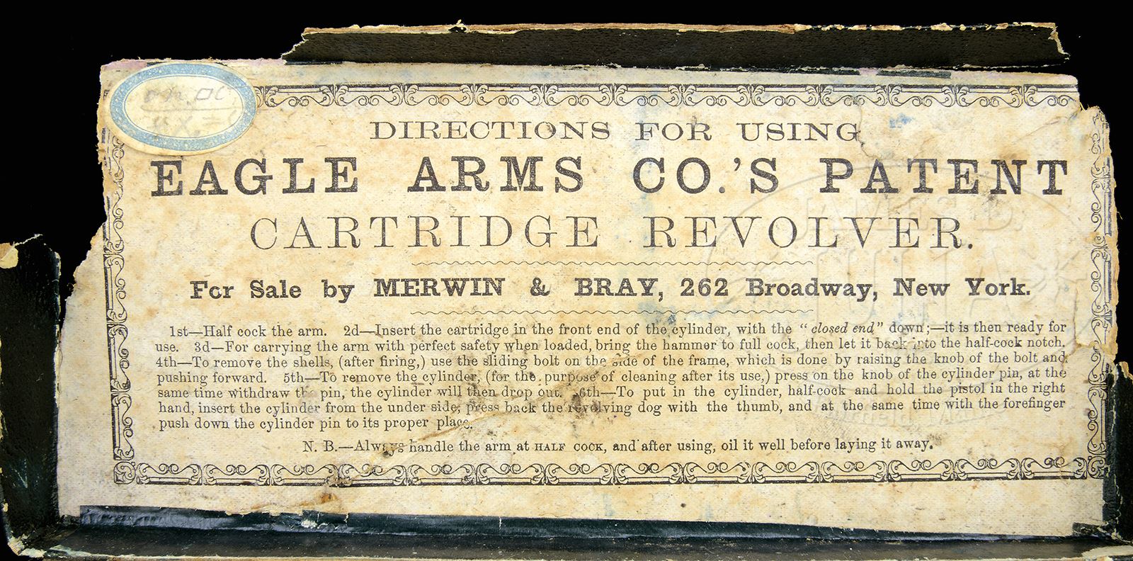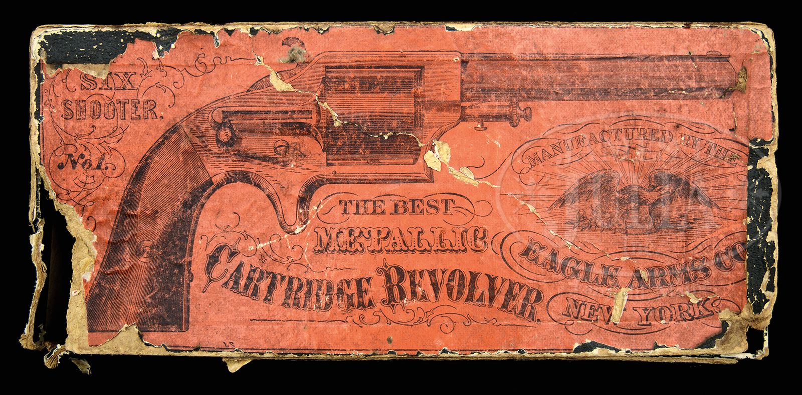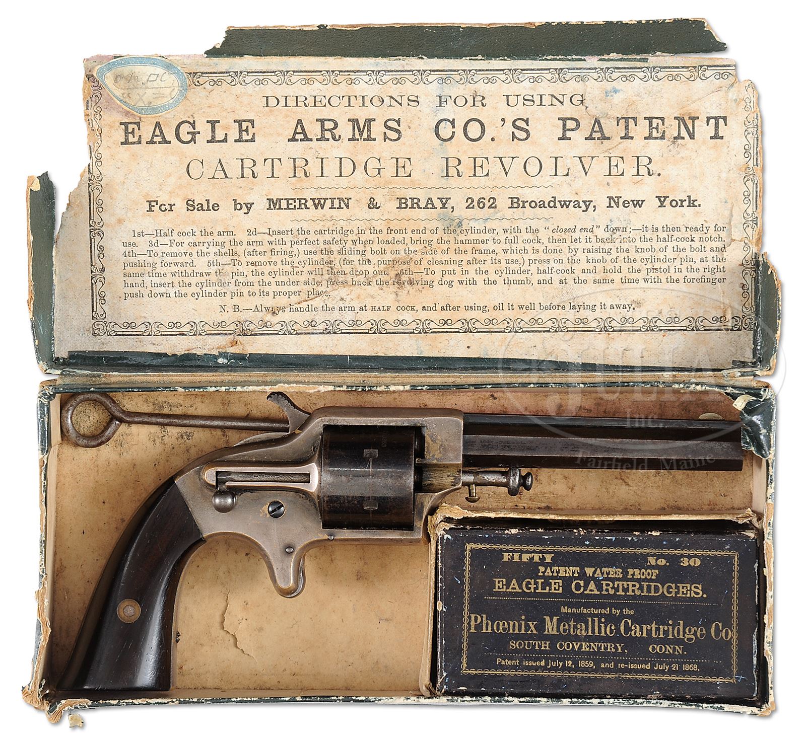 EXTREMELY FINE EAGLES ARMS CO POCKET REVOLVER IN ORIGINAL BOX.SN 8054. Cal. .30. This is a fine example of the Civil War era front loading cup primed pocket revolver with 3-1/2″ blue bbl with top rib marked “EAGLE ARMS CO – NEW YORK”. This example retains most of its finish in a very rare box with orange illustrated label on top. Directions pasted inside top. Compartmentalized for a blue and gold paper labeled orig box for “Eagle Cartridges” retaining one cup fire cartridge. CONDITION: Revolver overall is very fine with bbl and cylinder retaining about 70% thinning blue finish with remainder plum. Frame retains about 80% silver plating. 2-pc rosewood grips are well fit retaining most of their orig varnish. Box presents gun nicely, though bottom corners are missing as can be seen in photograph. Pistol cartridge pack is much better with just minor scuffs and scrapes as can be seen in photos. Cleaning rod in box is very good. Mechanically gun functions well with well defined rifling in bore. 49646-8 JS (3,000-4,000) – Lot 3319