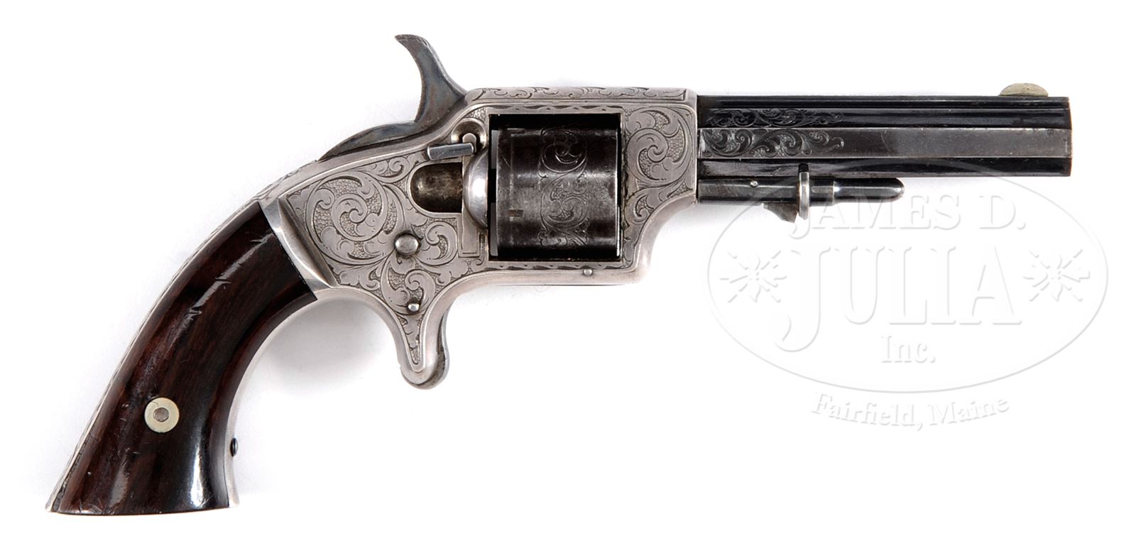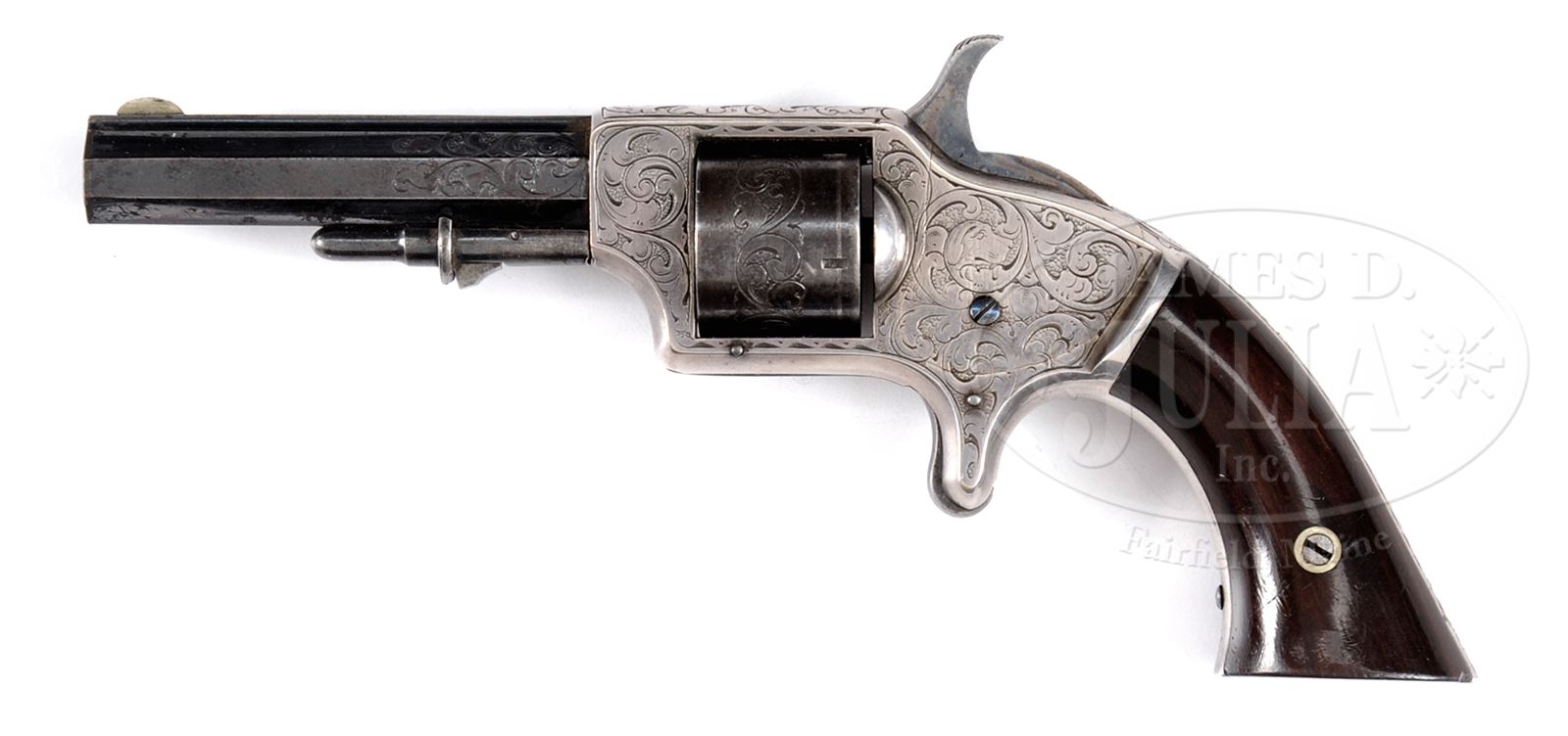 EXTREMELY FINE CASED AND ENGRAVED CIVIL WAR SPRINGFIELD ARMS COMPANY POCKET REVOLVER.SN 4828. Cal. 30. Scarce .30 Cal. rimfire revolver made in 1863 with 3-1/8″ oct bbl with top rail marked “SPRINGFIELD-ARMS-CO-MASS”. Finely engraved in style of Gustav Young with arabesque scrolls on frame, cylinder and bbl, one terminating on left side behind cylinder into Young’s signature dogs head. Frame is silver plated; bbl and cylinder are blued; hammer case hardened. Gun is fitted in fine gutta percha case with brass cleaning tool. CONDITION: Extremely fine overall. Bbl retains about 95% orig bright blue. Cylinder has strong traces of orig blue with balance plum. Hammer retains much of its orig case colored finish. Frame retains virtually all of its silver plate which is slightly toned and contains a well fit pair of rosewood grips which retain most of their orig varnish. Accompanying hard rubber case is in matching fine condition with wear to top velvet decorated pad where cylinder presses into it. Bottom lining is soiled and light stained. Top ear of bbl retaining cradle is broken. Mechanically gun functions well with crisp well defined bore. 49646-7 JS (4,000-6,000) – Lot 3320