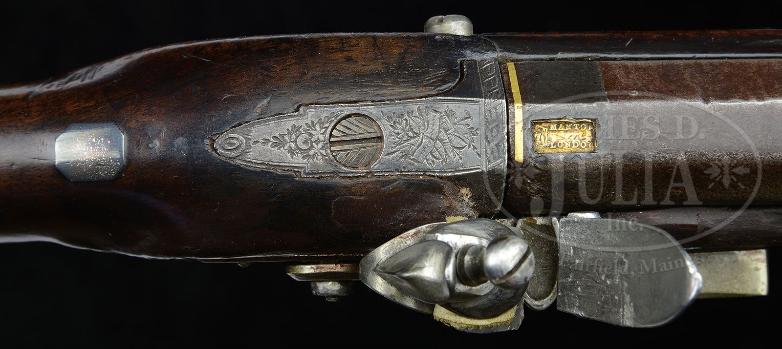 JOHN MANTON, LONDON HALF-STOCK FOWLER.Cal. 10 ga. 33-3/4″ oct to rnd bbl, bbl has a damascene treatment, and there is a gold cartouche inlaid at the breech “MANTON LONDON”, also, there is a silver touch-hole “bushing”, the orig flintlock is also signed “MANTON”. Walnut stock has a curved cheek rest and also an engraved trigger guard, and a hornnose-cap. PROVENANCE: Guy A. Ritter Collection. CONDITION: Good. Appears to have orig finish. The gun has wrist checkering that is somewhat visible, but gun shows evidence of much use, but otherwise well cared for. Typically, the wood in front of the lock appears to have been replaced or repaired, as well as the area behind the lock on the bbl. 4-51588 SDH17 (1,000-1,500) – Lot 3322
