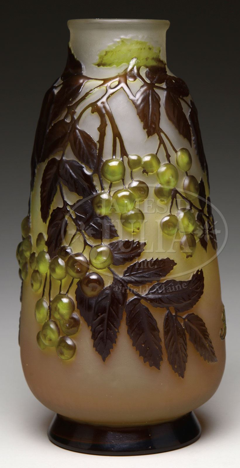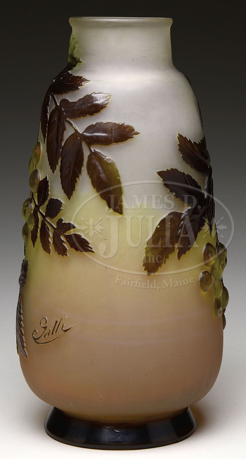 GALLE MOLD BLOWN VASE.Galle vase is mold blown in a pattern of brown leaves and green berries descending from the neck and encircling the vase. The decoration is set against a brown shading to yellow shading to frost background. Vase is signed on the side in cameo “Galle”. SIZE: 11-1/2″ t. PROVENANCE: James Boma Collection. CONDITION: Very good to excellent. 5-69646 (6,000-8,000) – Lot 3326