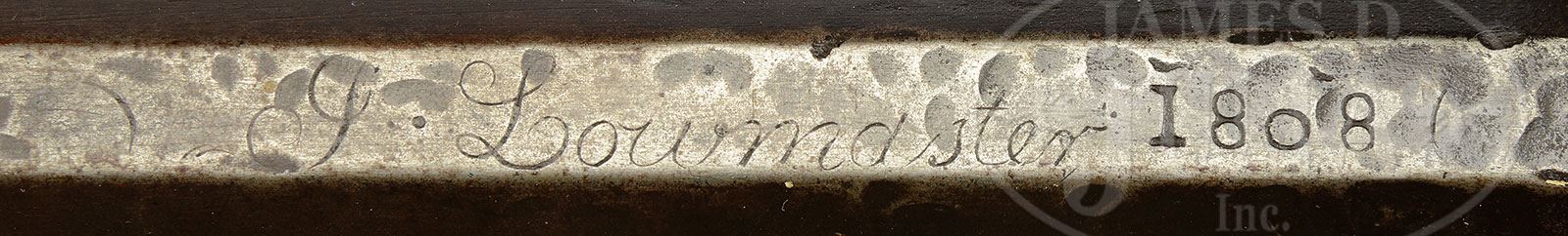 J LOWMASTER FOWLER DATED 1808.SN NSN. John Lowmaster according to most references moved from York, PA to Ohio about 1805 so this massive country fowler with 72 cal bore with 2-stage bbl measuring 45″ and 60″ overall was probably made in Ohio. Gun is brass mounted with exception of a silver oval thumbplate with initials in script “PG”. Gun is mounted with dovetailed fixed rear sight, a brass blade to a dovetailed iron based front sight. Lock is Ketland agent marked. There is no incised carving typical of Lowmaster’s Pennsylvania guns though brass hardware appear in style found on his other guns as does forged trigger with circular rear cutout. Rarely are offered dated Kentucky rifles by such well known makers in the early 19th century. CONDITION: Lock is poorly fit and is most likely changed. There is inset wood forward of lock and gun exhibits a thin varnish that covers other wood restoration in forestock. There are four key-ways cut in stock with second key missing. Middle two key-ways are non-functional as there are pinned bbl attachments a few inches from them showing that stock was probably a modification made after bbl was made. Front thimble is replaced. There is a 3/4″ braised repair to front tail of lock escutcheon. Functionally gun is very sloppy and will not hold at full cock. Bore is rusted and pitted. 4-76380 JS326 (5,000-7,000) – Lot 3326