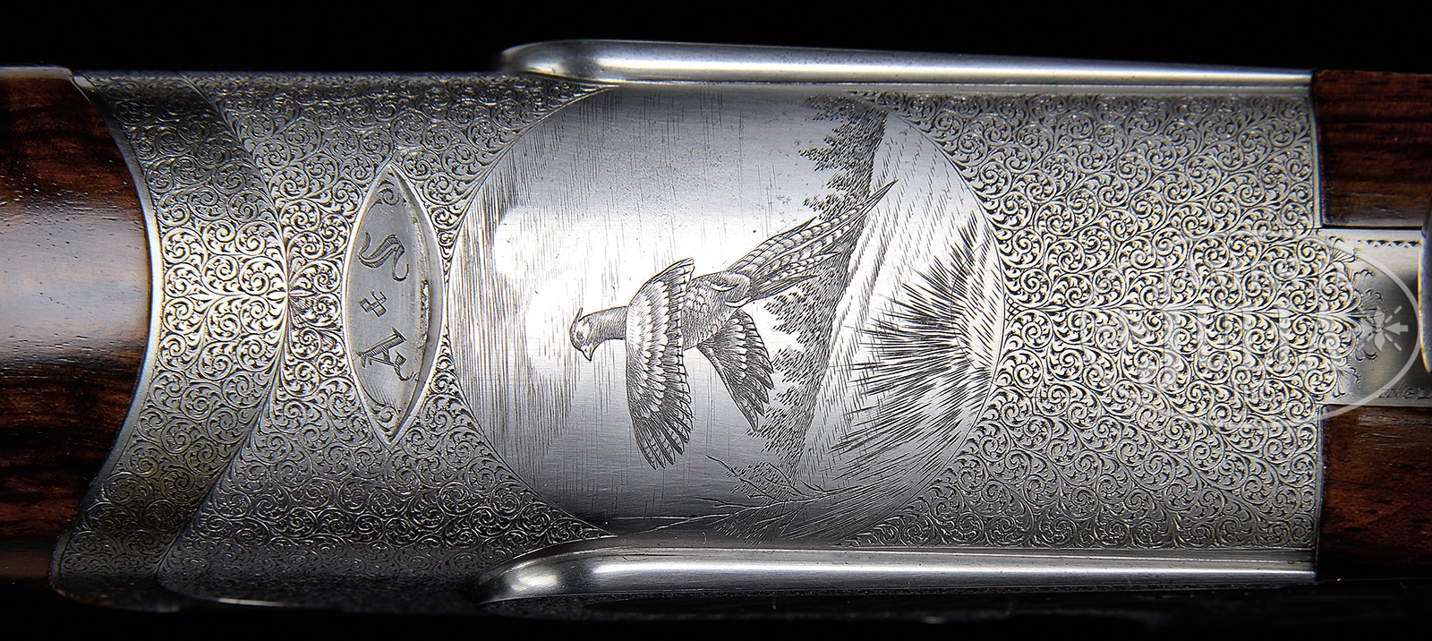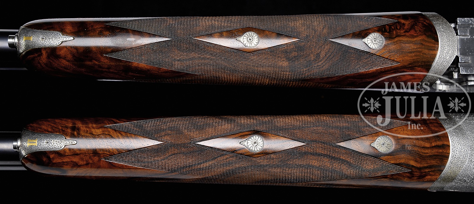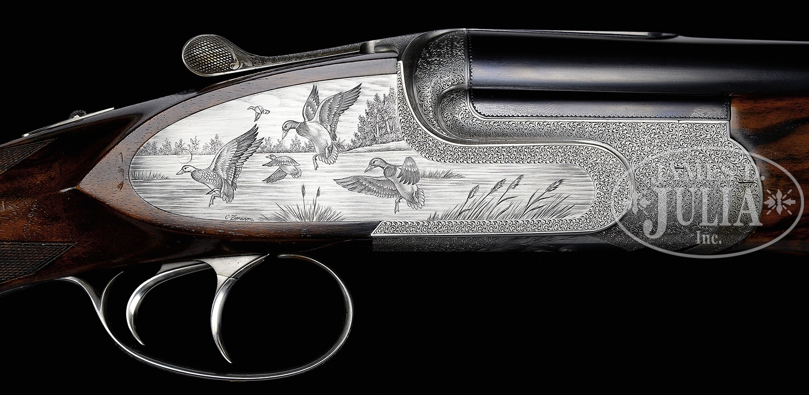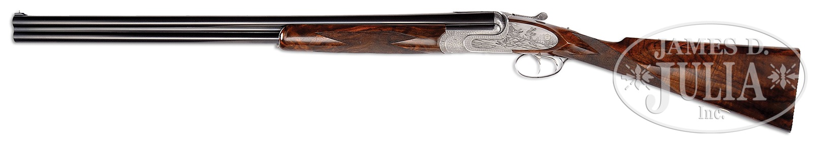 *TOP OF THE LINE ABBIATICO & SALVINELLI JOREMA ROYAL DELUXE OVER-UNDER SIDELOCK EJECTOR GAME GUN WITH SUPERB SCROLL BY DASSA AND BULINO GAME SCENES BY TOMASONI, WITH EXTRA BARRELS AND CASE.SN 1146. Cal. 12 ga. 2-3/4″ Chambers. Two sets of 27″ demi-bloc bbls engraved “ABBIATICO & SALVINELLI” on tops, have “I” or “II” gold inlaid on 2″ scroll engraved Nock form at breech ends. Front bead is on small short ramp at muzzles. Bbl flat is stamped with 1995 Italian nitro proofs, SN, and “A&S”. Importers name and address (Ed Hinkle, Lexington, NC) is on each bottom bbl. Coin finished, well filed, low profile, OU action fitted with pinless sidelocks (dismounting pin with hex key spring-loaded access), features non-automatic safety (SAFE engraved) and dbl triggers (front articulated). Action is engraved with near full coverage very well cut, minuscule shaded scroll by Dassa, whose signature is on trigger plate. This attractive scroll surrounds bulino game scenes by Claudio Tomasoni, whose signature is at the bottom of each scene on lockplates. Left plate depicts four chukar partridge taking wing from open hillside, and right plate depicts five mallards settling into marshy pond, grass in foreground. Bottom of action depicts a rising cock pheasant. This scene is unsigned. Single beaded trigger guard has more scroll surrounding oval with gold inlaid portrait of a grouse. SN is in gold on tang. Attractively figured and nicely marbled European walnut straight grip buttstock measures 14-5/16″ over fully checkered wood butt. Closely spaced point pattern checkering with line borders is at grip. A gold oval on toe line is engraved “PJG”. Each bbl set has its own slim, matching forend with Anson type release with “I” or “II” inlaid on tip. BBL set “I”: Bore diameter: top -.729, bottom – .723. Bore restrictions: top – .008 (IC), bottom – .002 (skeet). Drop at heel: 2-1/16″, drop at comb: 1-7/16″. Cast: approx 1/4″ off. Weight: 6 lbs. 10 oz. LOP: 14-5/16″. BBL set “II”: Bore diameter: top -.724, bottom – .724. Bore restrictions: top – .031 (full), bottom – .019 (mod). Drop at heel: 2-1/8″, drop at comb: 1-7/16″. Cast: approx 1/4″ off. Weight: 6 lbs. 11 oz. LOP: 14-5/16″. High quality leather two gun motor case with stitched leather corners is lined in dark green cloth, and has black leather A&S label stitched into lid. Case contains lock removal tool. CONDITION: Excellent, essentially as new, with only the faintest of handling and assembly marks on all metal and wood surfaces, with little evidence of firing since proof. Mechanically crisp. Case leather has a few minor rubs and scuffs. Interior has some light compressions. A superb lightweight 12 bore OU. 50819-5 MGM179 (30,000-40,000) – Lot 3327
