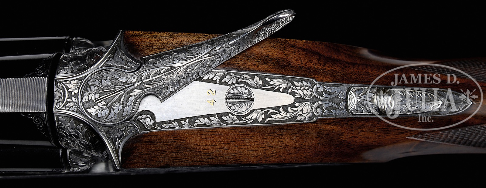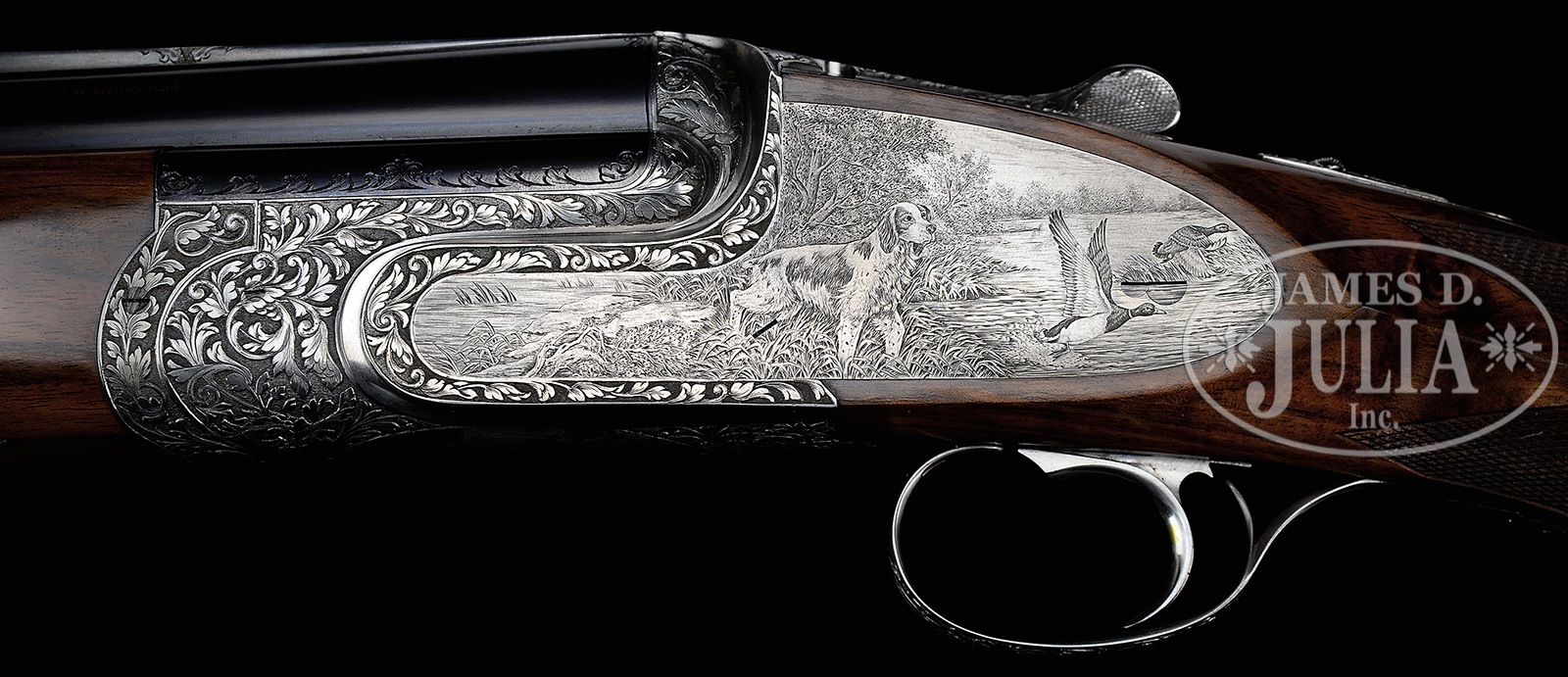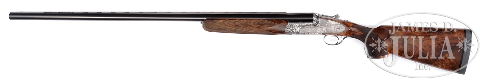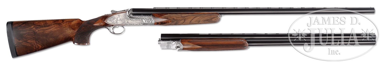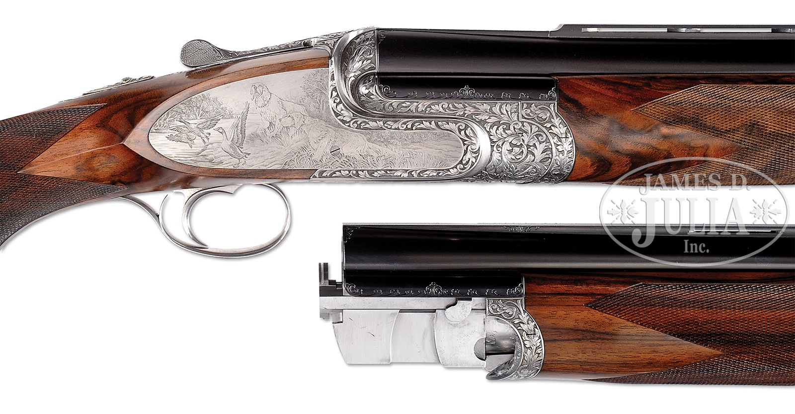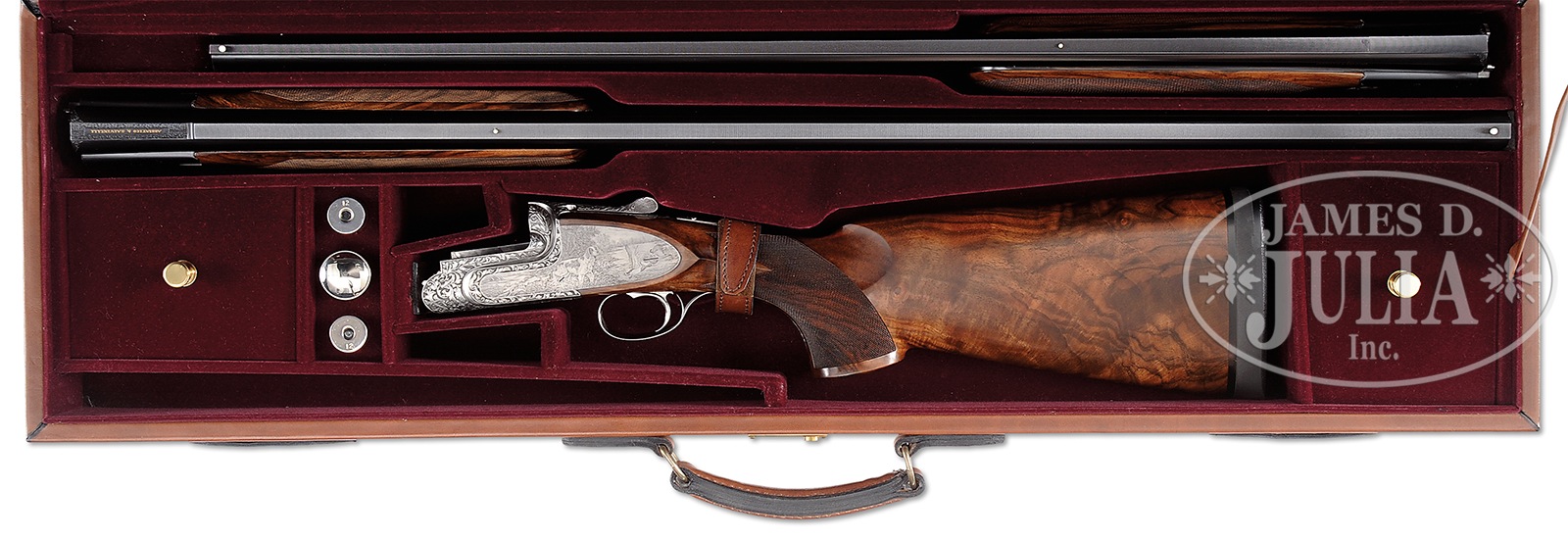 SN 760. Cal. 12 ga. 2-3/4″ Chambers. Two sets of demi-bloc bbls, one single trap 33-3/4″ bbl, another set for double trap or clays is 30″. Both are fitted with matted, ventilated ribs; singles trap set raised and with “ABBIATICO & SALVINELLI” in gold on riband surrounded by scroll on breech section. Makers name is on left side top bbl of OU set. Bottom flat is stamped with 1986 Italian nitro proofs for 2-3/4″ chambers. Coin finished, well filed, low profile, OU action fitted with pinless sidelocks features non-automatic safety (SAFE engraved) and single non-selective trigger. Action is engraved with near full coverage very well carved, relief medium scrolling acanthus. This fine acanthus scroll surrounds bulino dog and game scenes by A. Galeazzi, whose signature is at extreme right of scene on right lockplate. Left plate depicts a Springer spaniel standing on spit of land surrounded by marsh, larger trees in background, watching while a pair of mallards take flight. Right lock portrays a pair of golden retrievers watching as a trio of ducks take flight from bank of river. Scene on bottom of action is a fine face-on full portrait of a Brittany spaniel. Makers name is inlaid in gold on bottom of forend iron, and “42” (significance unknown) is in gold on top strap under lever. Relief scrolling acanthus extends to single beaded trigger guard which has SN gold inlaid on tang. Finely marbled and stump figured European walnut extreme flared pistol grip buttstock measures 14-1/2″ over black Decelerator clays pad. Closely spaced borderless point pattern checkering is at diamond grip with right hand palm swell. Gold monogram “IBR” (?) is inlet into toe line. Each bbl set has its own matching semi-beavertail one piece forend with Anson type release. Single Trap BBL: Bore diameter: .735. Bore restrictions: .036 (full). Drop at heel: 1-5/8″, drop at comb: 1-7/16″. Cast: Neutral. Weight: 9 lbs. 1 oz. LOP: 14-1/2″. OU BBLS: Bore diameter: top -.725, bottom – .724. Bore restrictions: top – .022 (mod), bottom – .038 (full). Drop at heel: 1-7/8″, drop at comb: 1-7/16″. Cast: Neutral. Weight: 8 lbs. 7 oz. LOP: 14-1/2″. Brown leather case with stitched leather corners by Nizzoli, is lined in purple velvet, and has brown leather A&S label stitched into lid. Case is semi french fitted for action and both sets of bbls, and contains straps, snap caps, and a striker bottle with a pair of spare mainsprings and strikers. CONDITION: Excellent, very close to new, with only the faintest of handling and assembly marks on all metal and wood surfaces, with little evidence of firing since proof, with very faint firing halos on breechface. Mechanically crisp. Case leather has a few minor rubs and scuffs. Interior has some light compressions. An exemplary dual purpose target gun, nicely appointed. 50819-14 MGM185 (28,000-38,000) – Lot 3328