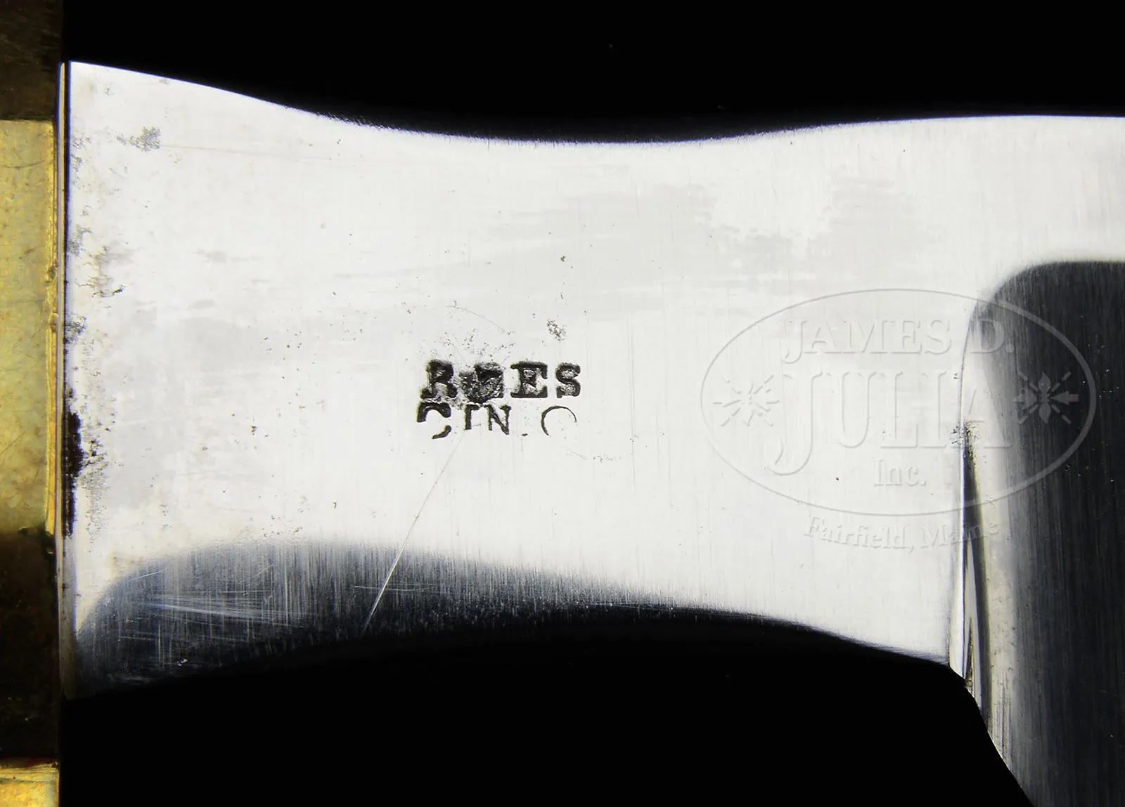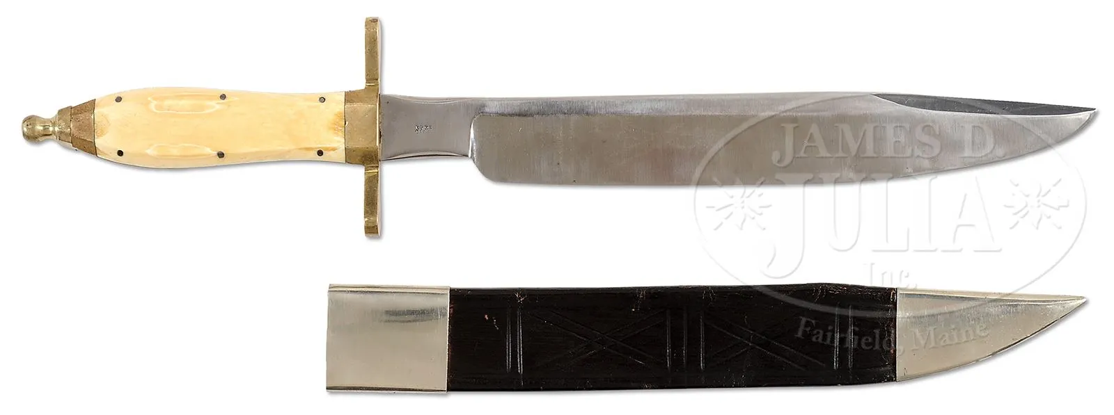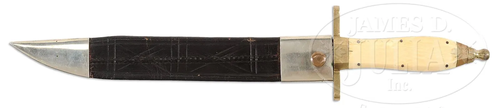 EXTREMELY RARE AND UNIQUE REES CINCINNATI MADE BOWIE KNIFE.The first recorded advertising offering Bowie knives for sale was by Marks & Rees of Cincinnati, Ohio who were known surgical instrument makers. In the October 21, 1835 edition of the Daily Gazette, Marks & Rees offered “… all kinds of Bowie knives on hand, of their own manufacture, finished in a superior style”. Their claim of “superior quality” was not overstated, as is seen in the few examples of their work. The two known examples of Marks & Rees Bowie knives are typical wood handled coffin grips much like the attributed James Black or the unique specimen of a silver mounted coffin hilt also in this sale. Sheldon Kellogg’s 1834-1835 journal (Ohio Historical Society) has entry that reads “…returned with a formidable knife in his hand, saying, “there is something that won’t miss fire –no flash in the pan about that”. He pulled the knife from its sheath and flourishing it about before the admiring eyes of both black and white, said “there, that knife was made expressly for me by Resin Bowie, and you’ll find that its first rate stuff. Accept it from me” with my good wishes for a safe return to Cincinnati”. Sheldon Kellogg’s home was on same road as Marks & Rees according to the consignor. This knife was part of the State of Arkansas Exhibit “A Sure Defense – The Bowie Knife in America”. It was tagged C1837-1850’s, an unusual design by one of the partners in the famous firm of Marks & Rees, makers of early coffin handle Bowie knives. This is the only example bearing his mark”. Rees of Cincinnati was a well known surgical tool maker after his partnership with Marks. Identical mark “REES / CIN. O” is found on surgical tools. A complete set of Rees marked “U.S. Medical Department” Field Surgeon’s Kit is pictured on page 300 of James Edmondson’s American Surgical Instruments: An Illustrated History of Their Manufacture and a Directory of Instrument Makers to 1900. Dr. Edmondson, curator of the Dittrick Museum of Medical History, Case Western Reserve University produced without doubt the best reference on American surgical instrumentation. This massive knife is the only example of a Rees Bowie. It measures over 16″ with about an 11″ blade which is .28″ thick at ricasso with a 3-1/4″ sharpened clip. The blade still retains a near razor edge. The knife is uniquely mounted with a solid, heavy brass hilt with brass threaded finial with matching shaped hexagonal sides at base. Two 3-3/4″ “certifiable antique elephant ivory” slabs which are pinned with six steel pins on either side. Scabbard is tooled leather with German silver mounts and cast brass frog button which fits knife quite well. This is the only known example of this Antebellum and Civil War surgical tool maker who must have made this special order knife for a special client. PROVENANCE: Displayed as part of the Historic Arkansas Museum “A Sure Defense: The Bowie Knife in America” Exhibit. Special Note: This item contains or is made of ivory. Do not bid on this lot unless you have read and agreed to our "Ivory Position Statement" and the "Waiver of Legal and Financial Risk to James D. Julia in regards to your Purchase of an Ivory Object." This information is located in the front section of our catalog. CONDITION: Very fine overall. Blade retains some orig polish though blade has been re-polished with light pinprick pitting seen scattered on areas of blade. Tip was probably a 1/4″ longer, but has been polished to new tip and there are several small nicks in cutting edge. Markings are discernible though the “O” in address is only half visible from polish. Grip and brass handle show yellow mustard colored patina. The pommel which is slightly turned askew has a lighter brass patina. The accompanying scabbard which appears orig and fits well with German silver mounted with a copper patinaed frog button. Leather body is sound and solid with crosshatched decoration not untypical of the Civil War though this knife could be much earlier. Ivory is sound and solid with good patina with numerous small surface scuffs and scratches and a few small hairline cracks. 49637-2 JS IVORY (20,000-30,000) – Lot 3331 Click here to view provenance