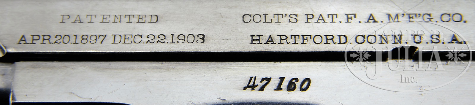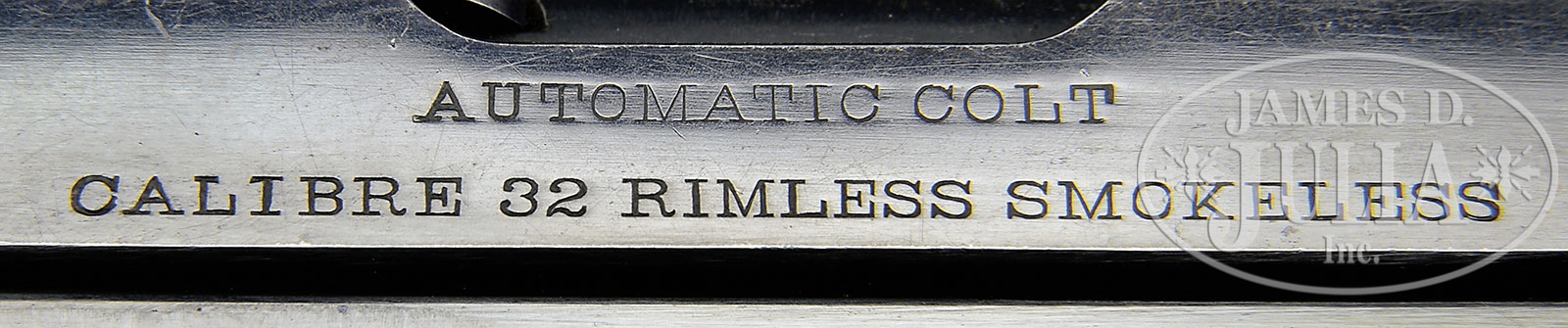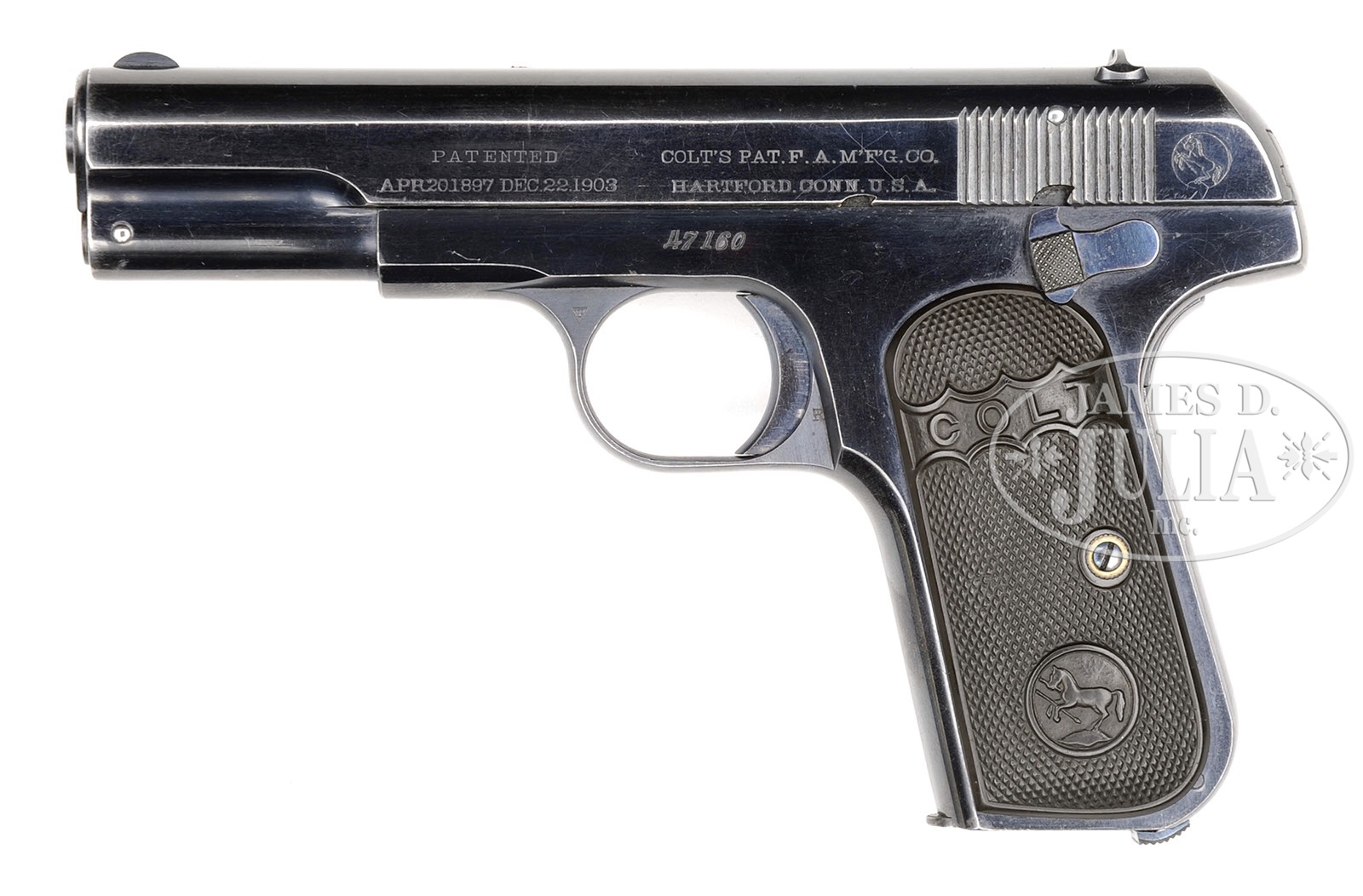 *EXTREMELY FINE COLT MODEL 1908 AUTO PISTOL.SN 47160. Cal 380. This is an excellent condition example of the popular 1908 Colt auto pistol, this particular example made in 1921. This gun is in standard configuration of the other 138,000 guns made with 7 shot magazine and 3-3/4″ bbl. Grip is checkered hard rubber with Colt motif and rampant Colt. This gun is finished in blue and appears orig and authentic throughout. PROVENANCE: Tommy Rholes Estate Collection. CONDITION: Gun retains most of its bright orig blue finish with exception of light reduction and thinning of blue on rear grip strap. Mechanics are excellent and bore is crisp and shiny. 4-50721 JS231 (1,000-2,000) – Lot 3333
