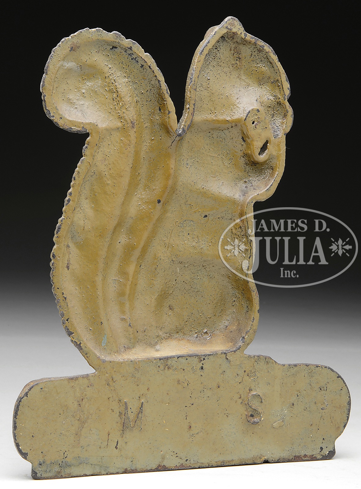 RARE SQUIRREL WITH NUT DOORSTOP.Circa 1920, Bradley and Hubbard Foundry, West Meriden, Connecticut. This excellent cast iron example depicting a squirrel on a log eating a nut. Stamped on the back of base “M S”. Reference: The Doorstop Book by John and Nancy Smith, page 158. SIZE: 11-1/2″ h x 9-3/4″w. CONDITION: Fine casting details with original painted surfaces with normal and expected minor rust spots and minimal chips to paint. Very good overall. 9-91521 (500-700) – Lot 3341 Auction: Advertising, Toy & Doll - Spring 2014 Please Note: All prices include the hammer price plus the buyer’s premium, which is paid by the buyer as part of the purchase price. The prices noted here after the auction are considered unofficial and do not become official until after the 46th day. |