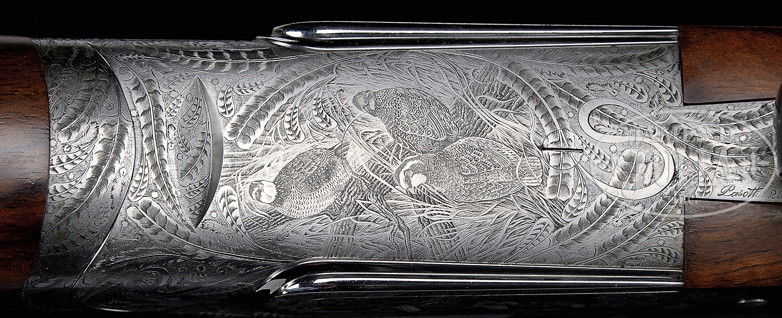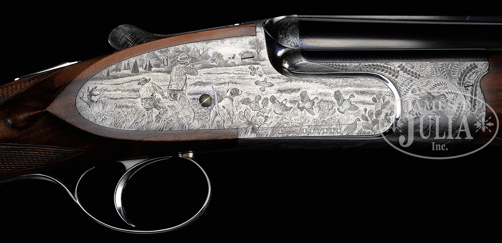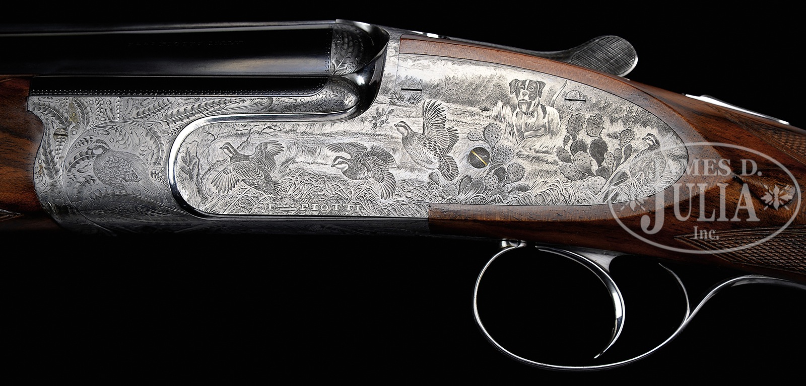 *FINE SMALL BORE PIOTTI “BOSS” OVER-UNDER SIDELOCK GAME GUN WITH INTERESTING BULINO ENGRAVING (QUAIL) BY PASOTTI.SN 9760. (2003) Cal. 20 ga. 3″ Chambers. 28″ Demi-bloc bbls fitted with solid matted rib, are engraved “Flli PIOTTI ITALY” on left side of top bbl. Bbl flat is stamped with 2003 Italian nitro proofs. Rear portion of rib, top lever, and front portion of forend are gold inlaid “1”. Beautifully filed, coin finished, low profile OU action features non-automatic safety, gold line tumbler end cocking indicators, and single non-selective trigger. Action is engraved with an unusual treatment of feathers of various birds arranged as scroll, surrounding vignettes of quail; a recumbent quail on left side, flying quail on right, and bottom of action depicts a trio of quail perched on tree trunk amongst grass. Rear sides of action and lockplates continue the theme with a pointer pointing a covey of quail taking flight in dry southwestern environment. Right side depicts a pointer and two hunters with quail flushing, one hapless member of the covey has been hit. Makers name is at bottom of each sideplate scene. Single beaded small bow trigger guard has portrait of head-on flying quail on bow, and SN on tang. Engravers signature and date “Pasotti 2003″ are on trigger plate. Well marbled and lightly figured European walnut round knob pistol grip buttstock measures 14-5/8″ over thin black Decelerator pad, and features drop points and typical point pattern checkering. Matching one piece forend has Anson type release. Bore diameter: top -.619, bottom – .620. Bore restrictions: top – .009 (IC), bottom – .014 (mod). Drop at heel: 2-3/8″, drop at comb: 1-7/16″. Cast off approx 1/2″. Weight: 6 lbs. 7 oz. LOP: 14-5/8”. CONDITION: Excellent, near new, with evidence of exceptionally light field use, with only a few light handling and assembly marks on all orig factory finishes. Mechanically crisp. This gun has a present retail of over $70,000.00, without extra for special engraving. Gun no. “2” (Dove) of this set, is also in this auction, along with a matching 12 bore with dove and quail motif. Stocks of all three guns match exceptionally well. 50401-2 MGM39 (25,000-40,000) – Lot 3341 Click here to view provenance