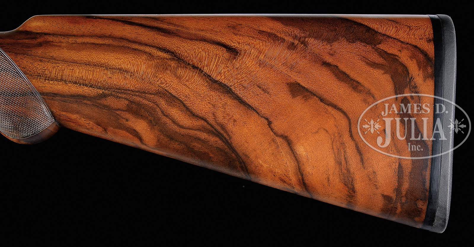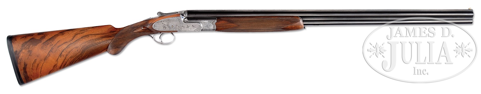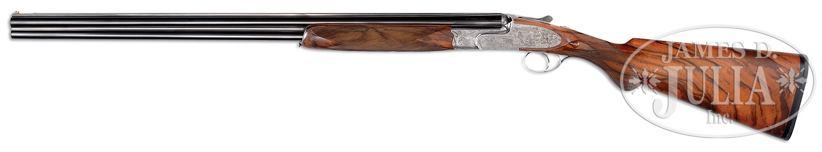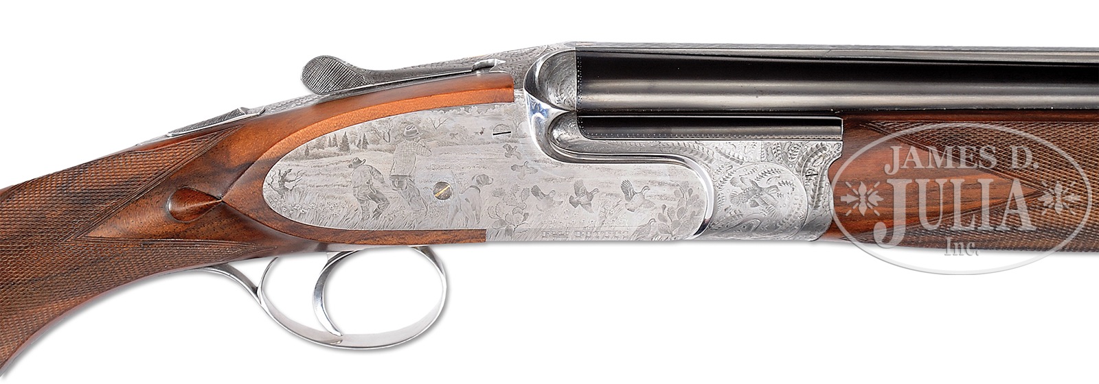 *FINE SMALL BORE PIOTTI “BOSS” OVER-UNDER SIDELOCK GAME GUN WITH INTERESTING BULINO ENGRAVING (QUAIL) BY PASOTTI.SN 9760. (2003) Cal. 20 ga. 3″ Chambers. 28″ Demi-bloc bbls fitted with solid matted rib, are engraved “Flli PIOTTI ITALY” on left side of top bbl. Bbl flat is stamped with 2003 Italian nitro proofs. Rear portion of rib, top lever, and front portion of forend are gold inlaid “1”. Beautifully filed, coin finished, low profile OU action features non-automatic safety, gold line tumbler end cocking indicators, and single non-selective trigger. Action is engraved with an unusual treatment of feathers of various birds arranged as scroll, surrounding vignettes of quail; a recumbent quail on left side, flying quail on right, and bottom of action depicts a trio of quail perched on tree trunk amongst grass. Rear sides of action and lockplates continue the theme with a pointer pointing a covey of quail taking flight in dry southwestern environment. Right side depicts a pointer and two hunters with quail flushing, one hapless member of the covey has been hit. Makers name is at bottom of each sideplate scene. Single beaded small bow trigger guard has portrait of head-on flying quail on bow, and SN on tang. Engravers signature and date “Pasotti 2003″ are on trigger plate. Well marbled and lightly figured European walnut round knob pistol grip buttstock measures 14-5/8″ over thin black Decelerator pad, and features drop points and typical point pattern checkering. Matching one piece forend has Anson type release. Bore diameter: top -.619, bottom – .620. Bore restrictions: top – .009 (IC), bottom – .014 (mod). Drop at heel: 2-3/8″, drop at comb: 1-7/16″. Cast off approx 1/2″. Weight: 6 lbs. 7 oz. LOP: 14-5/8”. CONDITION: Excellent, near new, with evidence of exceptionally light field use, with only a few light handling and assembly marks on all orig factory finishes. Mechanically crisp. This gun has a present retail of over $70,000.00, without extra for special engraving. Gun no. “2” (Dove) of this set, is also in this auction, along with a matching 12 bore with dove and quail motif. Stocks of all three guns match exceptionally well. 50401-2 MGM39 (25,000-40,000) – Lot 3341 Click here to view provenance