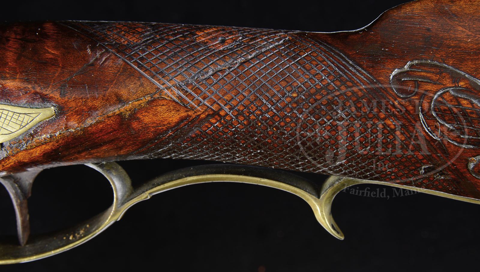 GEORGE BRENEISE KENTUCKY RIFLE.Cal. 50 rifled. 40-3/4″ oct bbl, George Breneise was a gun maker in York County and his work is uncommon. This rifle has remnants of his signature at the very breech end of the bbl, because the bbl and the stock were shortened by 3″; thus the signature is located at the juncture of the bbl tang and the breech. The curly maple stock, does have a pleasing, mellow color and is very nicely incised carved along the cheekpiece side and also has wrist-checkering. There is also incised carving around the rear ramrod pipe and the forestock has a very vine molding. The finely engraved patchbox is similar to those seen on a few other of his signed rifles. PROVENANCE: Collection of Dr. Douglas Sirkin. CONDITION: The finish gives the appearance of its first surface. The replaced flintlock is a reconversion and is a replacement lock for the percussion lock that was used in the gun when it was shortened. The wood surrounding the entire lock is a thick veneer set all around to accommodate the new lock. There is a break through the wrist which is held together with screws covered over by putty. A re-glued age crack is on the right side of forearm. 4-49767 SDH24 (20,000-30,000) – Lot 3343 Click here to view provenance