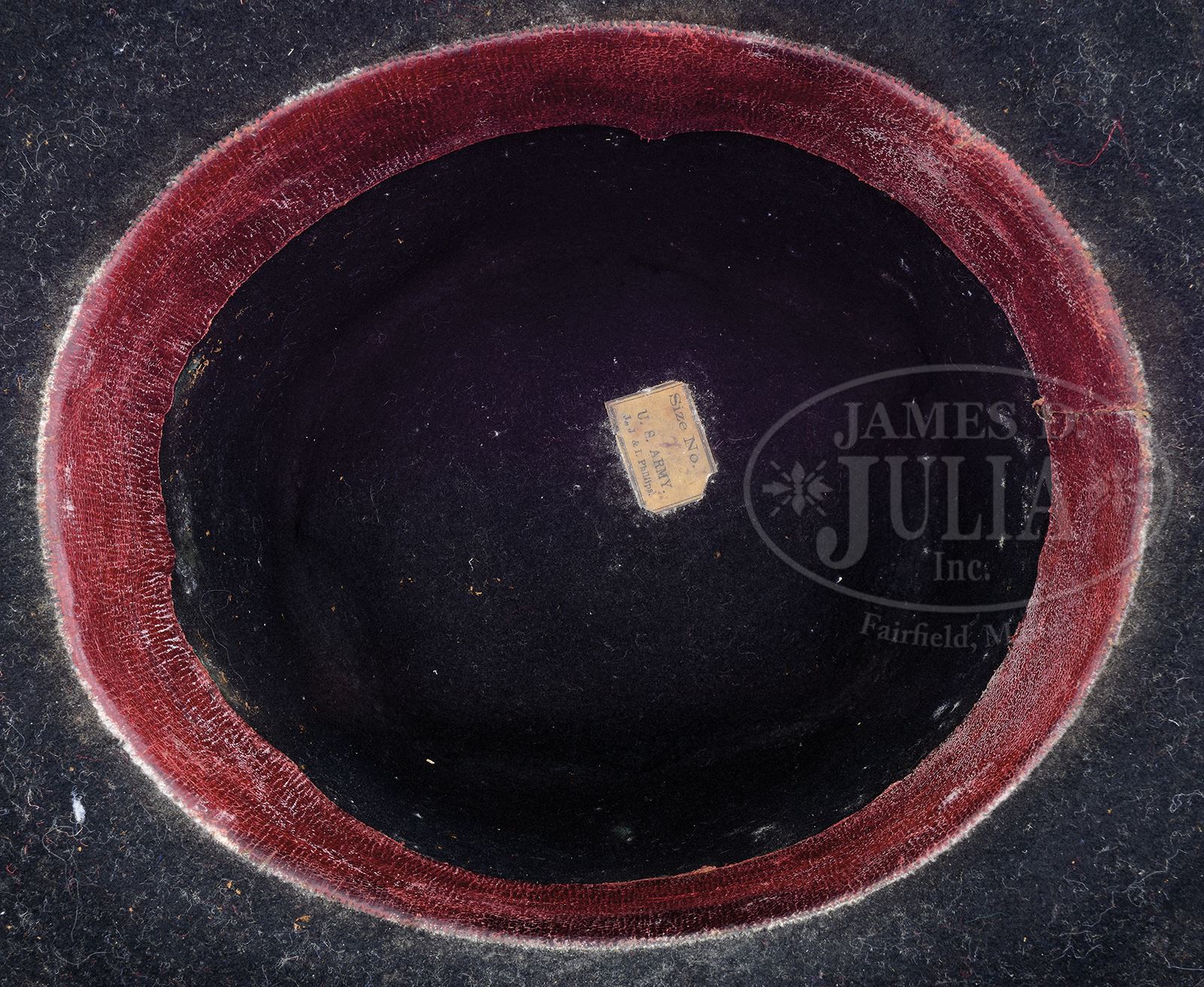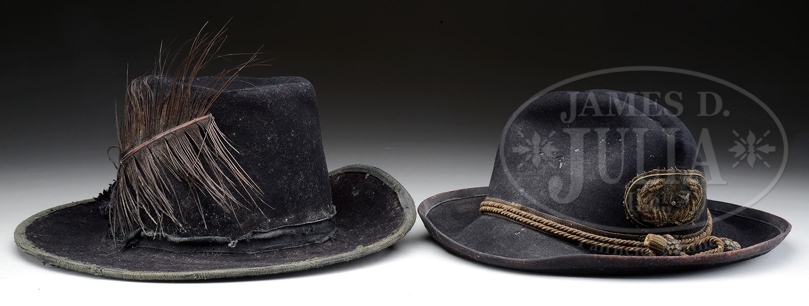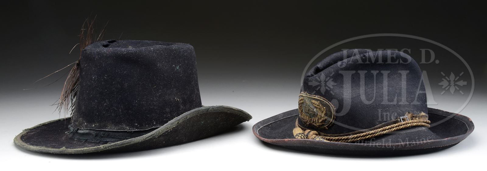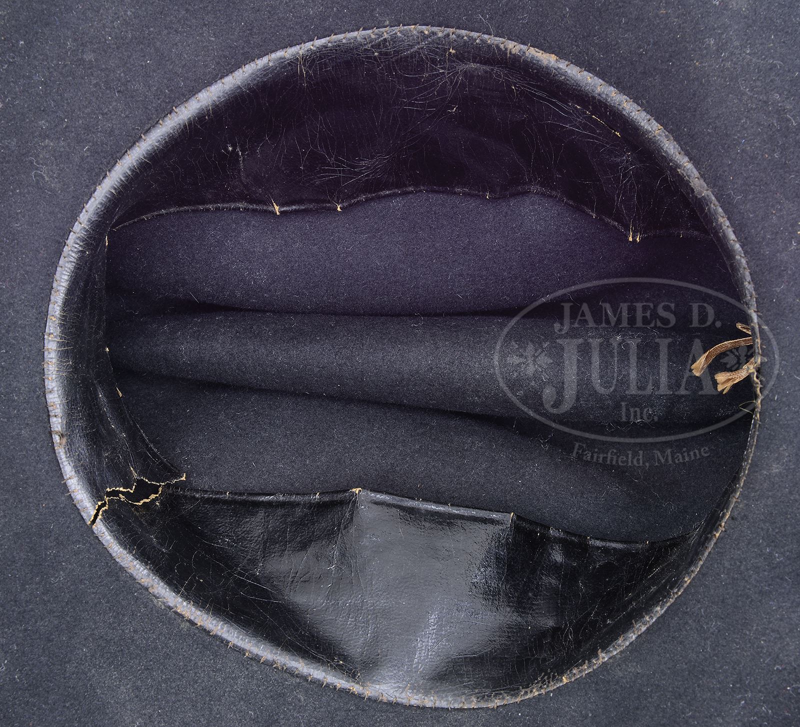 CIVIL WAR SLOUCH HAT, HARDEE HAT, TINTYPE OF POLHEMUS SMITH, 9TH NEW YORK HEAVY ARTILLERY.Just found in upstate New York estate were two fine Civil War hats along with small box containing 1/6th plate tintype of soldier full view with musket and gear wearing kepi with crossed cannons, most likely a “9” and “I” above and below the insignia. There is an 1889 & 1890 reunion ribbon for the 9th NY and the bottom of box is written “Polhemus Smith’s hat cord, buttons and badges from the war”. Box does contain a hat cord, GAR hat insignia, and eight GAR buttons. A quick search of the internet for Polhemus Smith shows him enlisting in the 9th NY Heavy Artillery, Company I, 12/21/1863, and being transferred in June 1865 to the 2nd NY Light Artillery, and later a promotion 7/6/1865 as an Articifer. Both pieces of head gear appear original and as found. The slouch hat has a wide 2-1/4″ hard sweatband with a 3/8″ sewn binding. It also has about 1/2″ wide black & brown binding with a small japanned brass buckle and hat cord, all which appear orig to hat, including the embroidered U.S. hat insignia which is sewn with the same contemporary thread found attaching band. Hardee hat has 2″ thin Moroccan sweatband with a small pasted Army contract label inside top of crown. A fairly tattered feather is sewn to side of hat terminating in a silk cockade. Around crown is a 5/8″ binding with similar binding around edge perimeters. We have no doubt both of these hats are Civil War, though slouch hat appears to be a smaller size than the Hardee. Though the hats have no names or Unit markings, we are only guessing that these Civil War hats were his or his family because of the identification of the other artifacts found in same yard sale. Regardless, this is a fine pair of Civil War field hats rarely found “undisturbed”. CONDITION: Thread box that holds buttons, insignia, photograph and ribbons is broken at corners, but has preserved the ribbons and buttons quite well. Tintype shows good contrast with considerable crazing, small creases and rust on reverse. There is an accompanying single Belgium or European shot pistol in poor to fair condition overall, old cleaning, rust & pitting overall, is not mechanically functional. Hardee hat is sound & solid, sweatband is complete, orig, as is. Contract label which is marked “Size No. 7 U.S. Army J.J.&I. Phillips”. Hat has several holes at perimeters of crown. Feather cockade firmly attached, both being worn. Binding ribbons both fairly complete with wear & reductions, some loose threads, as can be seen in photos. Hat overall is dirty, soiled with some mildew. Left side was originally sewn to body, and small cuts are seen in front inside of hat where Jeff Davis hat insignia & other insignia were originally attached to the front. Slouch hat is very good overall with several holes from insects. Binding worn at edges. Sweatband has several tears, but is otherwise complete. 49083-1 JS (6,000-8,000) – Lot 3343