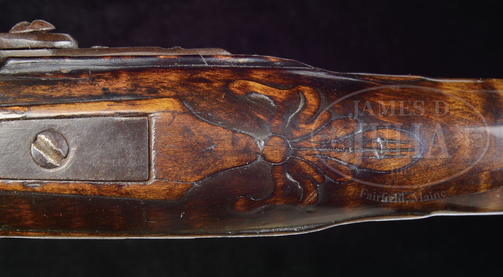 WONDERFUL YORK COUNTY UNSIGNED GEORGE SCHREYER SR. RELIEF CARVED FLINTLOCK KENTUCKY RIFLE.Cal. 46. 60″ overall. 44-1/8″ full oct smooth bore bbl. Butt is 4-1/2″ x 1-3/4″. 4-piece engraved brass patchbox with a daisy head finial. Curly maple stock is relief carved to rear and forward of cheekpiece, behind bbl tang and around rear ramrod pipe. Fleur-de-lis floral relief carving at bbl tang and rear ramrod pipe are a “signature” of G. Schreyer’s work. Carving at rear ramrod pipe is worn from hard use but is clear and distinct. This very rifle is pictured on page 76 and 77 of Shumway’s George Schreyer, Sr & Jr, Gunmakers of Hanover, York County, Pennsylvania. Hand forged flintlock is unsigned but appears to be all original, as noted in Shumway’s description of this gun. Relief carved design behind cheekpiece is unique, as is the ten-pointed star inlay on the cheekpiece. The 2-screw heavy beveled brass sideplate has no engraving. George Schreyer moved to Hanover about the beginning of The Revolutionary War. He is found in the 1783 Hanover tax records. Records dated 1793 identify Schreyer as a gunsmith and he is listed as a gunsmith in Hanover as late as 1813. George Schreyer made beautiful Kentucky rifles before, during and right after The Revolutionary War. PROVENANCE: Collection of Dr. Douglas Sirkin. CONDITION: Very good. There is a minor wood replacement on the right hand side of forend above the front ramrod pipe. The wood panel around the lock cavity has been modified to fit the lock, which is a period original flint replacement. 4-49962 (20,000-30,000) – Lot 3344 Click here to view provenance