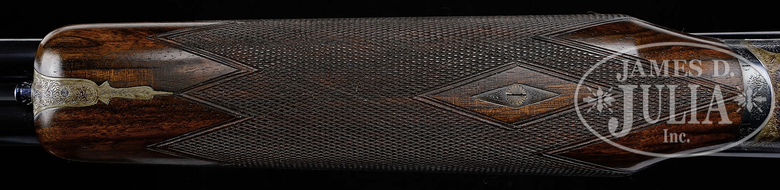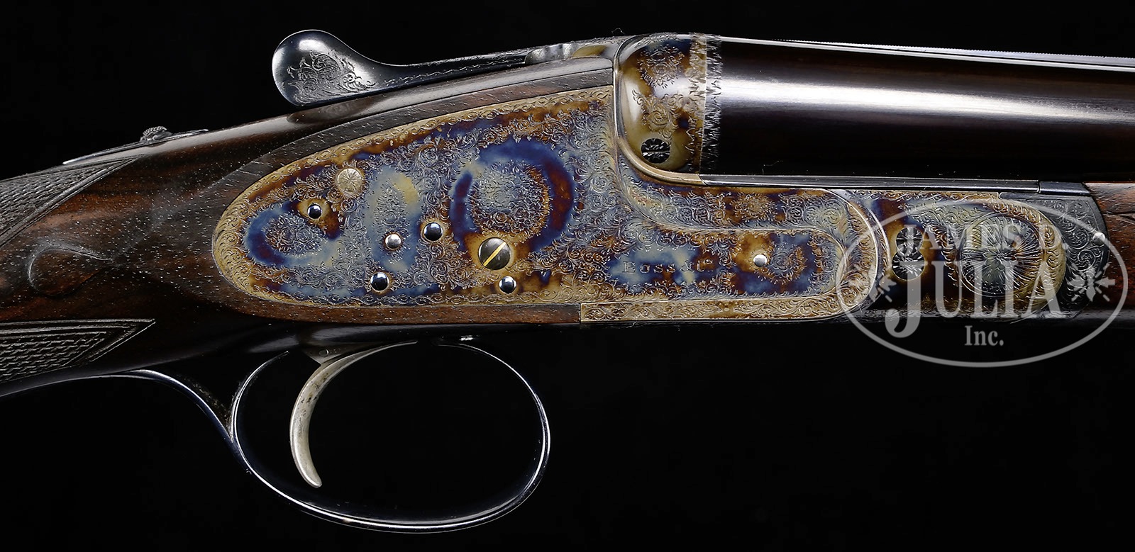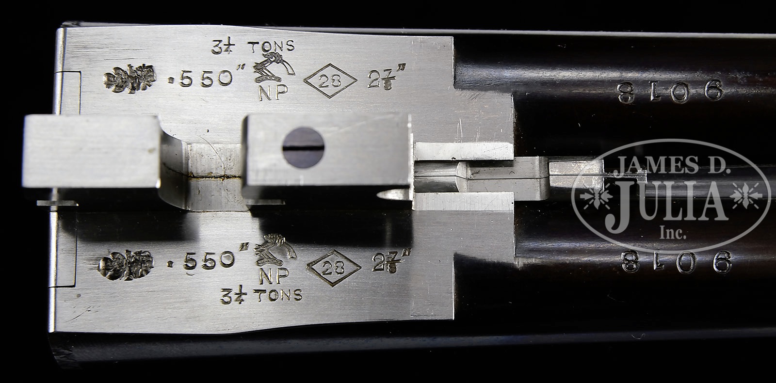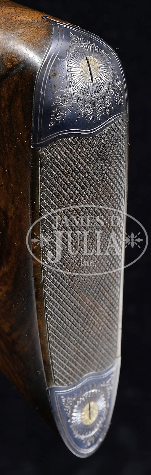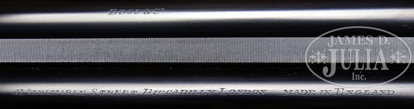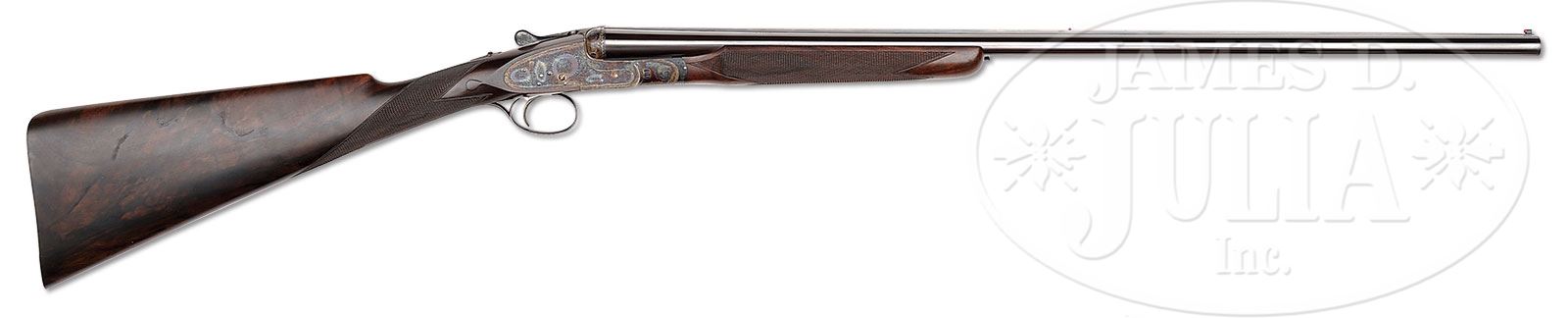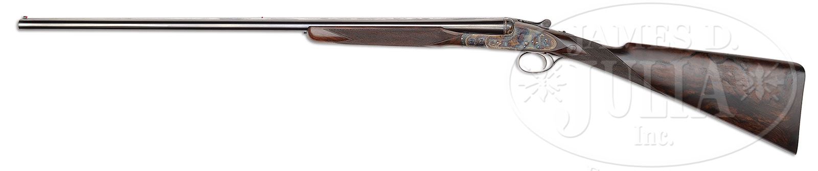 *SUBLIME 28 GAUGE BOSS SIDELOCK EJECTOR SINGLE TRIGGER SIDE BY SIDE GAME GUN.SN 9018. Cal. 28 ga. 2-7/8″ Chambers. 27″ Chopper lump bbls are fitted with slightly raised, flat, file cut rib, mounted with two red Bradley beads. Tops of bbls are engraved “Boss & Co.” and “41 Albemarle Street Piccadilly London Made in England”. Bbl flats are stamped with London nitro proofs for 2-7/8″ chambers. Bottoms of bbls are stamped with SNs. Petite, case hardened, nicely filed, sidelock action features non-automatic safety (SAFE inlaid in gold), bushed strikers, gold band tumbler end cocking indicators, and Boss’s celebrated non-selective single trigger. Action and lockplates are engraved with well cut, small scroll, and 18 rose bouquets in classic Boss fashion. Lockplates are engraved “Boss & Co”. Trigger plate is engraved “Boss Patent No 11278″ referring to single trigger. Blued top lever and small bow single beaded trigger guard are engraved with matching scroll. SN is engraved at grip in scroll flanked device with shaded background. Exceptionally fine, dark, dense, beautifully marbled European walnut straight grip buttstock features classically Boss sweeping toe line with 1/4″ negative camber. Stock measures 14-1/2” over checkered wood butt with engraved, blued steel heel and toe plates. Nicely shaped drop points are behind locks, and classic point pattern checkering with mullered borders is at grip. A gold letter “P” is inlet on toe line. Matching beavertail forend with Anson release is fitted with excellent Boss ejector system, which lifts unfired cartridges well clear of chambers. Accompanied by an envelope containing and marked “safety rod for 28 ga no. 9018″. Bore diameter: left-.550, right -.550. Bore restrictions: left -.009 (Mod), right -.006 (IC). Minimum wall thickness: left -.030, right -.030. Drop at heel: 2-9/16″, drop at comb: 1-3/8″. Weight: 5 lbs. 1 oz. LOP: 14-1/2”. Factory records match present specifications. Gun was ordered 18 March 1955. CONDITION: Excellent, near new, appears essentially unfired. Nearly all factory finishes are on wood and metal. There is a very slight mark on bottom of right bbl. Action retains essentially all of its orig case hardening color, fire blue to pins and hammer pivot, and bright polish to main spring pegs and sear pivots. Stock originally ordered with dull finish, shows some areas where this finish has lifted a bit, and also has a few very light marks on butt. This gun was made as a companion piece to the 28 bore Boss OU also in this auction. An exceptionally fine, investment quality, well balanced small bore “Best”. It doesn’t get much better! 4-50164 MGM13 (100,000-200,000) – Lot 3345