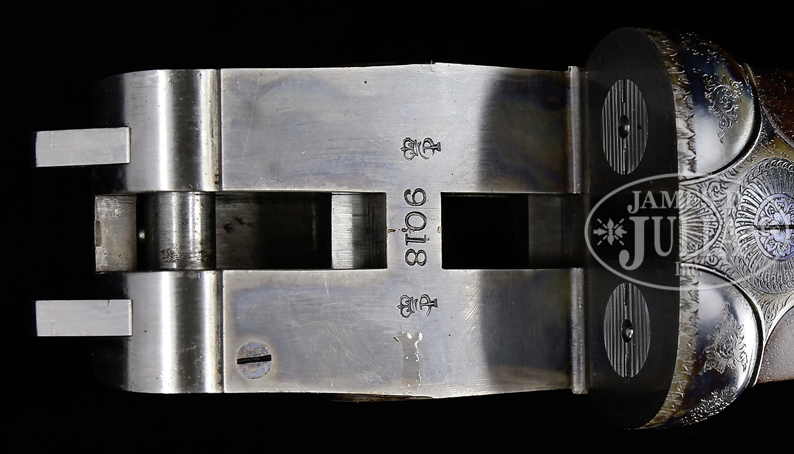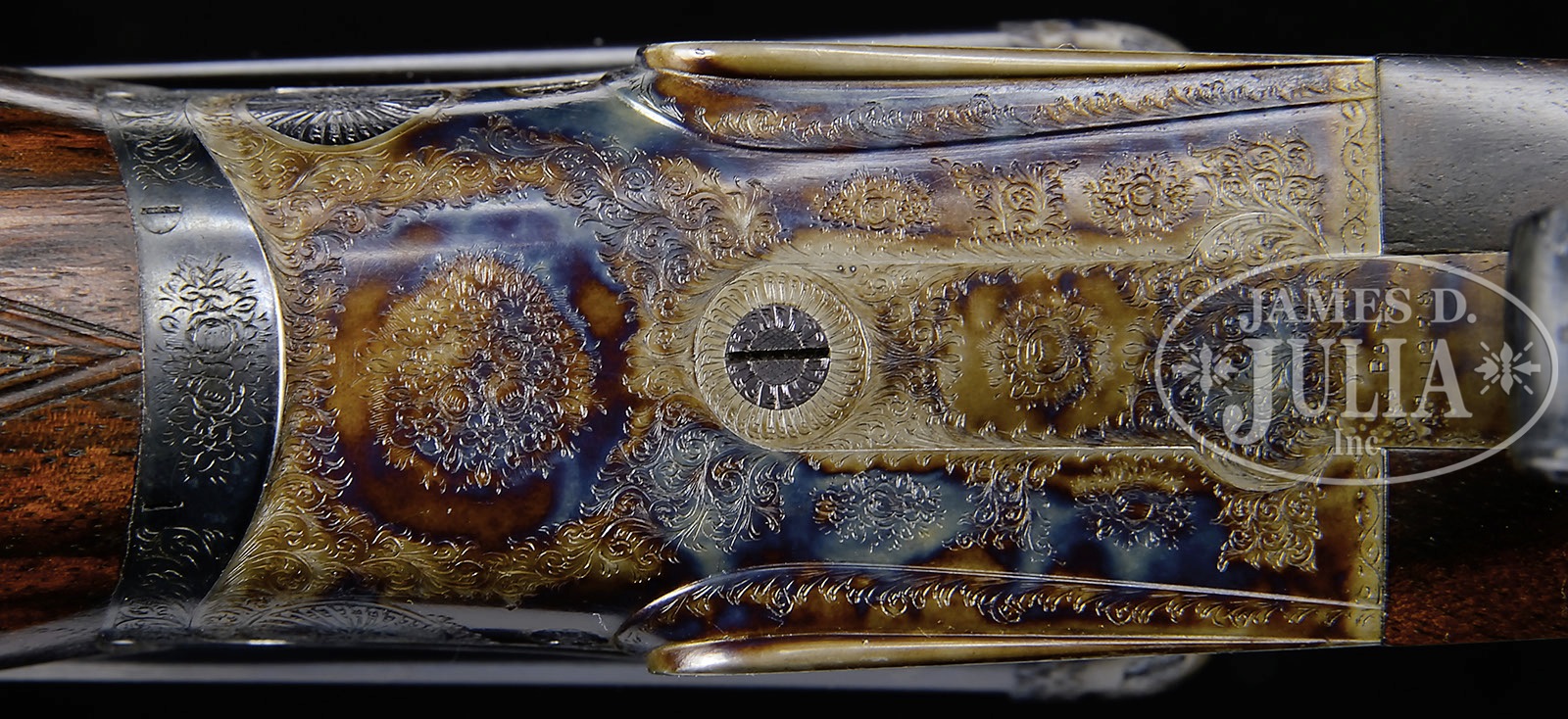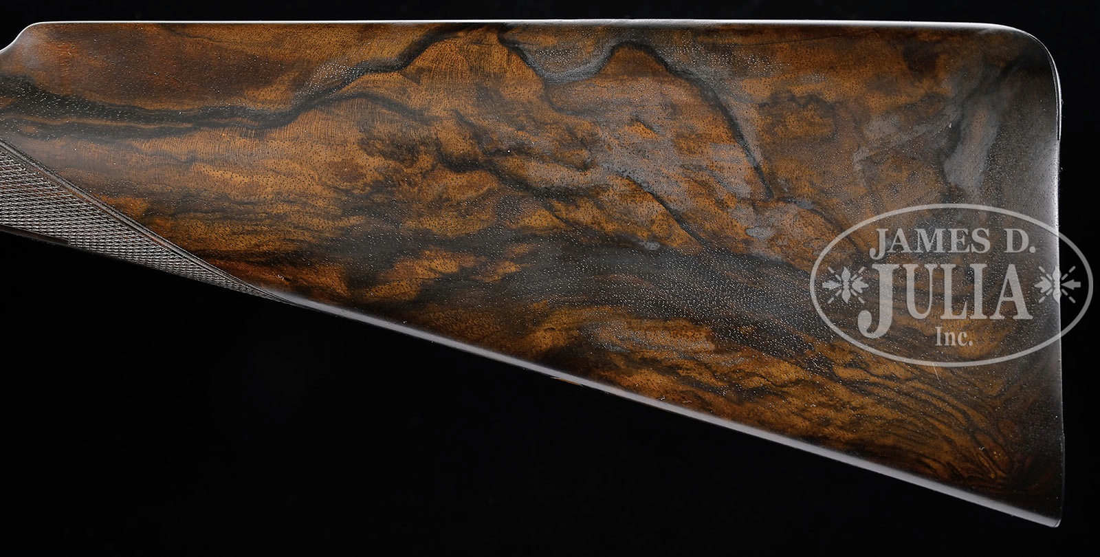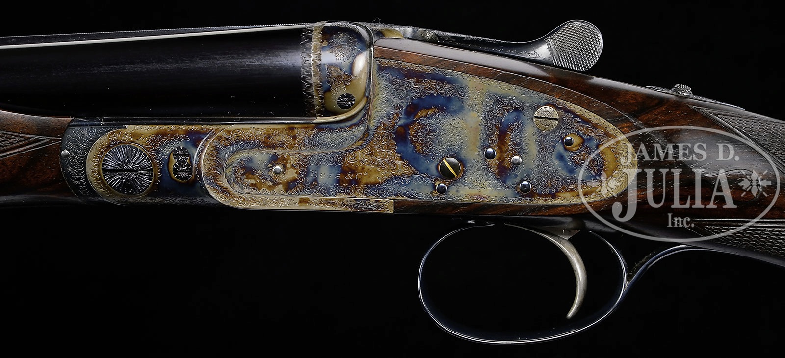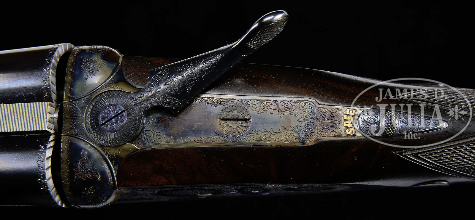 *SUBLIME 28 GAUGE BOSS SIDELOCK EJECTOR SINGLE TRIGGER SIDE BY SIDE GAME GUN.SN 9018. Cal. 28 ga. 2-7/8″ Chambers. 27″ Chopper lump bbls are fitted with slightly raised, flat, file cut rib, mounted with two red Bradley beads. Tops of bbls are engraved “Boss & Co.” and “41 Albemarle Street Piccadilly London Made in England”. Bbl flats are stamped with London nitro proofs for 2-7/8″ chambers. Bottoms of bbls are stamped with SNs. Petite, case hardened, nicely filed, sidelock action features non-automatic safety (SAFE inlaid in gold), bushed strikers, gold band tumbler end cocking indicators, and Boss’s celebrated non-selective single trigger. Action and lockplates are engraved with well cut, small scroll, and 18 rose bouquets in classic Boss fashion. Lockplates are engraved “Boss & Co”. Trigger plate is engraved “Boss Patent No 11278″ referring to single trigger. Blued top lever and small bow single beaded trigger guard are engraved with matching scroll. SN is engraved at grip in scroll flanked device with shaded background. Exceptionally fine, dark, dense, beautifully marbled European walnut straight grip buttstock features classically Boss sweeping toe line with 1/4″ negative camber. Stock measures 14-1/2” over checkered wood butt with engraved, blued steel heel and toe plates. Nicely shaped drop points are behind locks, and classic point pattern checkering with mullered borders is at grip. A gold letter “P” is inlet on toe line. Matching beavertail forend with Anson release is fitted with excellent Boss ejector system, which lifts unfired cartridges well clear of chambers. Accompanied by an envelope containing and marked “safety rod for 28 ga no. 9018″. Bore diameter: left-.550, right -.550. Bore restrictions: left -.009 (Mod), right -.006 (IC). Minimum wall thickness: left -.030, right -.030. Drop at heel: 2-9/16″, drop at comb: 1-3/8″. Weight: 5 lbs. 1 oz. LOP: 14-1/2”. Factory records match present specifications. Gun was ordered 18 March 1955. CONDITION: Excellent, near new, appears essentially unfired. Nearly all factory finishes are on wood and metal. There is a very slight mark on bottom of right bbl. Action retains essentially all of its orig case hardening color, fire blue to pins and hammer pivot, and bright polish to main spring pegs and sear pivots. Stock originally ordered with dull finish, shows some areas where this finish has lifted a bit, and also has a few very light marks on butt. This gun was made as a companion piece to the 28 bore Boss OU also in this auction. An exceptionally fine, investment quality, well balanced small bore “Best”. It doesn’t get much better! 4-50164 MGM13 (100,000-200,000) – Lot 3345