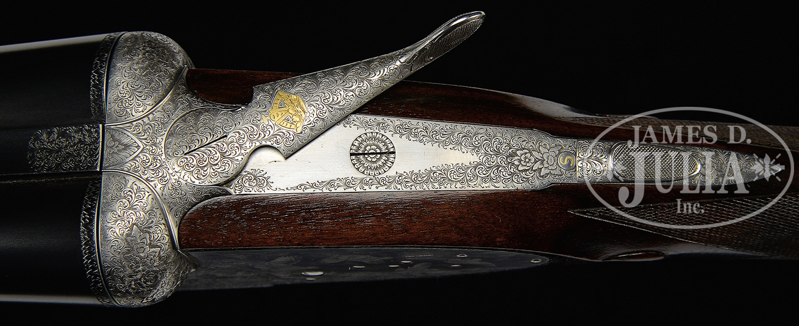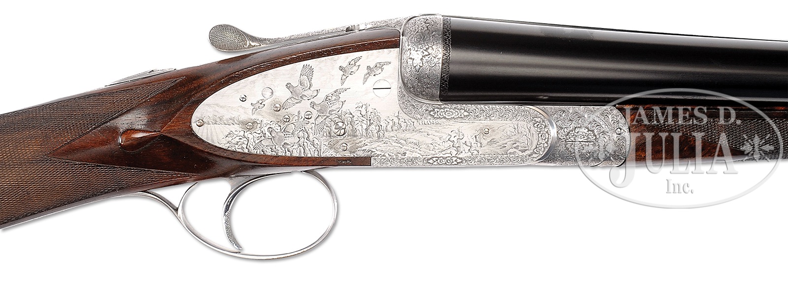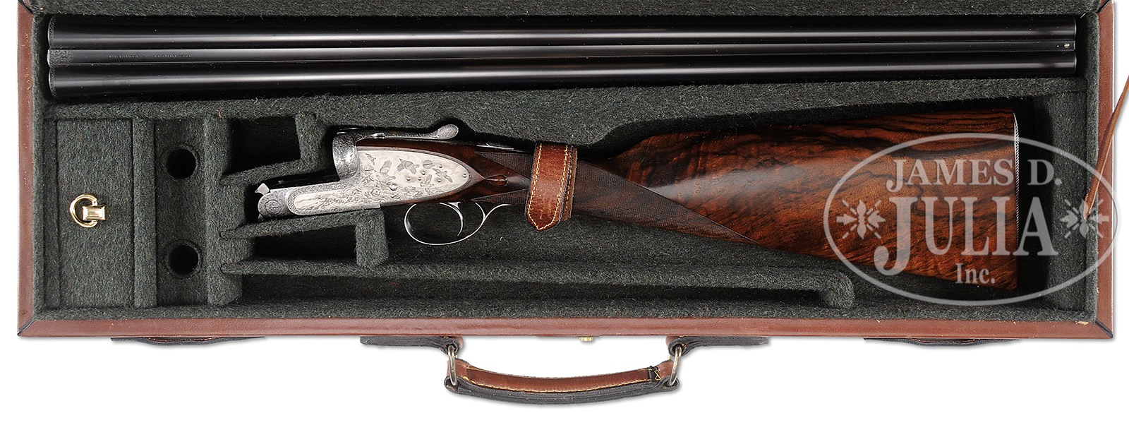 Please Note: Great News!! According to our consignor, this gun was built on a 20 ga frame and is the lightest 12 ga sidelock gun that Piotti has ever built. This gun was built as an ultralight prototype and so far, is the lightest 12 ga sidelock gun that Piotti has delivered. *FAST HANDLING PIOTTI “MONACO 3 EXTRA” SIDELOCK SINGLE TRIGGER LIGHTWEIGHT GAME GUN WITH CASE.SN 7994. (1983) Cal. 12 ga. 26″ Chopper lump bbls are engraved “Flli PIOTTI – GARDONE V.T.” on concave, swamped game rib. Bbl flats are stamped with 1983 Italian nitro proofs for 2-3/4″ chambers, SN, and early Piotti logo. Bottoms of bbls are engraved “ACCIATO SIAU U.M.6.” (steel type) and grade. Narrow bar coin finished sidelock action features automatic safety (S inlaid in gold), bushed strikers, line engraved tumbler end cocking indicators, and single non-selective trigger. Action is engraved with near full coverage well cut small scroll with rose bouquet highlights surrounding interesting Bulino scene on bottom of action of a peregrine falcon lacerating the back of a cock pheasant, feathers flying. Lockplates are engraved to the edges with other well done Bulino scenes of game; a covey of grouse fly over open moorland on left side, and a group of quail are flying in over a vineyard on right. Top lever is gold inlaid with a crown. Small bow beaded trigger guard has matching scroll with initials “EM” inlaid in gold on bow. SN is in gold on tang. This very fine engraving is signed “L Venzi” on trigger plate. Exceptionally well marbled and lightly figured European walnut straight grip buttstock measures 14-1/2″ over checkered wood butt, and features standard drop points and point pattern checkering. Matching splinter ejector forend has Anson release, and gold Piotti logo is inlet on central uncheckered diamond. Bore diameter: left -.728, right – .727. Bore restrictions: left – .028 (IMod), right – .009 (IC). Drop at heel: 2-5/16″, drop at comb: 1-1/2″. Cast: approx 1/4″ on. Weight: 5 lbs. 8oz. LOP: 14-1/2″. Brown leather case with stitched leather corners by Nizzoli is lined in dark olive felt, with gold embossed leather Piotti label stitched into lid. Case contains a key. PROVENANCE: Remarkable William Larkin Moore Private Estate Collection of Fine Sporting Arms. CONDITION: Excellent, near new, with scant evidence of light field use, with a few minor handling and assembly marks in all fine factory finishes. Only the faintest of halos can be found on breechface. Case leather shows quite a few marks and scuffs. Straps and handle are good. Interior cloth is excellent, with some slight soiling. A dynamic, nicely appointed, featherweight 12. 50594-109 MGM77 (22,500-37,500) – Lot 3345
