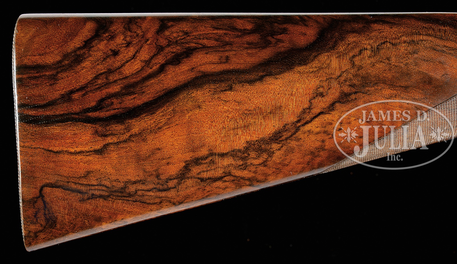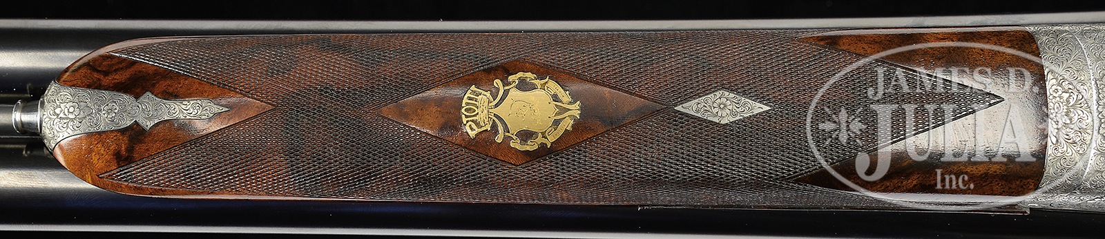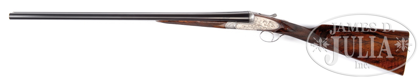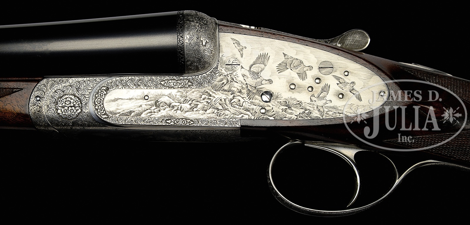 Please Note: Great News!! According to our consignor, this gun was built on a 20 ga frame and is the lightest 12 ga sidelock gun that Piotti has ever built. This gun was built as an ultralight prototype and so far, is the lightest 12 ga sidelock gun that Piotti has delivered. *FAST HANDLING PIOTTI “MONACO 3 EXTRA” SIDELOCK SINGLE TRIGGER LIGHTWEIGHT GAME GUN WITH CASE.SN 7994. (1983) Cal. 12 ga. 26″ Chopper lump bbls are engraved “Flli PIOTTI – GARDONE V.T.” on concave, swamped game rib. Bbl flats are stamped with 1983 Italian nitro proofs for 2-3/4″ chambers, SN, and early Piotti logo. Bottoms of bbls are engraved “ACCIATO SIAU U.M.6.” (steel type) and grade. Narrow bar coin finished sidelock action features automatic safety (S inlaid in gold), bushed strikers, line engraved tumbler end cocking indicators, and single non-selective trigger. Action is engraved with near full coverage well cut small scroll with rose bouquet highlights surrounding interesting Bulino scene on bottom of action of a peregrine falcon lacerating the back of a cock pheasant, feathers flying. Lockplates are engraved to the edges with other well done Bulino scenes of game; a covey of grouse fly over open moorland on left side, and a group of quail are flying in over a vineyard on right. Top lever is gold inlaid with a crown. Small bow beaded trigger guard has matching scroll with initials “EM” inlaid in gold on bow. SN is in gold on tang. This very fine engraving is signed “L Venzi” on trigger plate. Exceptionally well marbled and lightly figured European walnut straight grip buttstock measures 14-1/2″ over checkered wood butt, and features standard drop points and point pattern checkering. Matching splinter ejector forend has Anson release, and gold Piotti logo is inlet on central uncheckered diamond. Bore diameter: left -.728, right – .727. Bore restrictions: left – .028 (IMod), right – .009 (IC). Drop at heel: 2-5/16″, drop at comb: 1-1/2″. Cast: approx 1/4″ on. Weight: 5 lbs. 8oz. LOP: 14-1/2″. Brown leather case with stitched leather corners by Nizzoli is lined in dark olive felt, with gold embossed leather Piotti label stitched into lid. Case contains a key. PROVENANCE: Remarkable William Larkin Moore Private Estate Collection of Fine Sporting Arms. CONDITION: Excellent, near new, with scant evidence of light field use, with a few minor handling and assembly marks in all fine factory finishes. Only the faintest of halos can be found on breechface. Case leather shows quite a few marks and scuffs. Straps and handle are good. Interior cloth is excellent, with some slight soiling. A dynamic, nicely appointed, featherweight 12. 50594-109 MGM77 (22,500-37,500) – Lot 3345