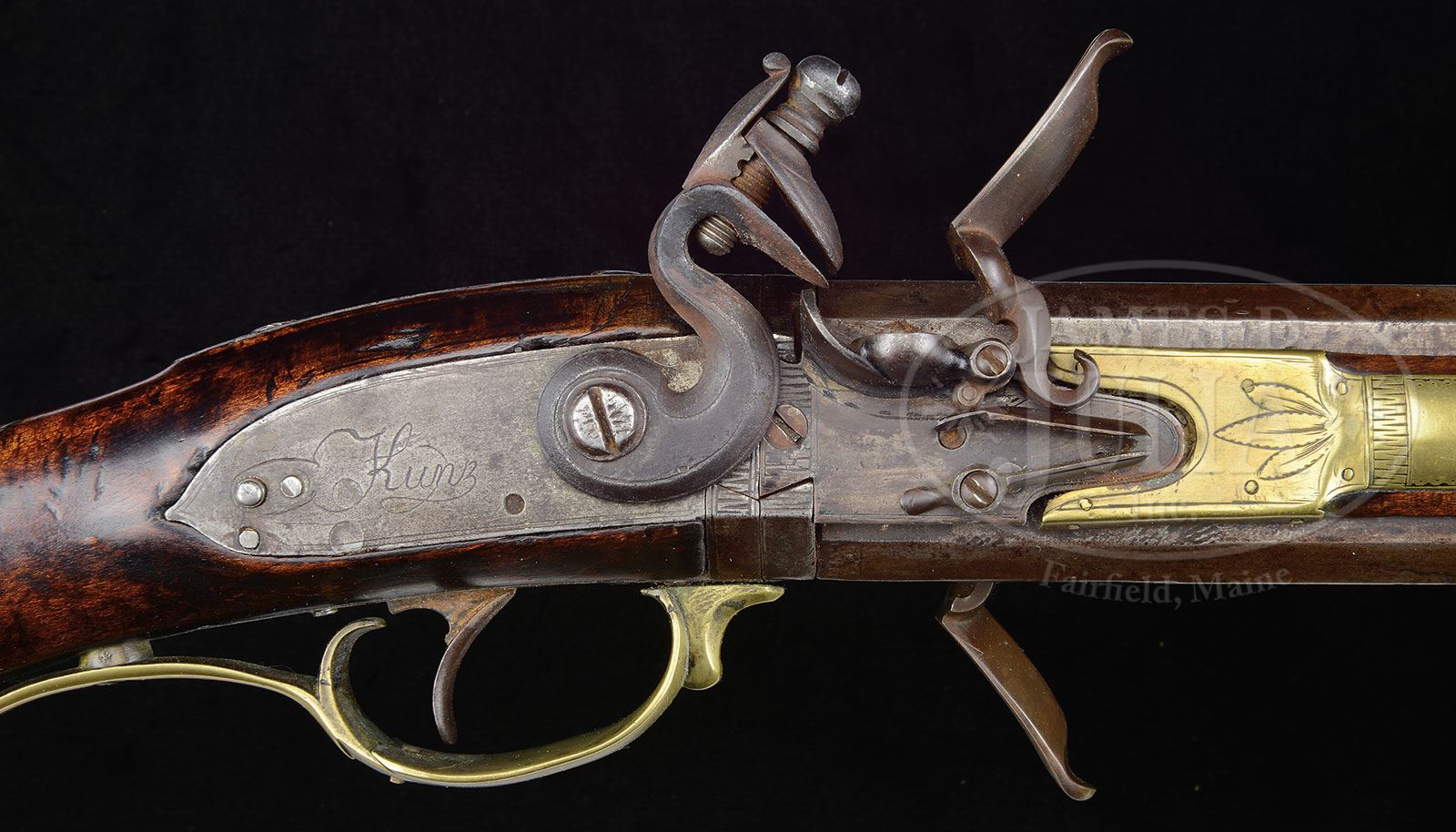 RARE OVER AND UNDER SWIVEL BREECH FLINTLOCK KENTUCKY RIFLE BY THE FAMOUS PHILADELPHIA GUNSMITH J. KUNZ.Cal. 50, both bbls. Overall 57″, 4-1/2″ x 1-1/2″ buttplate. 40-3/4″ full oct rifled bbls with the top bbl being signed “J Kunz Philad”. Rifled bbls are separated by full length curly maple panels and 11-1/2″ brass engraved inlaid saddleplates running forward from the locks. Rifle has a 4-pc brass engraved patchbox with 6 piercings and a typical Kunz style finial. The 3-1/2″ engraved brass toeplate contains the bone patchbox release. Right hand flint lockplate is signed “Kunz” while the left hand plate is engraved “Philad”. Cheekpiece inlay is engraved with an 8-pointed star with 8 piercings. Jacob Kuntz “Kunz” is a very important maker who was trained near Allentown, PA. Jacob moved to Philadelphia in 1810 and in 1812 married Barbara Newhard, niece of the famous Allentown gunsmith Peter Newhard. In 1833 the Franklin Institute of Philadelphia awarded Jacon Kuntz a silver metal for his skill and ingenuity. Jacob died at the age of 95 years after becoming Philadelphia’s most sought after gunsmith by wealthy customers in England, Scotland, and America. Jacob was an excellent engraver and several examples of his work are on display in New York’s Metropolitan Museum of Art. Bbl is marked “MDCLXXXVII” (1787) on the underside. PROVENANCE: Collection of Dr. Douglas Sirkin. CONDITION: Very good overall. There are several in service replacements of small parts which do not detract from the appearance of the rifle. Wood has some shrinkage that has been remedied at lock. Barrels may have been shortened an inch or more some time ago. Front sight on lower bbl is a replacement. 4-49879 RG5 (15,000-25,000) – Lot 3348 Click here to view provenance