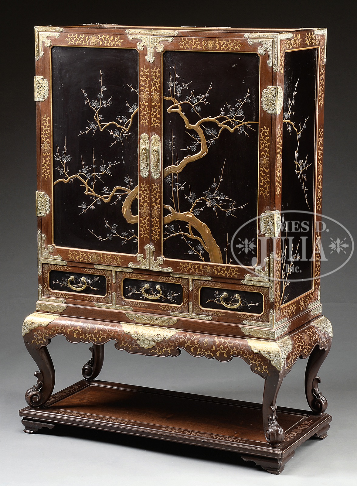 Early 20th century, Japan. Panels with raised design of plum flowers. The interior with stepped shelves and multiple compartments. SIZE: With stand: 57-1/2″ h x 36″ w. CONDITION: Minor scuffing to panels. Metal mounts cleaned. 50003-1 (800-1,200) – Lot 3348
