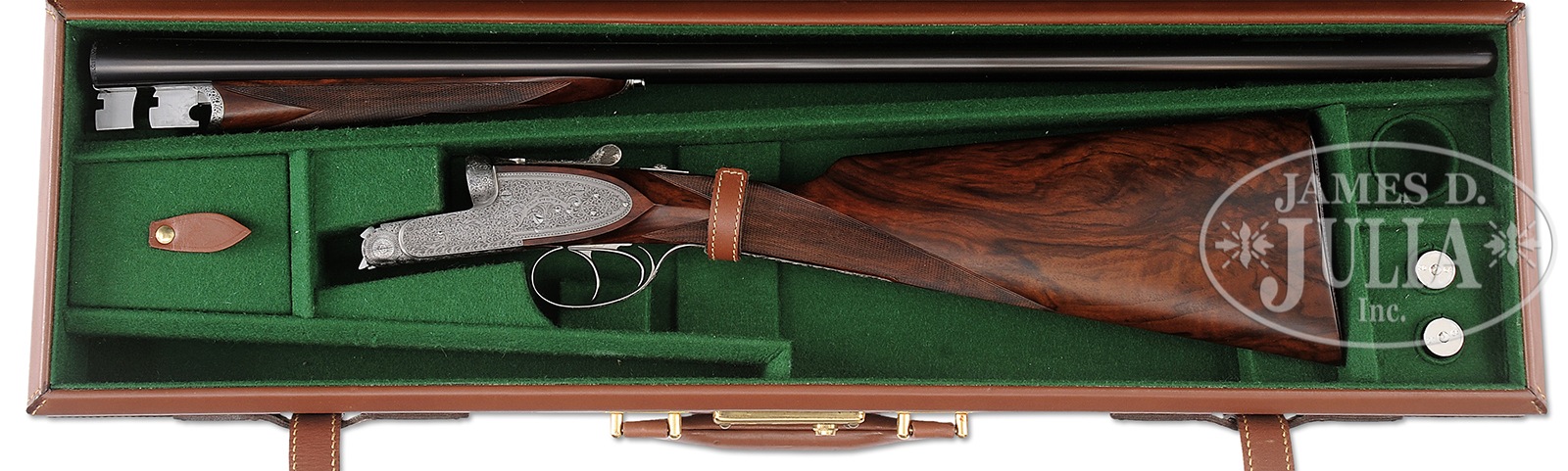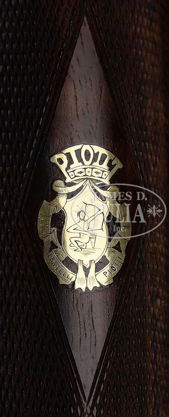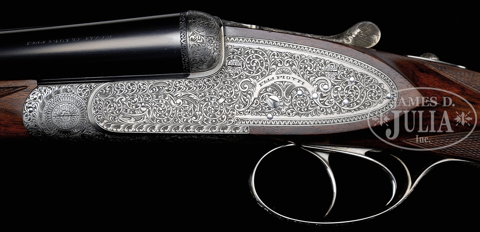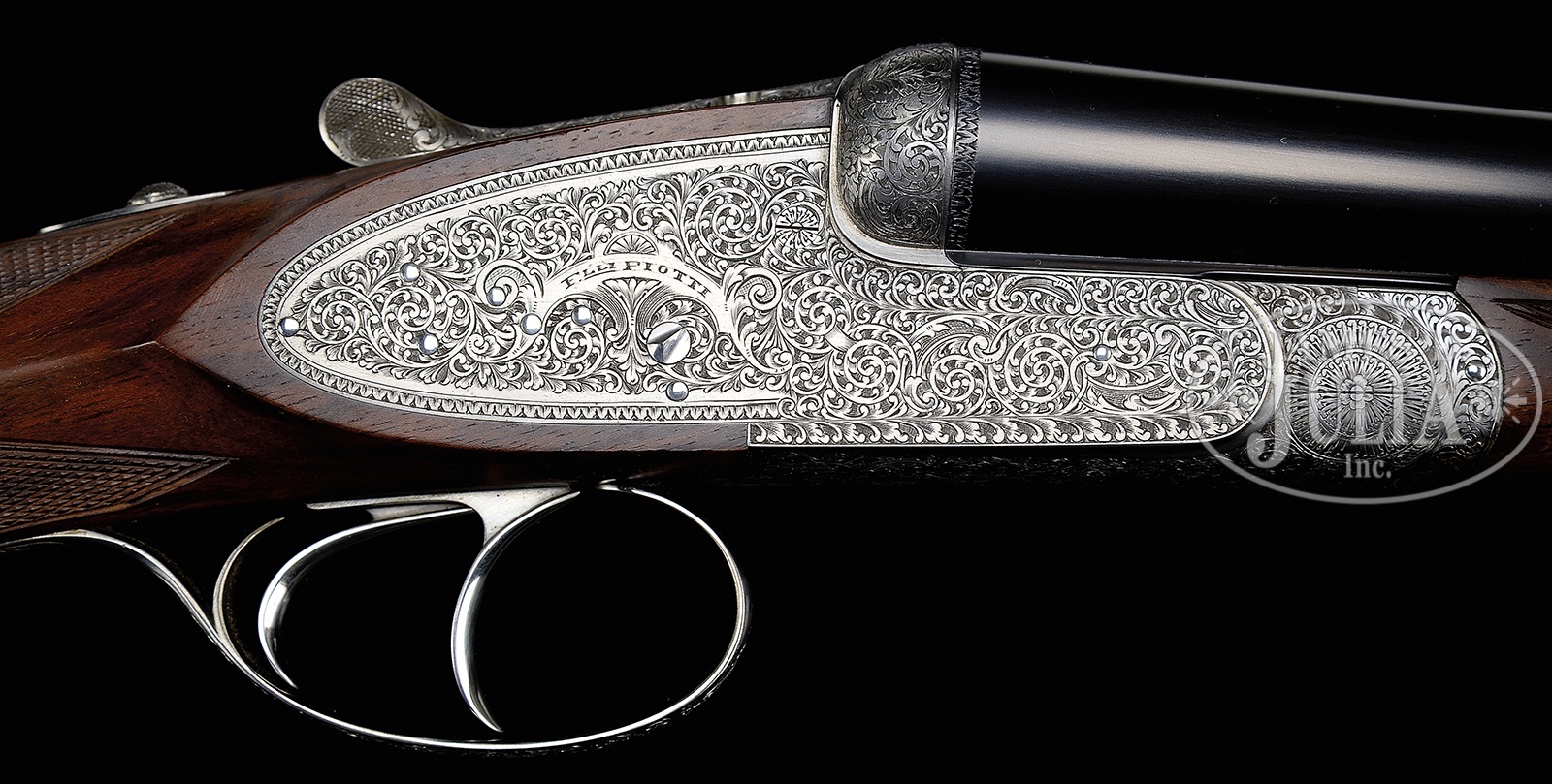 *FINE 20 BORE PIOTTI “KING” TRADITIONALLY STYLED SIDELOCK EJECTOR DOUBLE TRIGGER GAME GUN WITH CASE.SN 9316. Cal. 20 ga. 28″ Chopper lump bbls with hand matted, slightly raised and swamped game rib are engraved “Flli PIOTTI ITALY” on side of left bbl. Bbl flats are stamped with 1996 Italian nitro proofs for 2-3/4″ chambers. Importers name and address (WLM Westlake CA) are engraved on bottom of right bbl. Coin finished, sidelock action features non-automatic safety (S inlaid in gold), raised arrowhead tumbler end cocking indicators, and dbl triggers (front slightly “loose”). Action and lockplates are engraved in H&H style varying sized large open shaded scroll with some floral highlights. “Flli PIOTTI” is in arched device on each lockplate. Single beaded trigger guard is also scroll engraved and has SN at grip. Engravers signature “S Pantegrini” (?) is on trigger plate. Finely marbled and lightly stump figured European walnut straight grip buttstock measures 14-5/8″ over checkered wood butt, and features diamond hand with well cut point pattern checkering with line borders. Matching splinter ejector forend with Anson release has gold Piotti crest inlet on uncheckered central diamond. Bore diameter: left -.617, right – .617. Bore restrictions: left – .013 (mod), right – .005 (IC). Drop at heel: 2-7/16″, drop at comb: 1-1/2″. Cast: approx 1/4″ off. Weight: 6 lbs. 8 oz. LOP: 14-5/8″. Brown leather case with stitched leather corners is lined in green felt, and has “Artesania F. Exposito” label in lid, and contains a pair of snap caps. CONDITION: Excellent, essentially as new, with only a few of the lightest of handling and assembly marks on all wood and metal finishes, appears unfired since proof. Mechanically crisp. Case is excellent. 51071-1 MGM276 (20,000-28,000) – Lot 3348