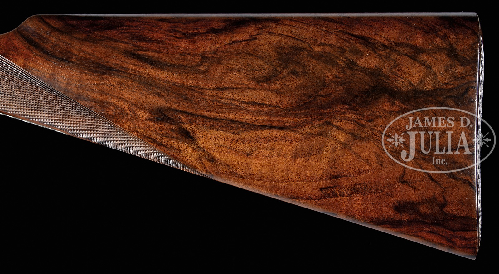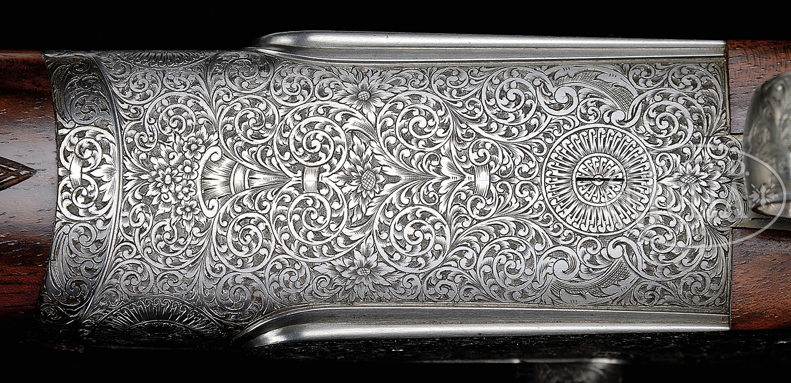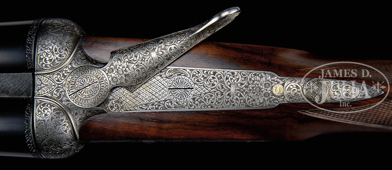 *FINE 20 BORE PIOTTI “KING” TRADITIONALLY STYLED SIDELOCK EJECTOR DOUBLE TRIGGER GAME GUN WITH CASE.SN 9316. Cal. 20 ga. 28″ Chopper lump bbls with hand matted, slightly raised and swamped game rib are engraved “Flli PIOTTI ITALY” on side of left bbl. Bbl flats are stamped with 1996 Italian nitro proofs for 2-3/4″ chambers. Importers name and address (WLM Westlake CA) are engraved on bottom of right bbl. Coin finished, sidelock action features non-automatic safety (S inlaid in gold), raised arrowhead tumbler end cocking indicators, and dbl triggers (front slightly “loose”). Action and lockplates are engraved in H&H style varying sized large open shaded scroll with some floral highlights. “Flli PIOTTI” is in arched device on each lockplate. Single beaded trigger guard is also scroll engraved and has SN at grip. Engravers signature “S Pantegrini” (?) is on trigger plate. Finely marbled and lightly stump figured European walnut straight grip buttstock measures 14-5/8″ over checkered wood butt, and features diamond hand with well cut point pattern checkering with line borders. Matching splinter ejector forend with Anson release has gold Piotti crest inlet on uncheckered central diamond. Bore diameter: left -.617, right – .617. Bore restrictions: left – .013 (mod), right – .005 (IC). Drop at heel: 2-7/16″, drop at comb: 1-1/2″. Cast: approx 1/4″ off. Weight: 6 lbs. 8 oz. LOP: 14-5/8″. Brown leather case with stitched leather corners is lined in green felt, and has “Artesania F. Exposito” label in lid, and contains a pair of snap caps. CONDITION: Excellent, essentially as new, with only a few of the lightest of handling and assembly marks on all wood and metal finishes, appears unfired since proof. Mechanically crisp. Case is excellent. 51071-1 MGM276 (20,000-28,000) – Lot 3348