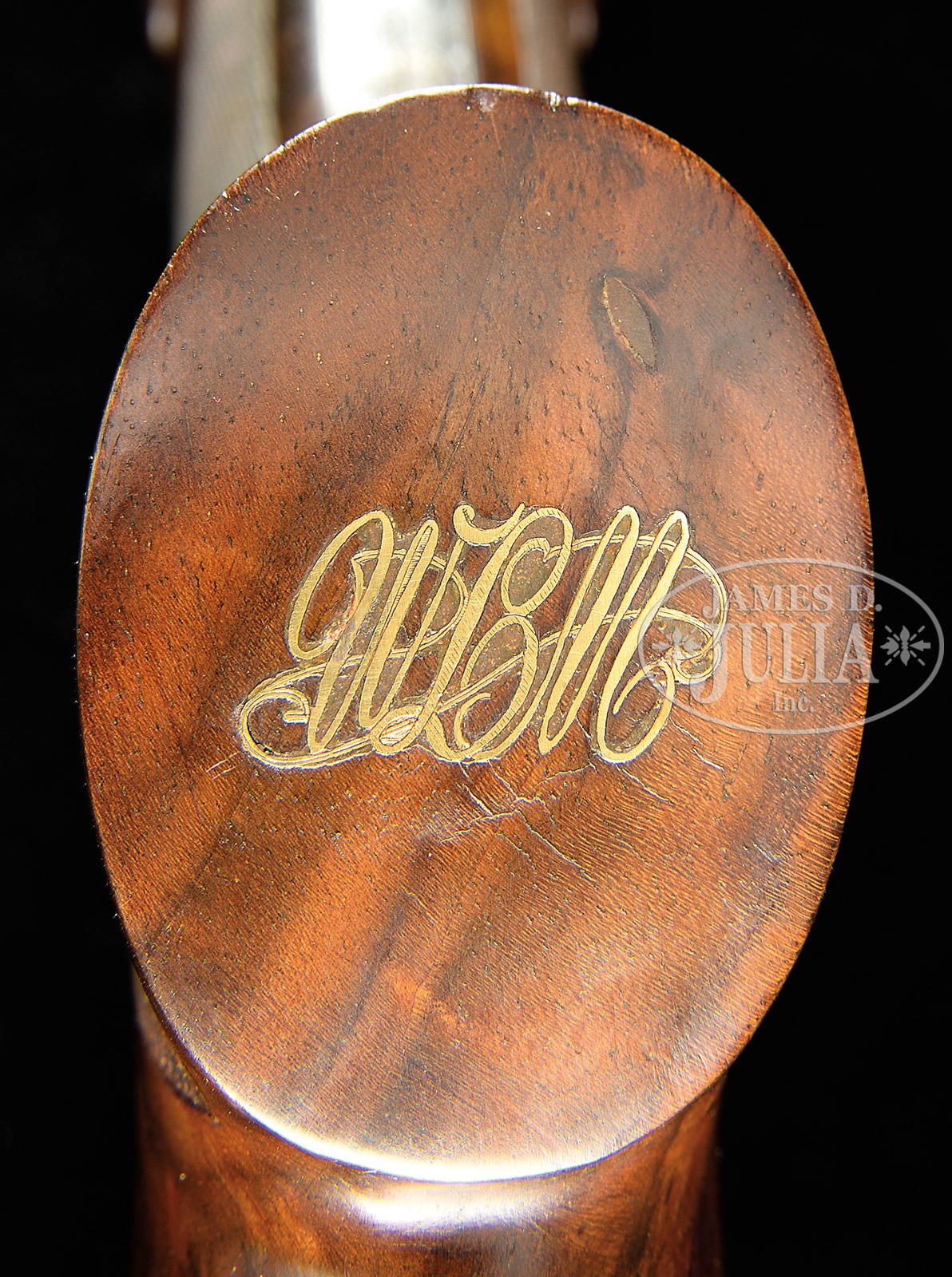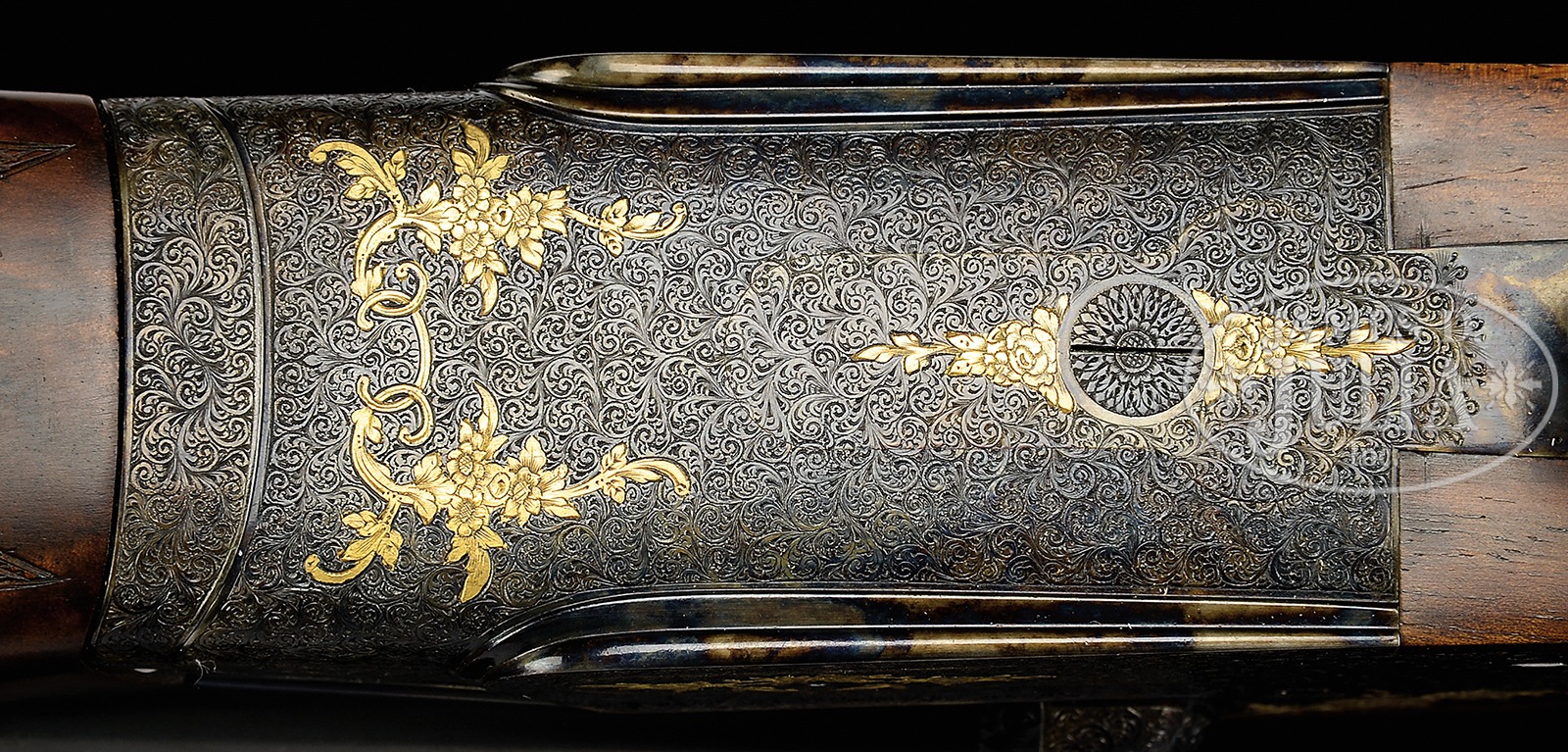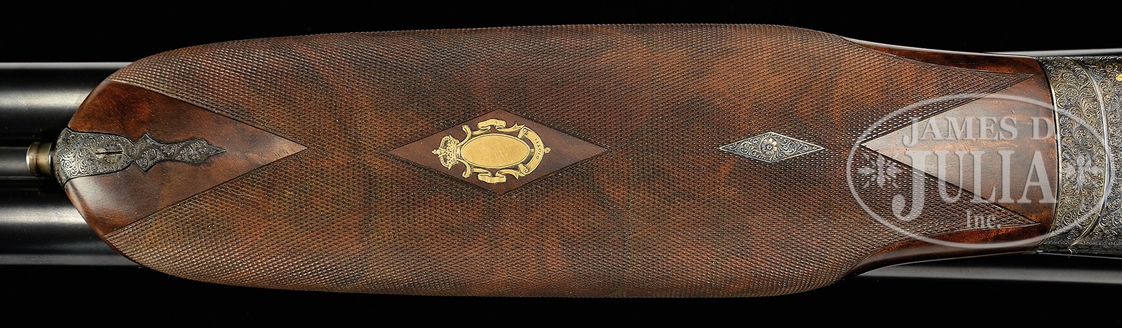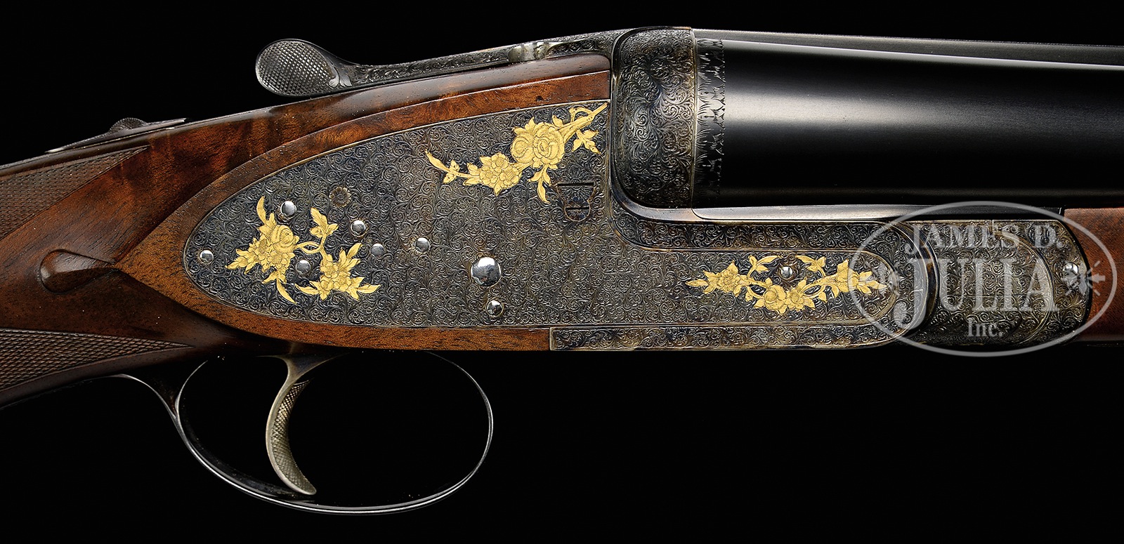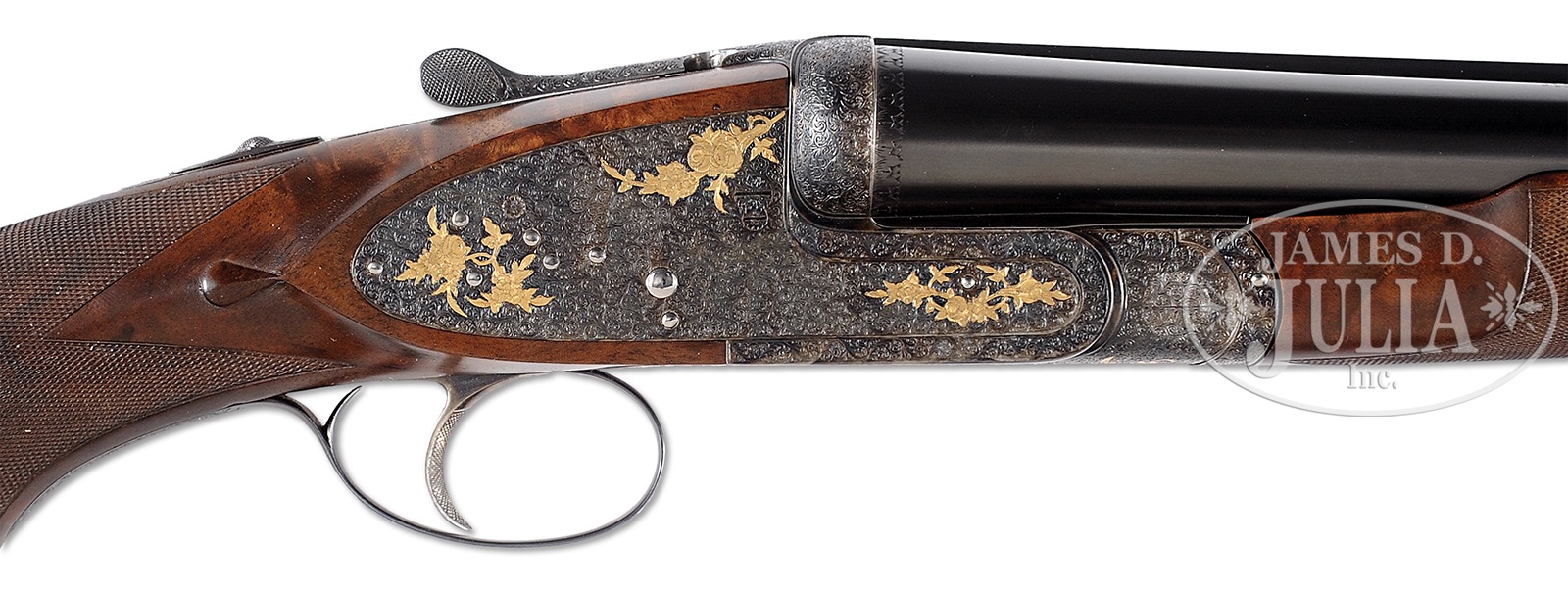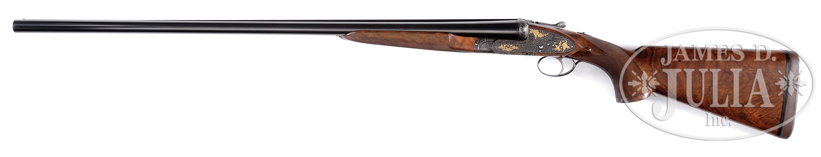 *GORGEOUS PIOTTI “KING EXTRA” MARKED “KING 1” SIDELOCK EJECTOR SINGLE TRIGGER GAME GUN WITH SUPERB SCROLL AND GOLD INLAY BY RANETTI WITH BOX.SN 7537. (1980) Cal. 12 ga. 2-3/4″ Chambers. 30″ Chopper lump bbls are fitted with slightly raised, flat, matted rib, and engraved “Flli Piotti – Italy” and with steel type,”ACCIATO SIAU U.M.6.” Bbl flats are stamped with 1980 Italian nitro proofs for 2-3/4″ chambers, SN, and early Piotti logo. Bottoms of bbls are engraved with grade (King 1) and importer (W L Moore, Westlake CA). Case hardened sidelock action features non-automatic safety (S inlaid in gold), bushed strikers, and single non-selective trigger with checkered finger blade. Action is engraved with near full coverage well cut minuscule scroll surrounding gold inlaid falls and partial bouquets of roses. Top lever is gold inlaid with a crown. “PIOTTI” is in gold at bottom left side of action. Small bow trigger guard with thin bead, has matching scroll and SN on tang. This very fine engraving is signed “G Ranetti” on trigger plate. Unusual, dense, stump figured and watermarked European walnut pistol grip buttstock measures 14-1/4″ over brown Decelerator pad, and features nicely sculpted drop points. Very closely spaced and exceptionally well cut borderless point pattern checkering is at grip. Bottom of grip is meticulously gold inlaid with cut out initials in script “WLM”. Matching short beavertail ejector forend has Anson release. Gold Piotti logo is inlet on central uncheckered diamond though without engraving on central oval. Bore diameter: left -.728, right – .727. Bore restrictions: left – .019 (Mod), right – .014 (Lt mod). Drop at heel: 2″, drop at comb: 1-5/8″. Cast: Neutral. Weight: 7 lbs. 15 oz. LOP: 14-1/4″. Gun is accompanied by its orig wood grain printed box with matching end label. PROVENANCE: Remarkable William Larkin Moore Private Estate Collection of Fine Sporting Arms. CONDITION: Excellent, very near new, with scant evidence of light field use, with a few minor handling and assembly marks in all fine factory finishes. Only the faintest of halos can be found on breechface. Mechanically crisp. Box is excellent with some rubs. 50594-91 MGM78 (15,000-25,000) – Lot 3350