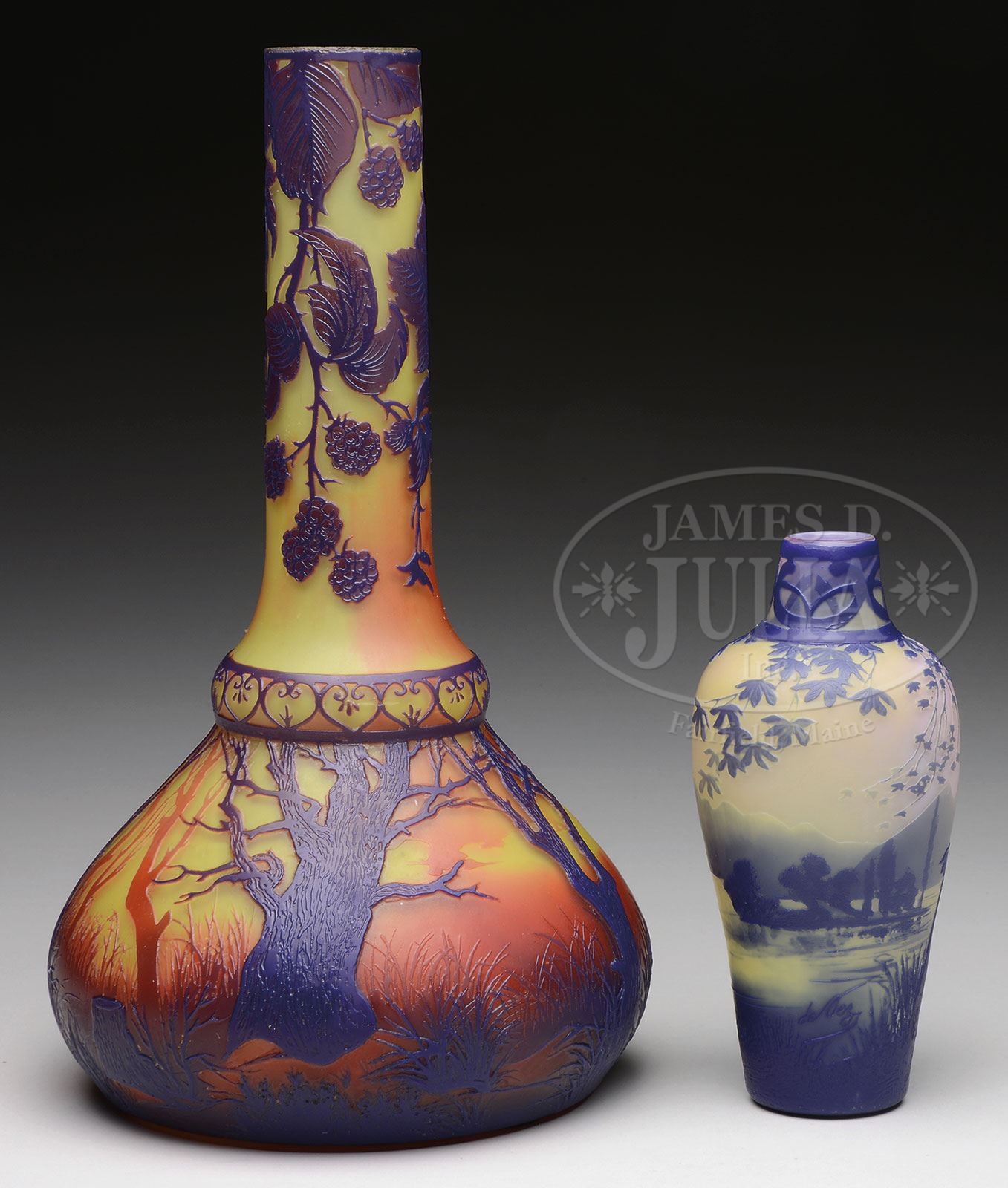 TWO DEVEZ CAMEO VASES.1) Three color deVez vase has blue and amber cameo trees with three deer grazing among them all set against a shaded yellow and orange background. The tall slender neck is decorated with blue cameo leaves, stems and berries descending from the lip. Signed on the side in cameo “deVez”. 2) deVez vase has blue cameo scenic decoration of trees surrounding a pond with mountains in the background all set against a shaded pink and yellow ground. Signed on the side in cameo “deVez”. SIZE: 1) 11-1/4″ t. 2) 6″ t. PROVENANCE: James Boma Collection. CONDITION: 1) Very good to excellent with some acid burns to lip. 2) Very good to excellent. 5-69630, 5-69645 (1,000-1,500) – Lot 3352