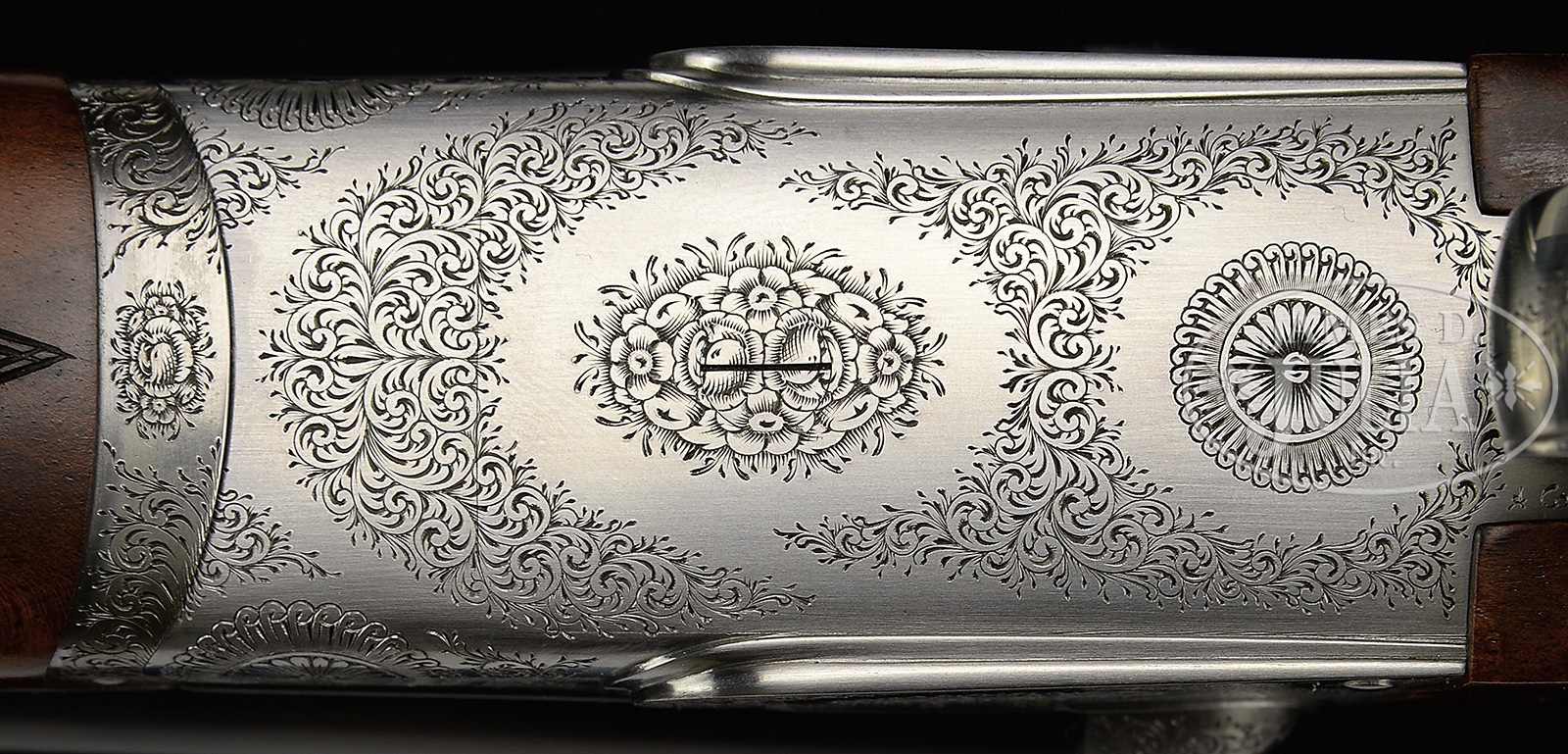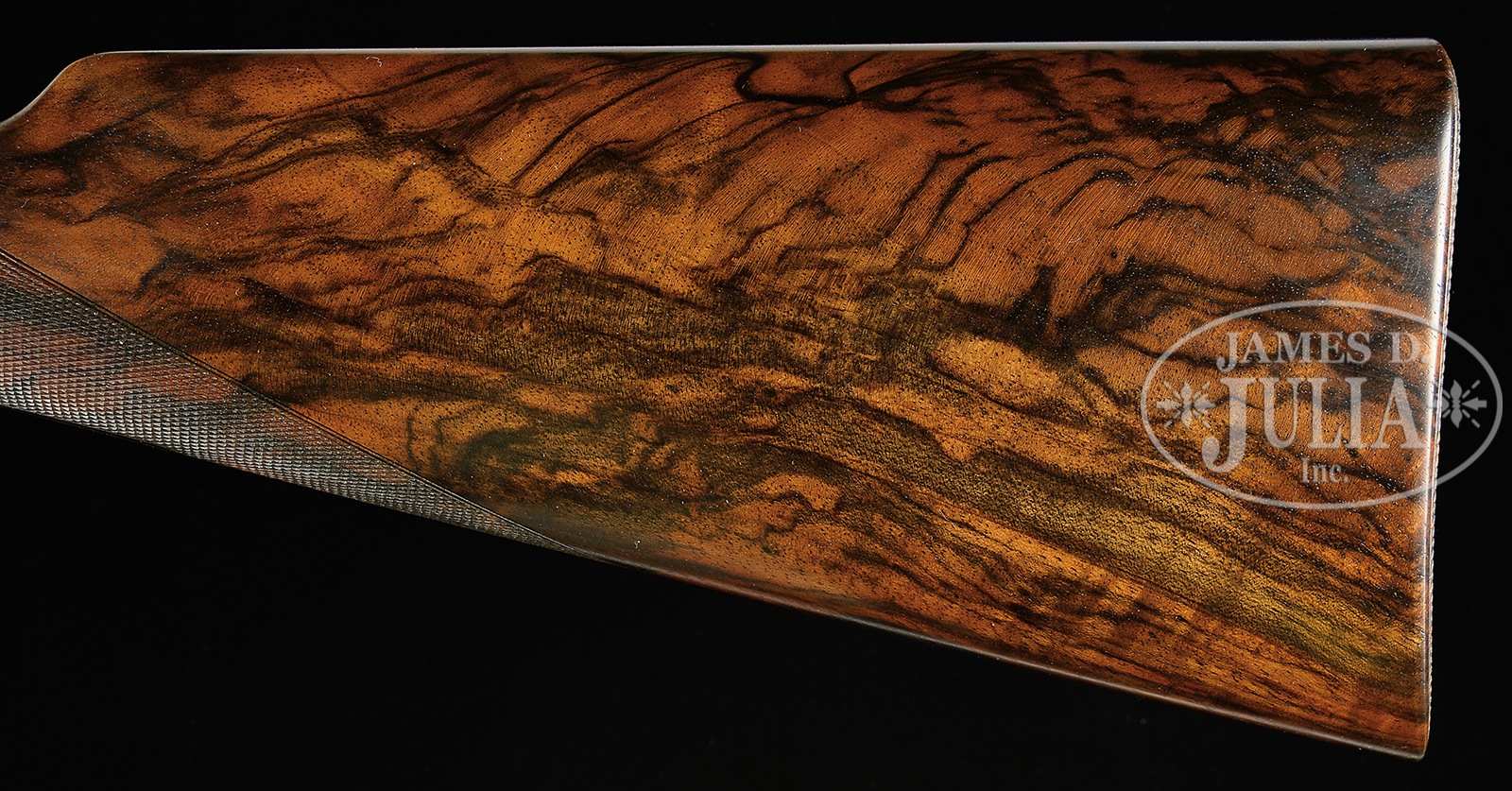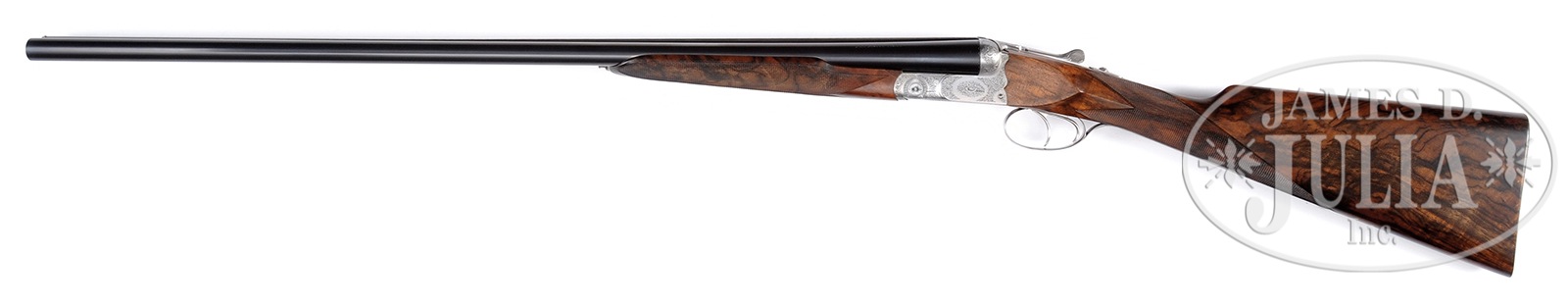 *VERY FINE, LONG BARRELED SHOTGUN, 20 BORE PIOTTI “B S E E” WITH EXCEPTIONAL WOOD AND ORIGINAL BOX.SN 9800. Cal. 20 ga. 3″ Chambers. 29″ Chopper lump bbls with matted game rib are engraved “Flli PIOTTI ITALY” on left bbl. Bbl flats are stamped with SN, Piotti logo, and 2003 Italian nitro proofs for 3″ chambers. Bottoms of bbls are marked with importer (W L Moore) and model. Small sized, coin finished, ogee-backed, boxlock action features non-automatic safety and dbl triggers (front “loose” to minimize finger damage during recoil). Action is engraved with very well cut traditional rose and scroll with engravers signature “A Cartelli” on trigger plate. Matching single beaded trigger guard has SN on tang. Obviously specially selected, finely marbled and lightly figured European walnut straight grip buttstock measures 14-5/8″ over checkered wood butt, and features diamond hand with well cut point pattern checkering with line borders. Matching beavertail ejector forend has Anson release. Bore diameter: left -.622, right – .622. Bore restrictions: left – .017 (mod), right – .017 (mod). Drop at heel: 2-1/4″, drop at comb: 1-7/16″. Cast: approx 1/4″ on. Weight: 6 lbs. 9 oz. LOP: 14-5/8″. Gun comes in what is most likely its orig wood grain printed box with end label for a gun of this model. Box contains bags for action and bbls. PROVENANCE: Remarkable William Larkin Moore Private Estate Collection of Fine Sporting Arms. CONDITION: Excellent, essentially as new, with only a few light handling and assembly marks on all wood and metal finishes. Mechanically crisp. Box is good; end label somewhat peeled. 50594-90 MGM87 (10,000-15,000) – Lot 3352