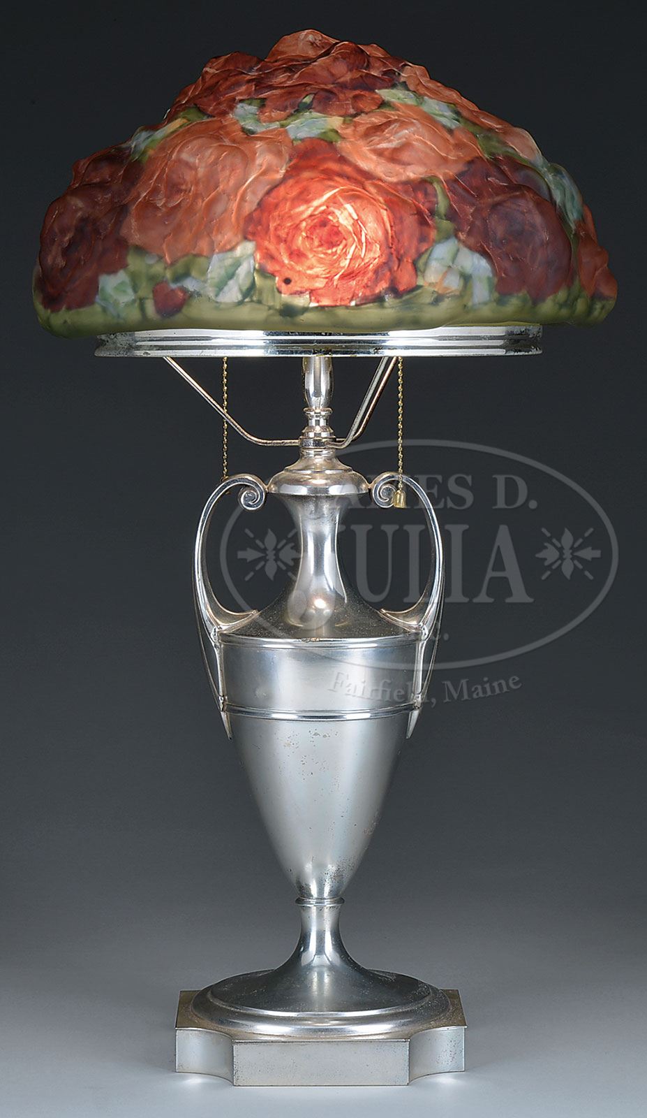 PAIRPOINT PUFFY ROSE TABLE LAMP.Pairpoint table lamp has a puffy shade with red roses against a shaded green leaf background. Roses are nicely detailed in shades of pink and red. Shade appears to have remnants of a gold signature but it is indiscernible. Shade rests on a silver plated urn shaped vase with 3 arm spider supporting the shade ring. Base is signed on the underside “Pairpoint” along with the Pairpoint logo “D3015 Made in U.S.A.”. SIZE: Shade: 13″ dia w/10″ fitter. Lamp: 23″ t. CONDITION: Shade has 2 very shallow flakes across the fitter rim and some tiny flea bites to the edge of the fitter, otherwise very good to excellent. Base has some small dents to edge of the shoulder, otherwise very good with only minor discoloration to plating. 5-69605 (6,000-9,000) – Lot 3353